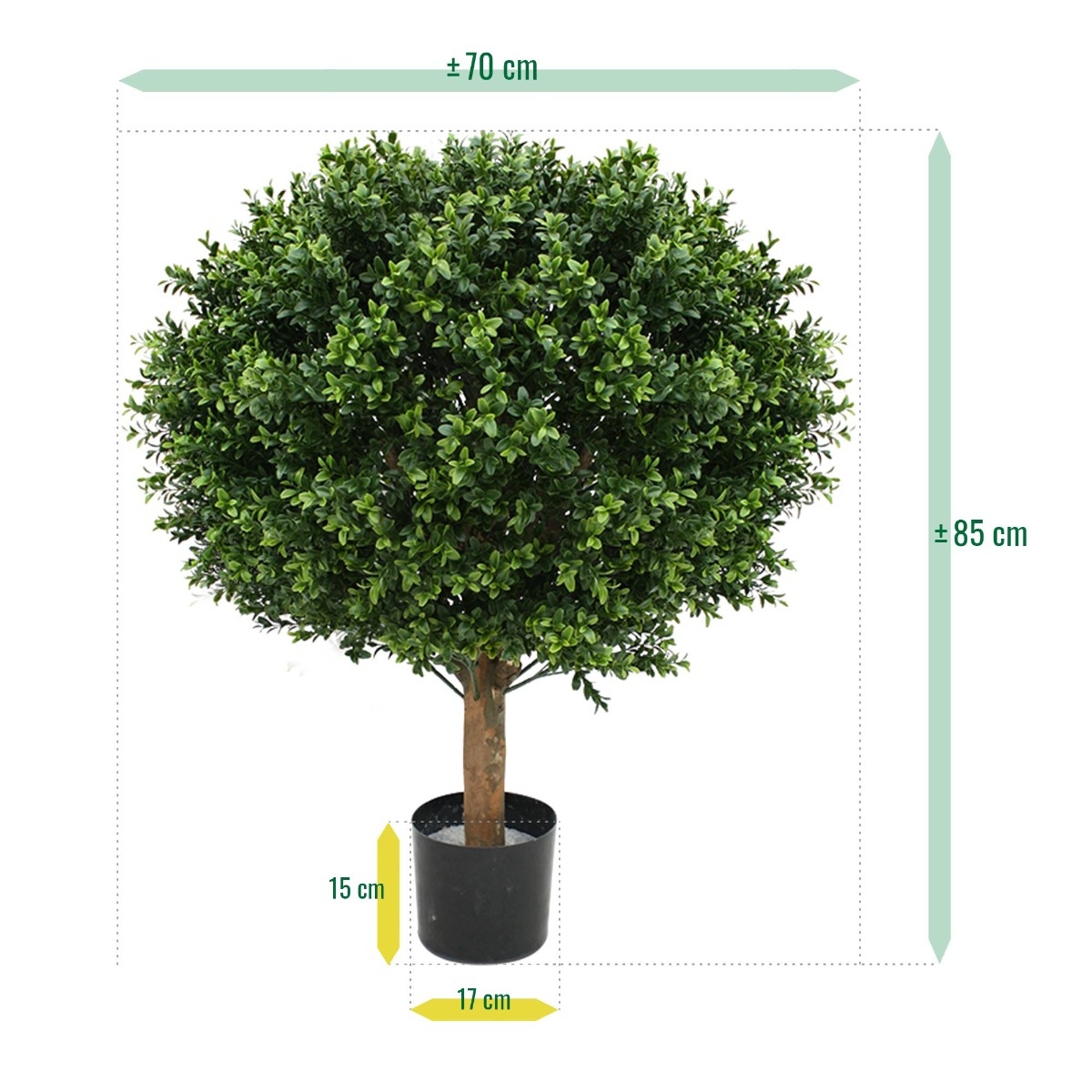 Il Buxus Bulb Deluxe 70 cm è realizzato in plastica di alta qualità, mentre il tronco è in vero legno. Pertanto, questo albero artificiale può essere collocato sia all'interno che all'esterno e fornire una bella decorazione. La versione rinnovata è, soprattutt