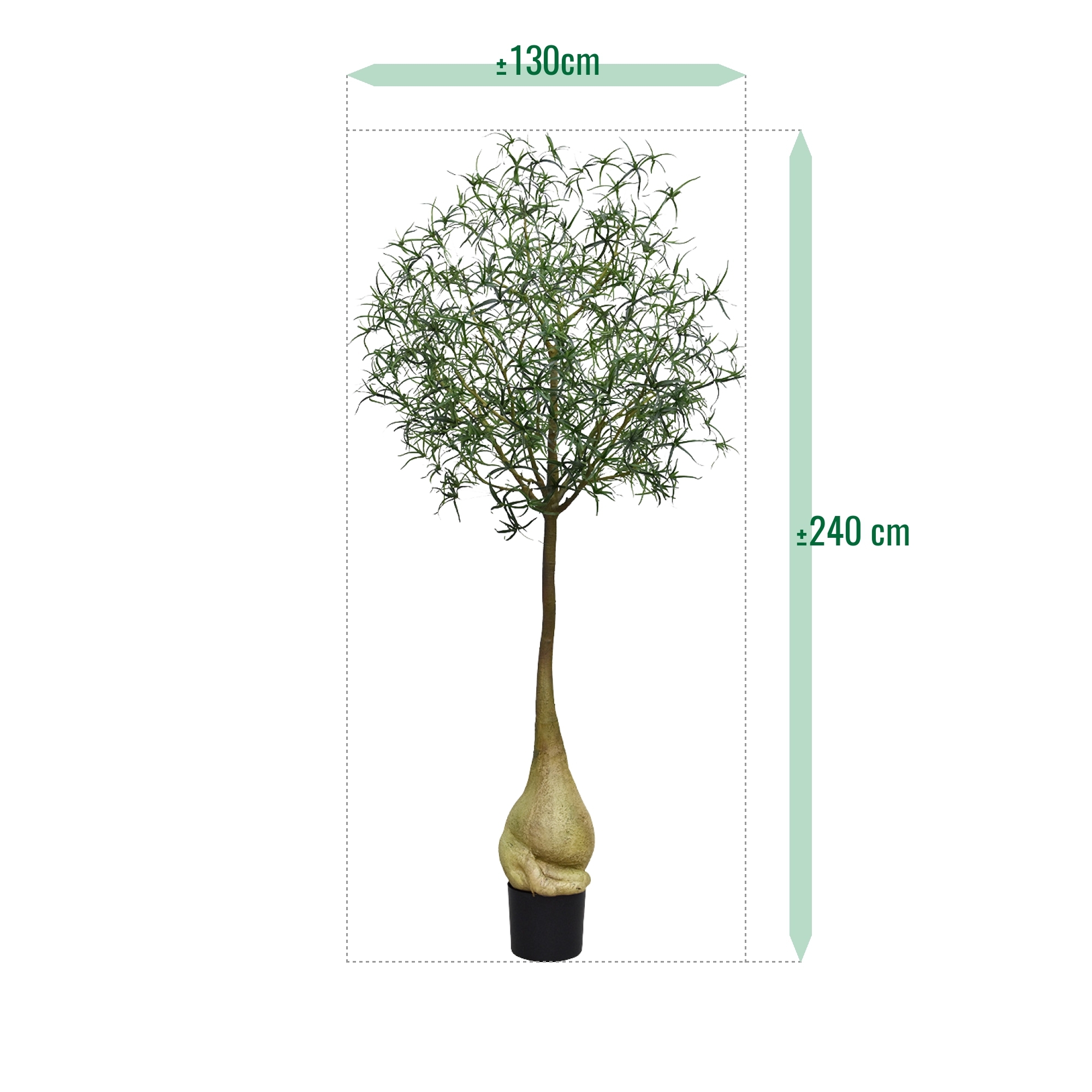 Il Brachychiton Bottle Albero Artificiale 240cm è un elemento decorativo imponente ed elegante che valorizza qualsiasi ambiente. Con un’altezza di 240 cm e una larghezza di 130 cm, questo albero artificiale porta un tocco naturale e raffinato a ogni spazio int