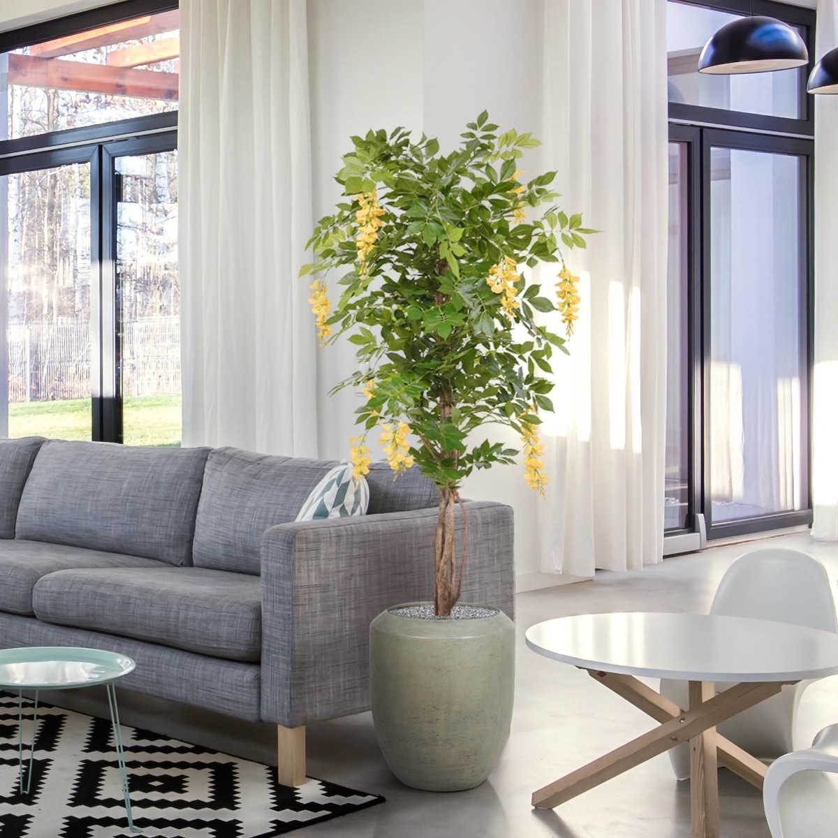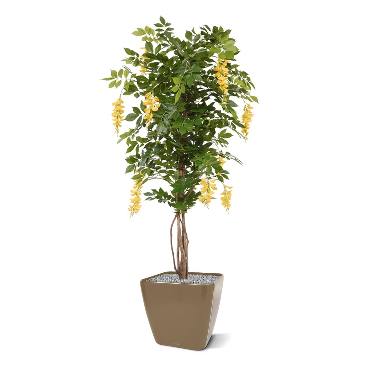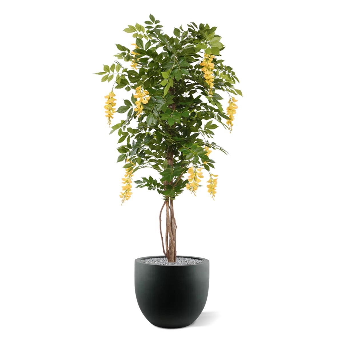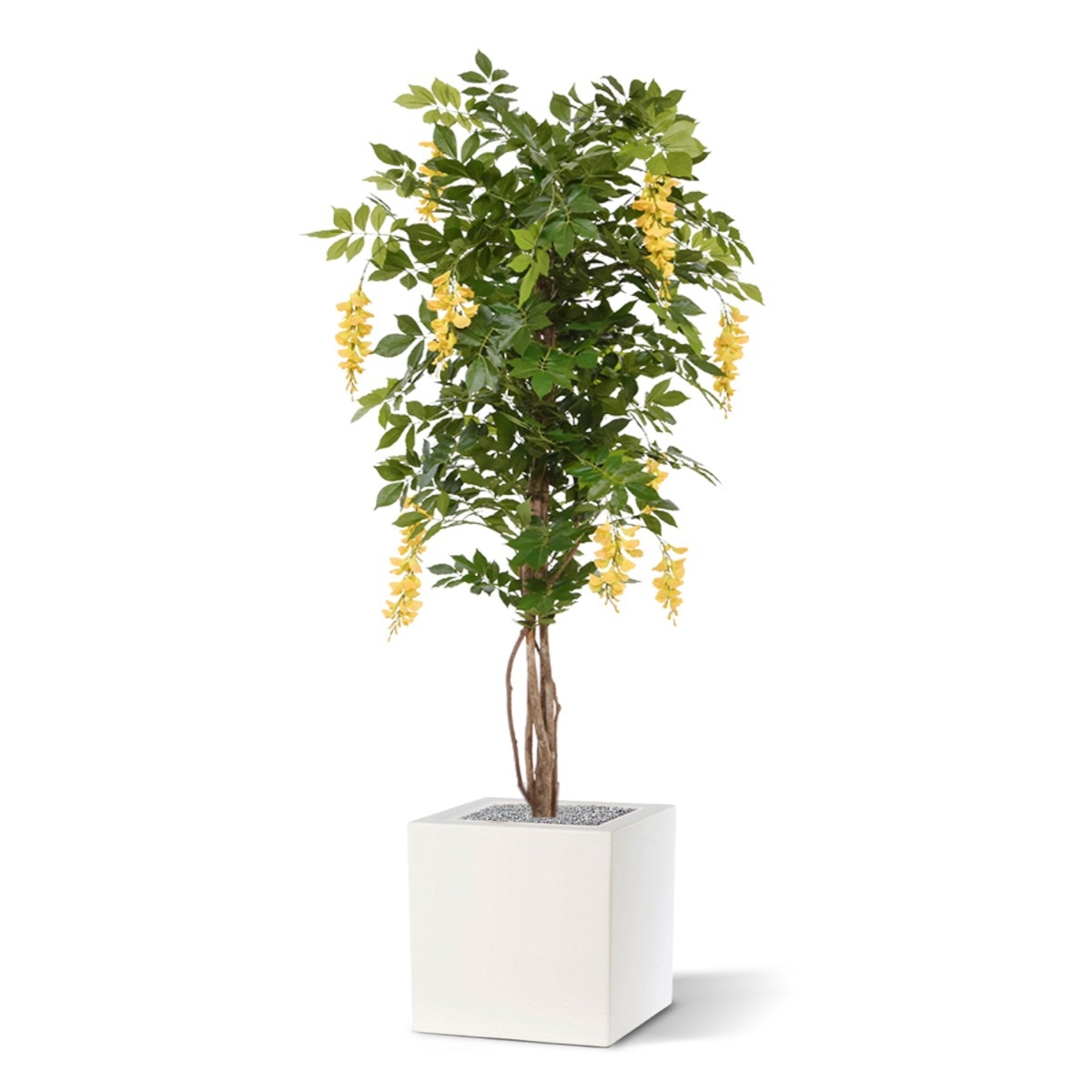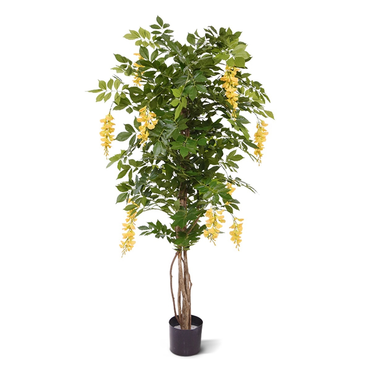 Questo albero artificiale Wisteria Deluxe fiorito è noto anche come Golden o Blue Rain. Ciò che molti non sanno è che il Glicine blu non deve essere per forza blu. Questo Glicine giallo ha steli multipli e robusti realizzati in vero legno e molti grappoli di f