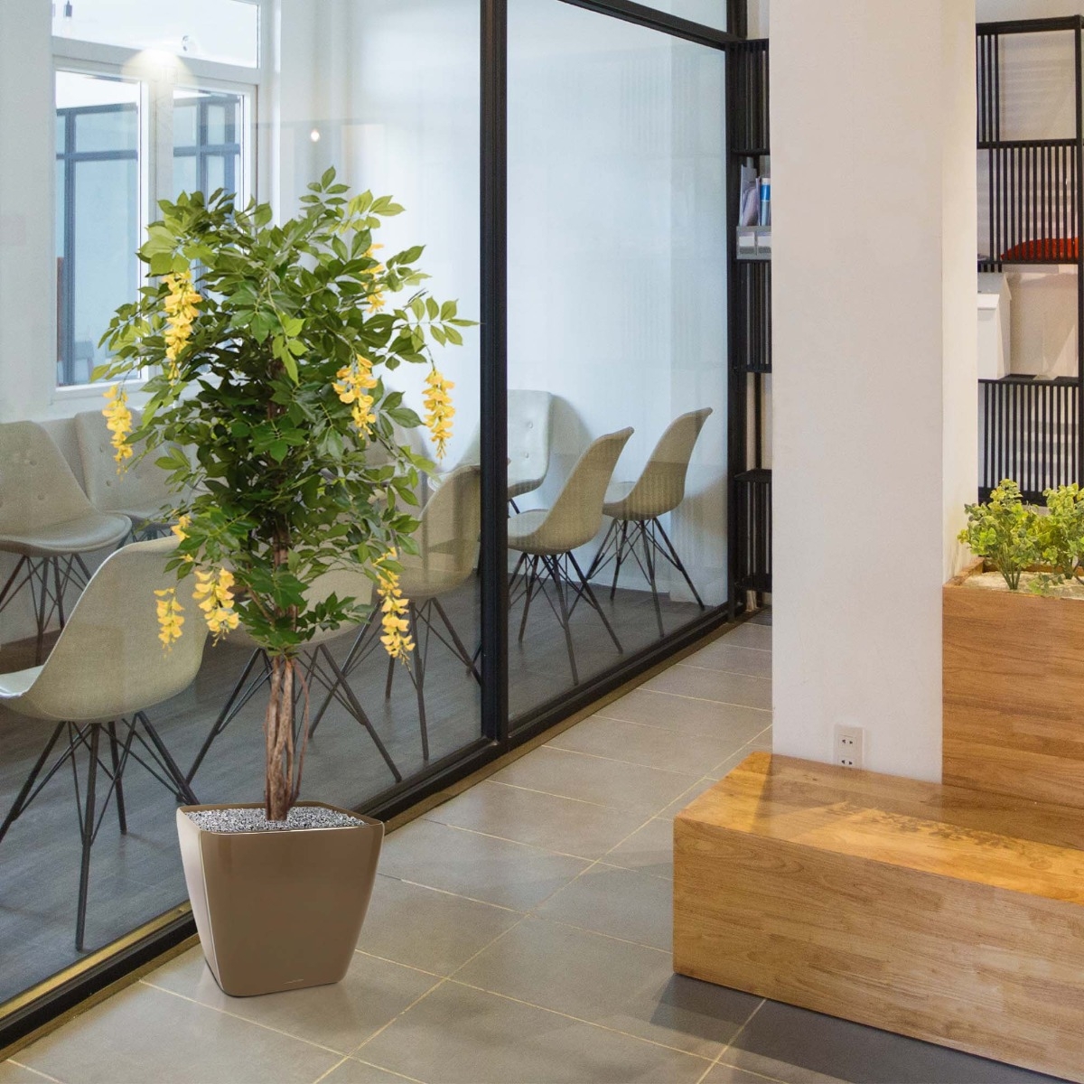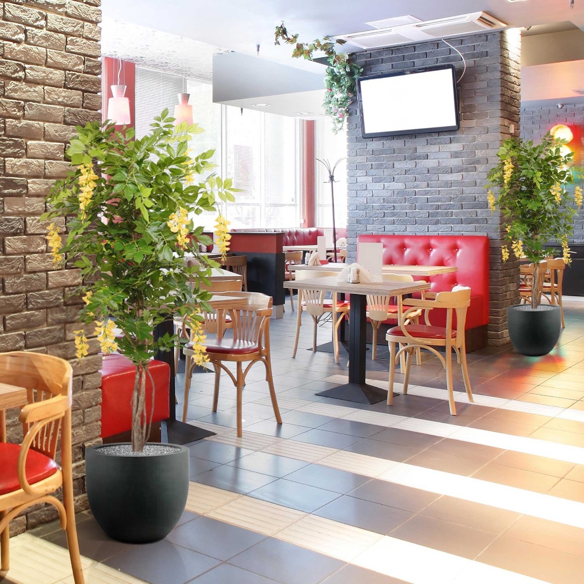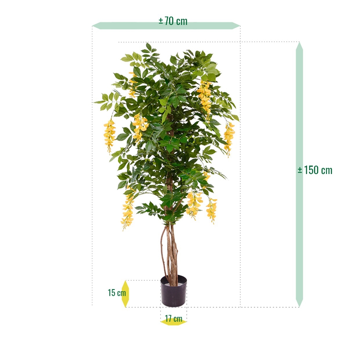 Questo Glicine giallo ha steli multipli e robusti realizzati in vero legno e molti grappoli di fiori gialli. È un albero artificiale colorato che illumina qualsiasi stanza. Il glicine può essere collocato in un giardino d'inverno o essere un elemento che attira l'attenzione in uno spazio aperto. Anche in ufficio o in locali di ristorazione, come un ristorante, l'albero sarà bellissimo.