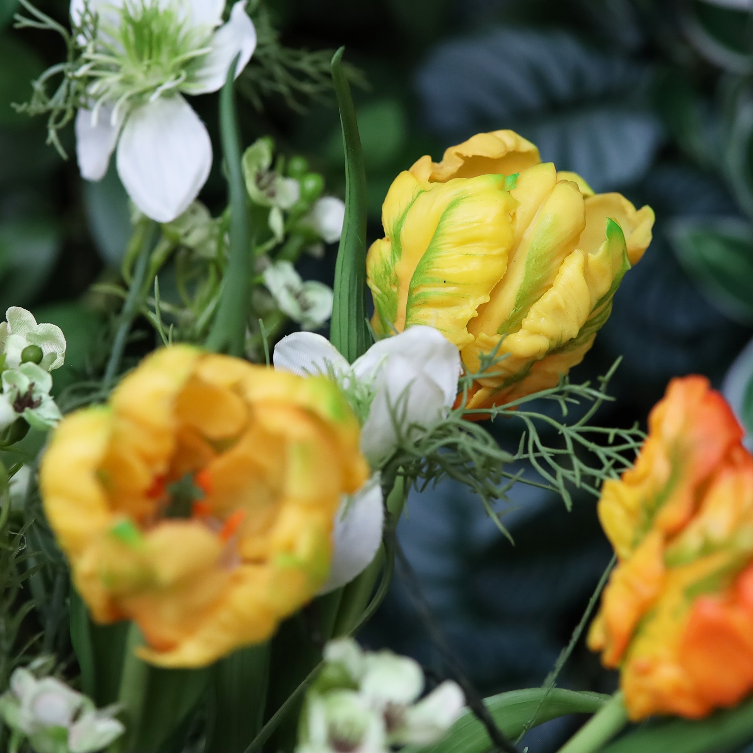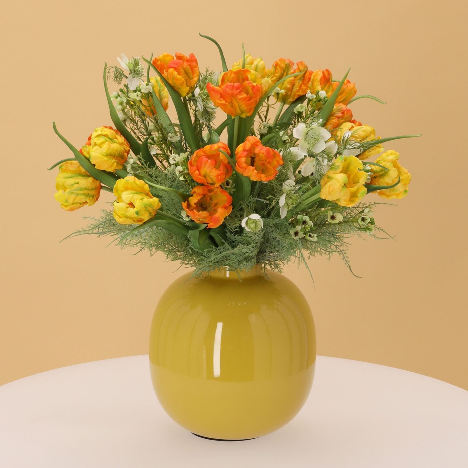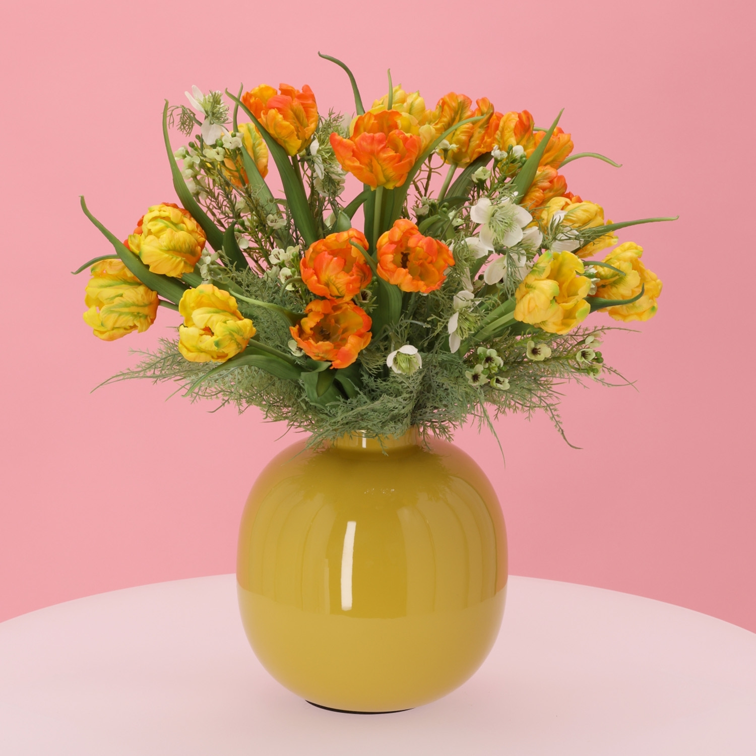 Il Mazzo di Fiori Artificiali Tessa Hillegom è una composizione fresca e vivace di fiori artificiali con un’altezza di 55 cm e una larghezza di 40 cm. Questo mazzo artificiale trasmette immediatamente calore ed energia grazie alla combinazione di tonalità gialle e arancioni. Nell’arrangiamento trovi tulipani pieni in giallo solare e arancione caldo, delicati rametti di waxflower verde fresco e sottili nigelle in una morbida tonalità crema. I rami leggeri di asparagus verde grigiastro aggiungono volume e un effetto naturale e arioso. Le linee slanciate dei tulipani donano a questo mazzo di fiori artificiali un aspetto dinamico, perfetto per un interno moderno, accogliente o in stile country.