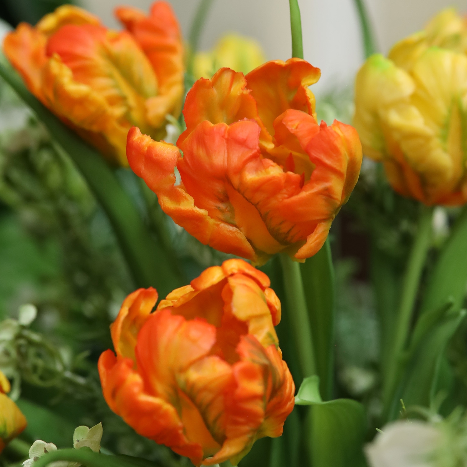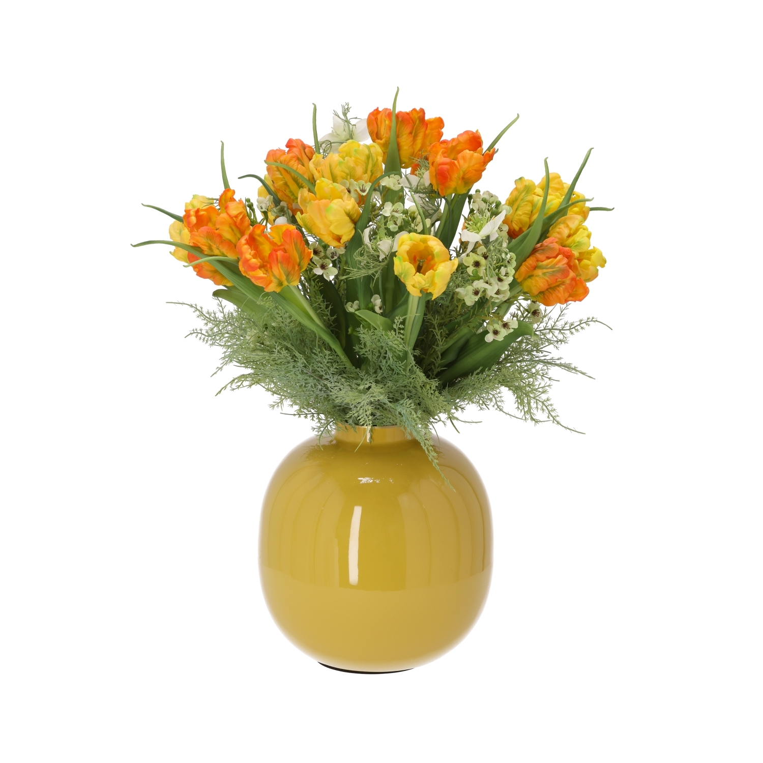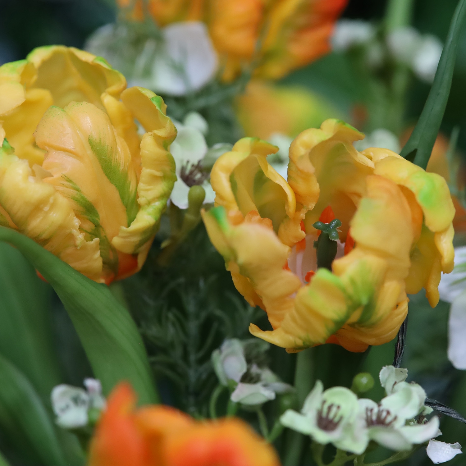 Il Mazzo di Fiori Artificiali Tessa Hillegom è una composizione fresca e vivace di fiori artificiali con un’altezza di 55 cm e una larghezza di 40 cm. Questo mazzo artificiale trasmette immediatamente calore ed energia grazie alla combinazione di tonalità gialle e arancioni. Nell’arrangiamento trovi tulipani pieni in giallo solare e arancione caldo, delicati rametti di waxflower verde fresco e sottili nigelle in una morbida tonalità crema. I rami leggeri di asparagus verde grigiastro aggiungono volume e un effetto naturale e arioso. Le linee slanciate dei tulipani donano a questo mazzo di fiori artificiali un aspetto dinamico, perfetto per un interno moderno, accogliente o in stile country.