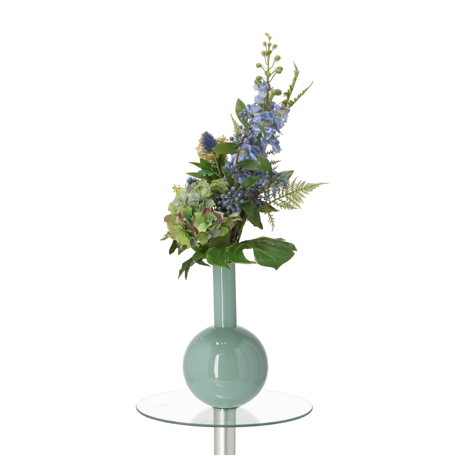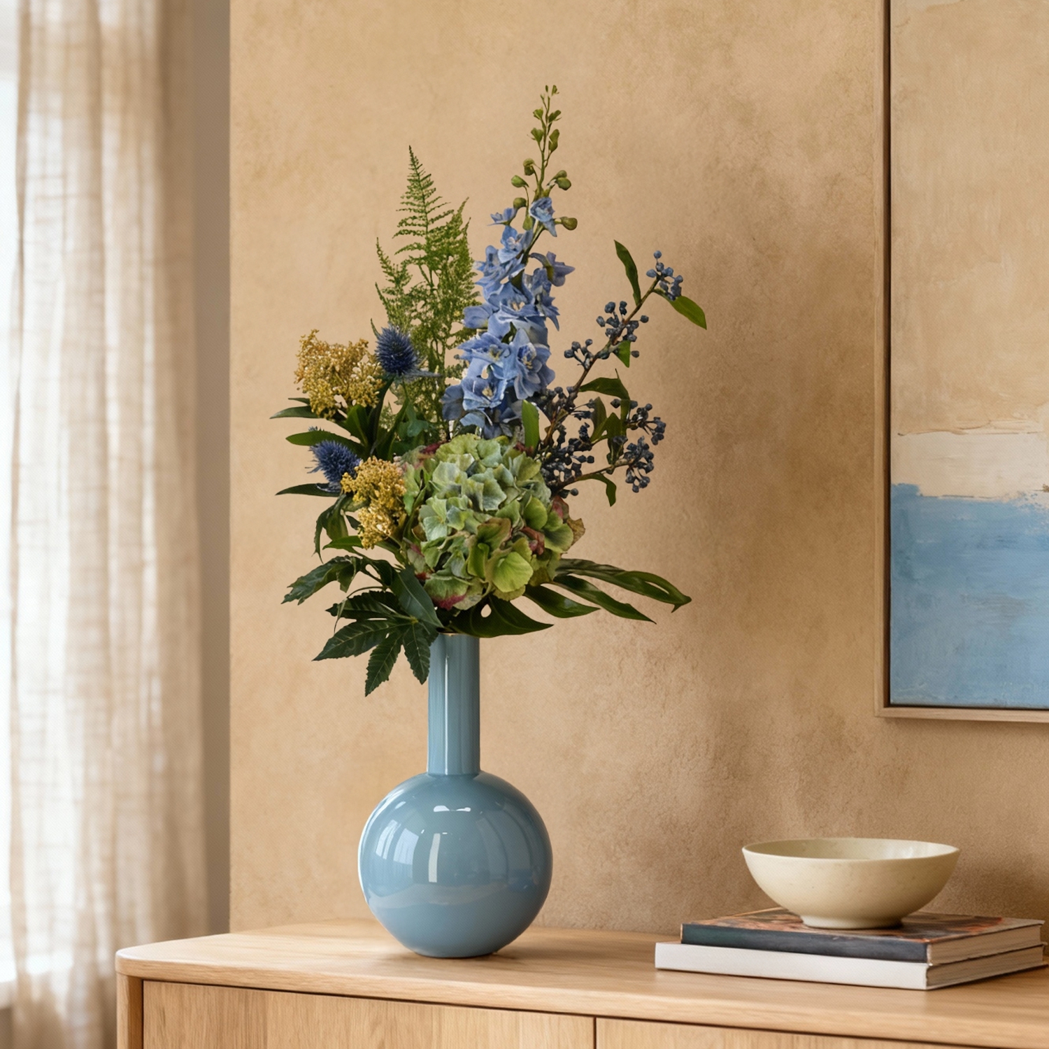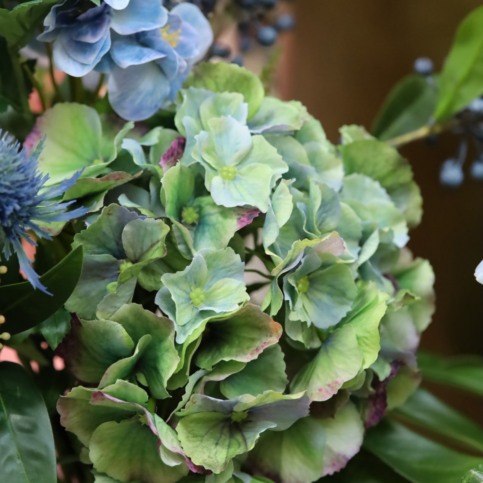 Il Bouquet Artificiale Legato a Mano Viola Stockholm - Blu è una composizione lussuosa ed elegante di fiori artificiali, perfetta per qualsiasi ambiente della tua casa o ufficio. Con un'altezza di 80 cm e una larghezza di 40 cm, questo bouquet blu aggiunge un tocco fresco e rilassante. Il bouquet include una bellissima miscela di fiori e rami, come il Ramo di Foglia Artificiale di Monstera, Fiore Artificiale di Ortensia, Ramo Artificiale di Aralia e Fiore Artificiale di Delfinio. Questi fiori sono in diverse sfumature di blu, combinati con accenti verdi, creando una composizione raffinata.