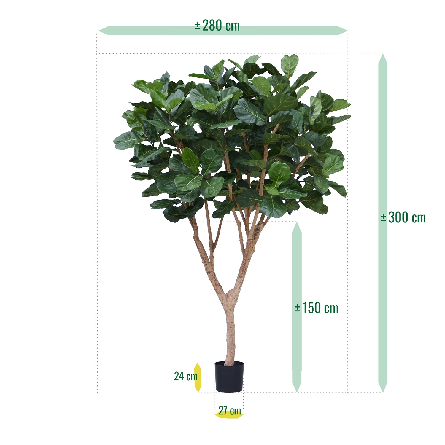Scopri lo splendore lussureggiante del nostro albero artificiale Ficus Lyrata XL Deluxe, un'aggiunta maestosa a qualsiasi spazio con la sua impressionante altezza di 300 cm e la lussureggiante diffusione di 280 cm. Questo albero artificiale incarna l'opulenza