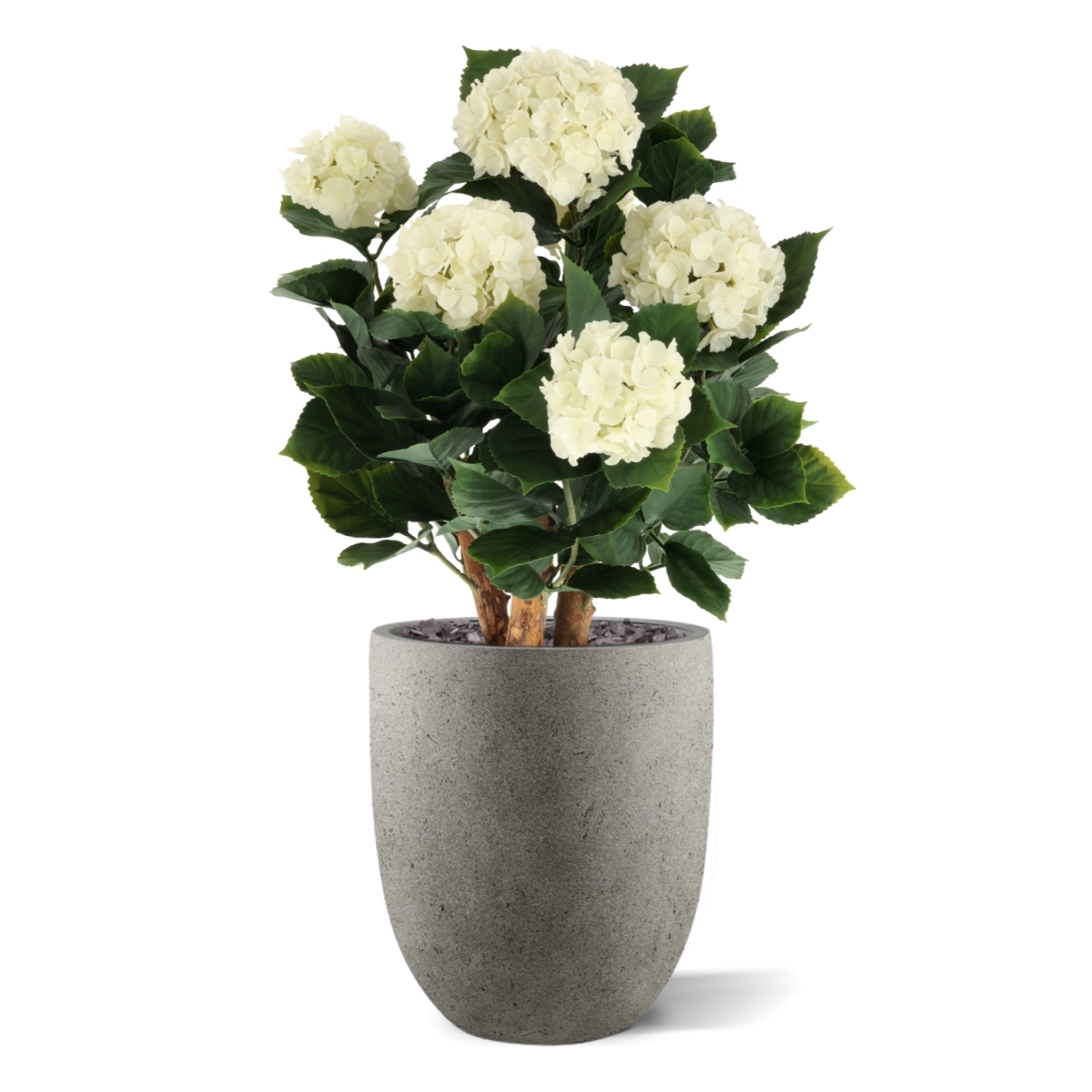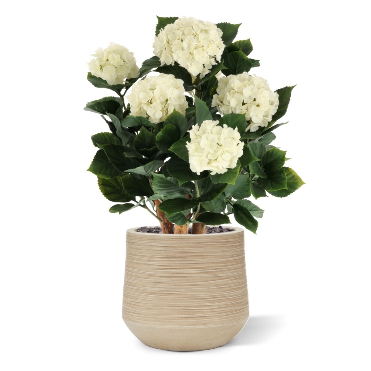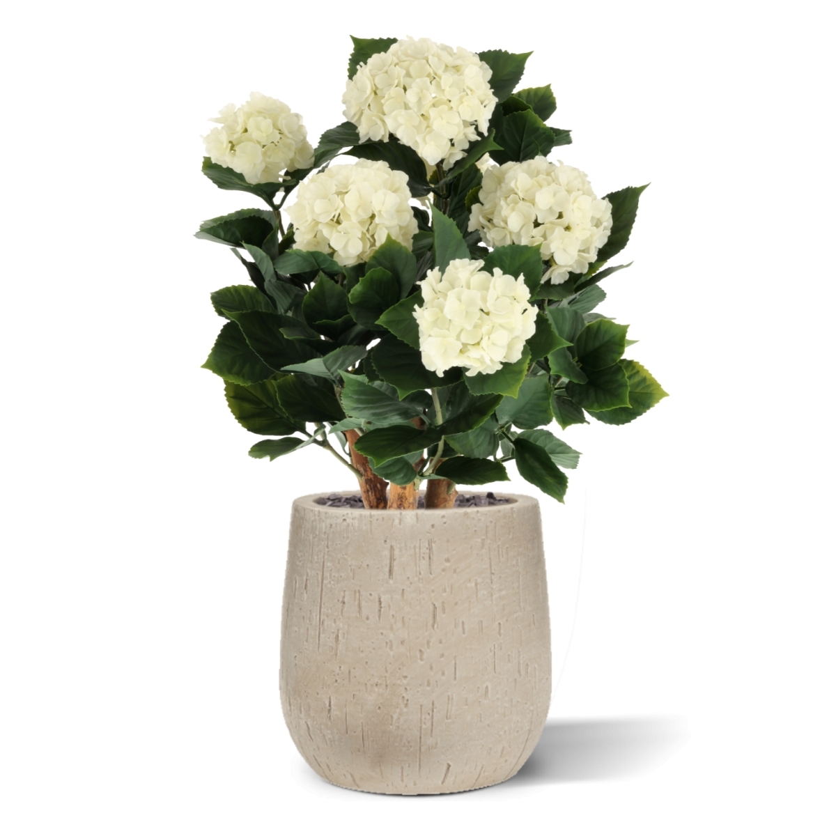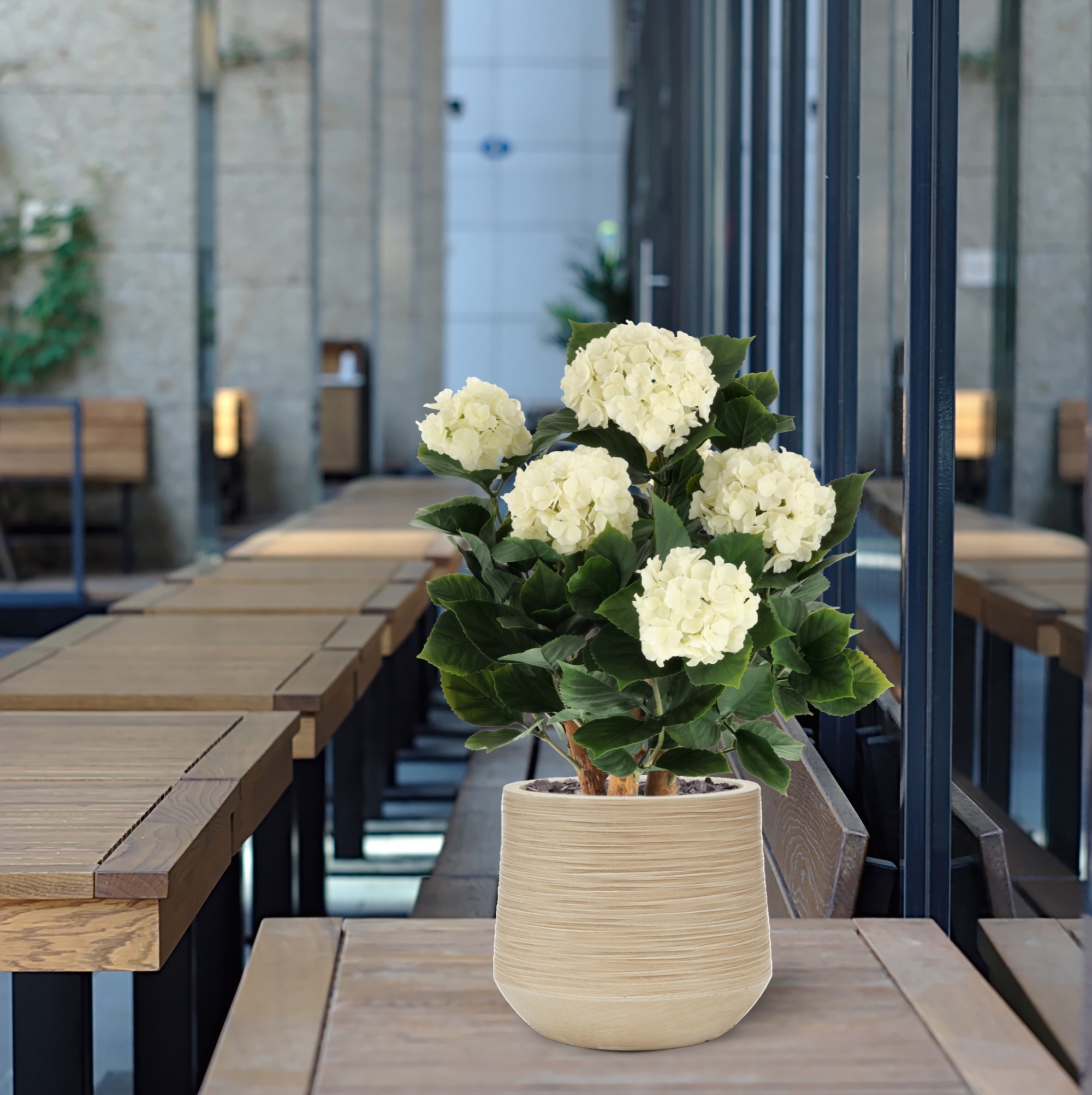 La Hortensia UV Pianta Artificiale Deluxe 65cm Crema aggiunge istantaneamente un'atmosfera elegante e botanica a qualsiasi spazio esterno, senza necessità di manutenzione. Questo design esclusivo combina tre tronchi in legno vero con foglie realistiche e sei s