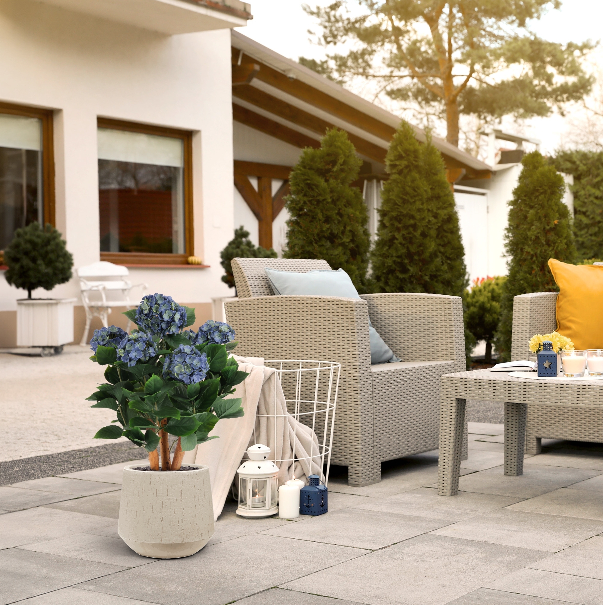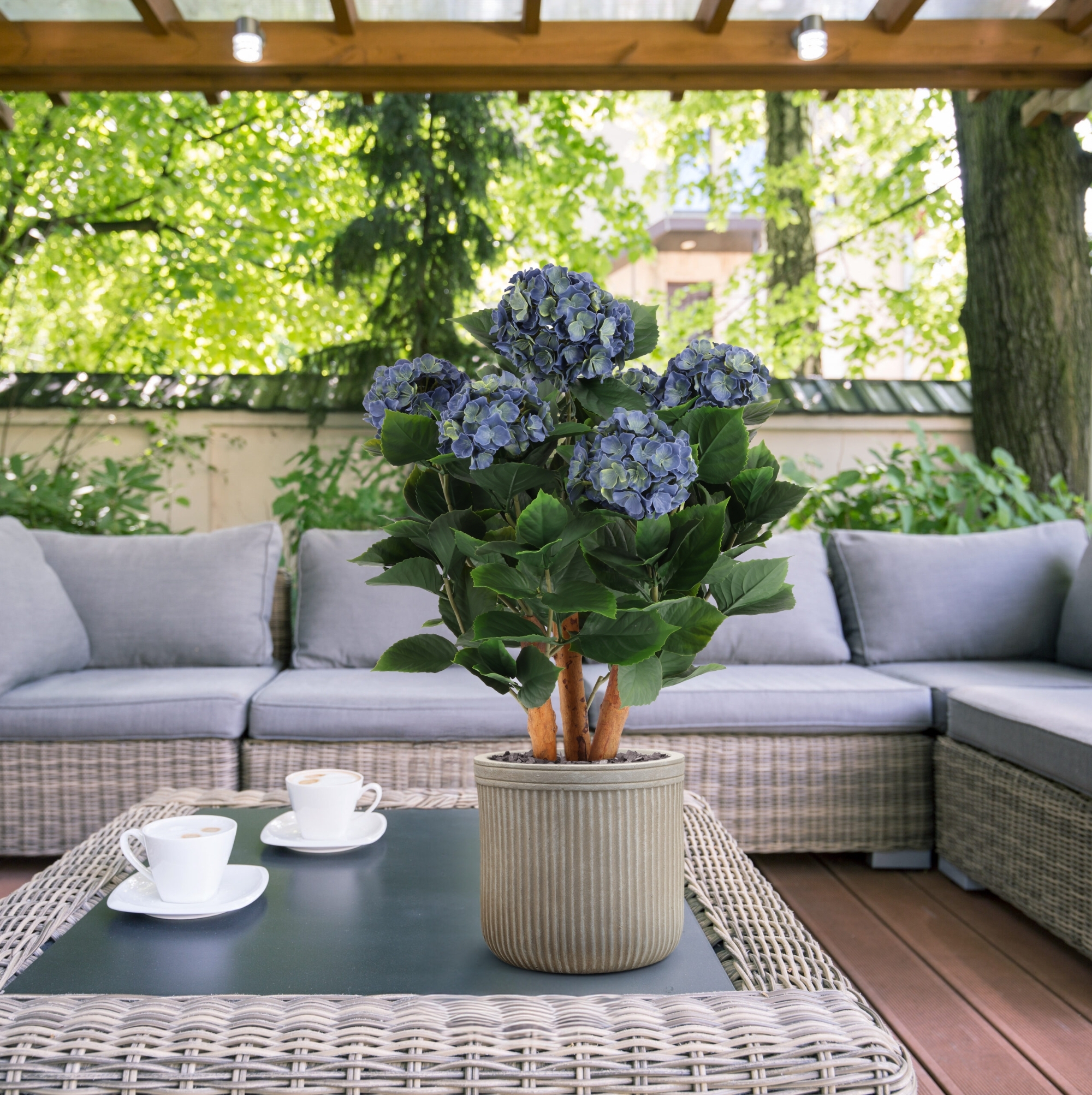 La Hortensia UV Pianta Artificiale Deluxe 65cm aggiunge istantaneamente un'atmosfera elegante e botanica a qualsiasi spazio esterno, senza necessità di manutenzione. Questo design esclusivo combina tre tronchi in legno vero con foglie realistiche e sei splendide sfere floreali in un'elegante tonalità Blu. Grazie ai dettagli raffinati e alle sottili variazioni di colore, questa pianta artificiale ha un aspetto naturale e realistico, rendendola quasi indistinguibile da una vera ortensia.