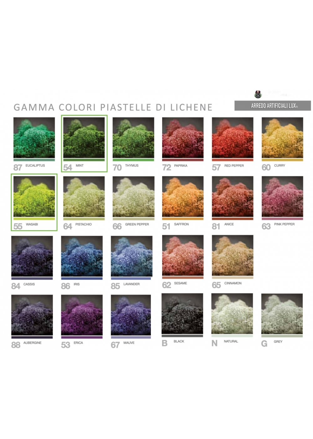 Pulizia delle pareti di Lichene stabilizzato: Non necessitano di irrigazione, di luce o temperature particolari in quanto vivono dell'umidità presente nei locali. È consigliata una semplice spolverizzazione per conservare la loro freschezza. Quindi potete posarli in qualsiasi ambiante anche privo di luce.