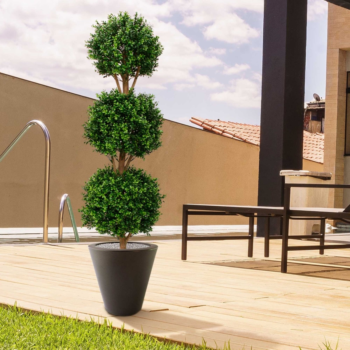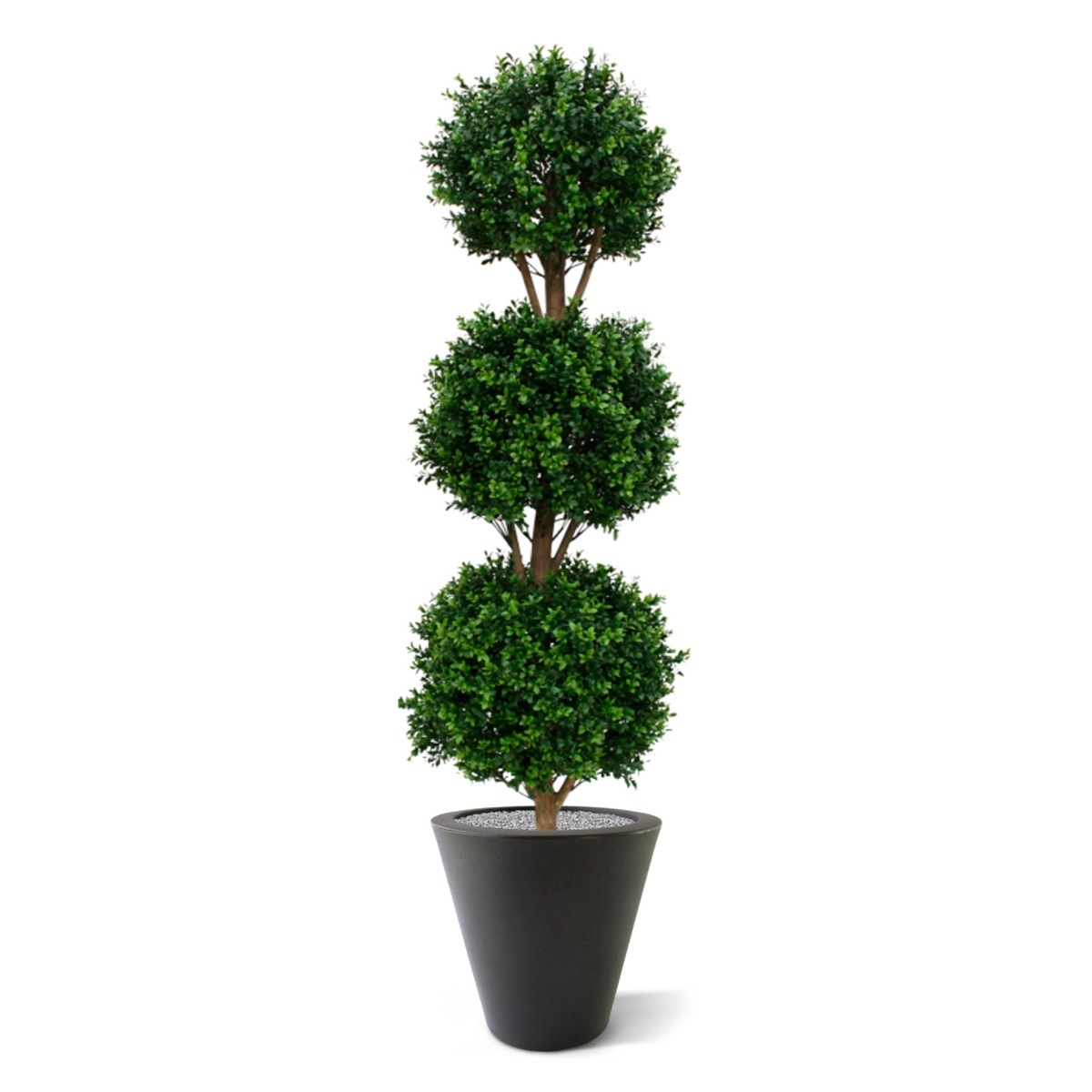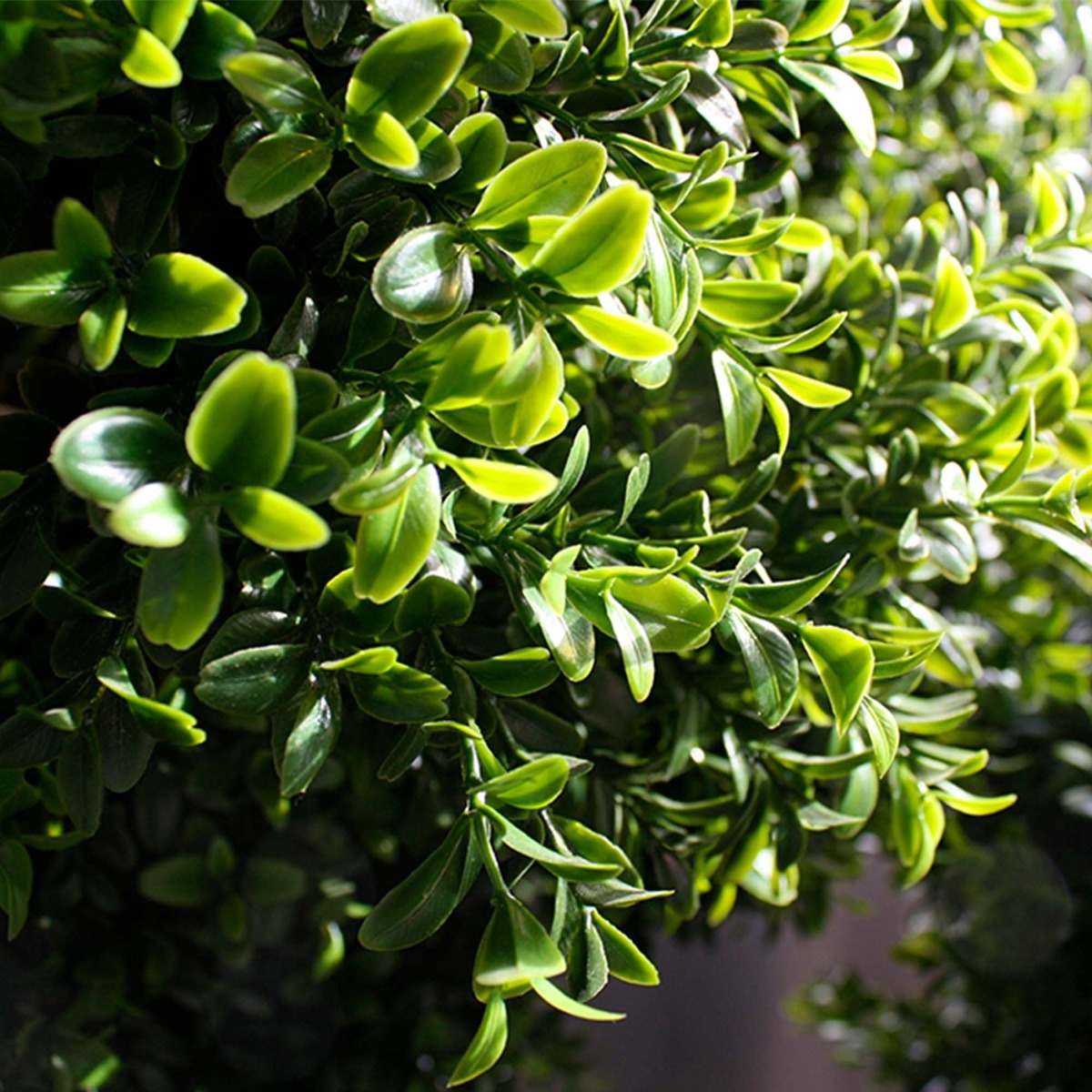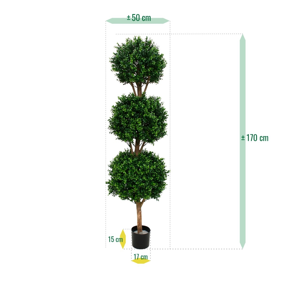 Il Buxus artificiale, resistente ai raggi UV, è realizzato in plastica PVC di qualità, che rende le lampadine adatte sia all'interno che all'esterno. I 3 bulbi di Buxus dall'aspetto naturale, su un tronco di vero legno, rendono questa versione particolarmente
