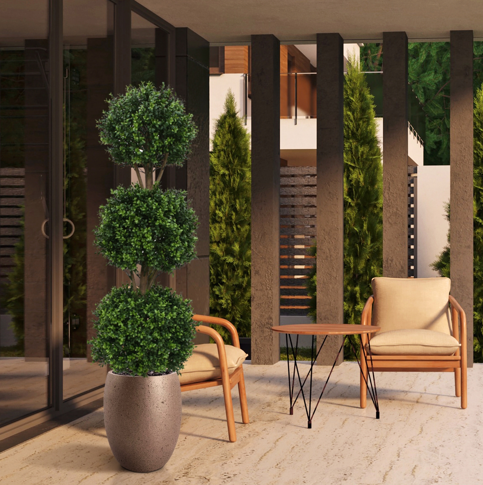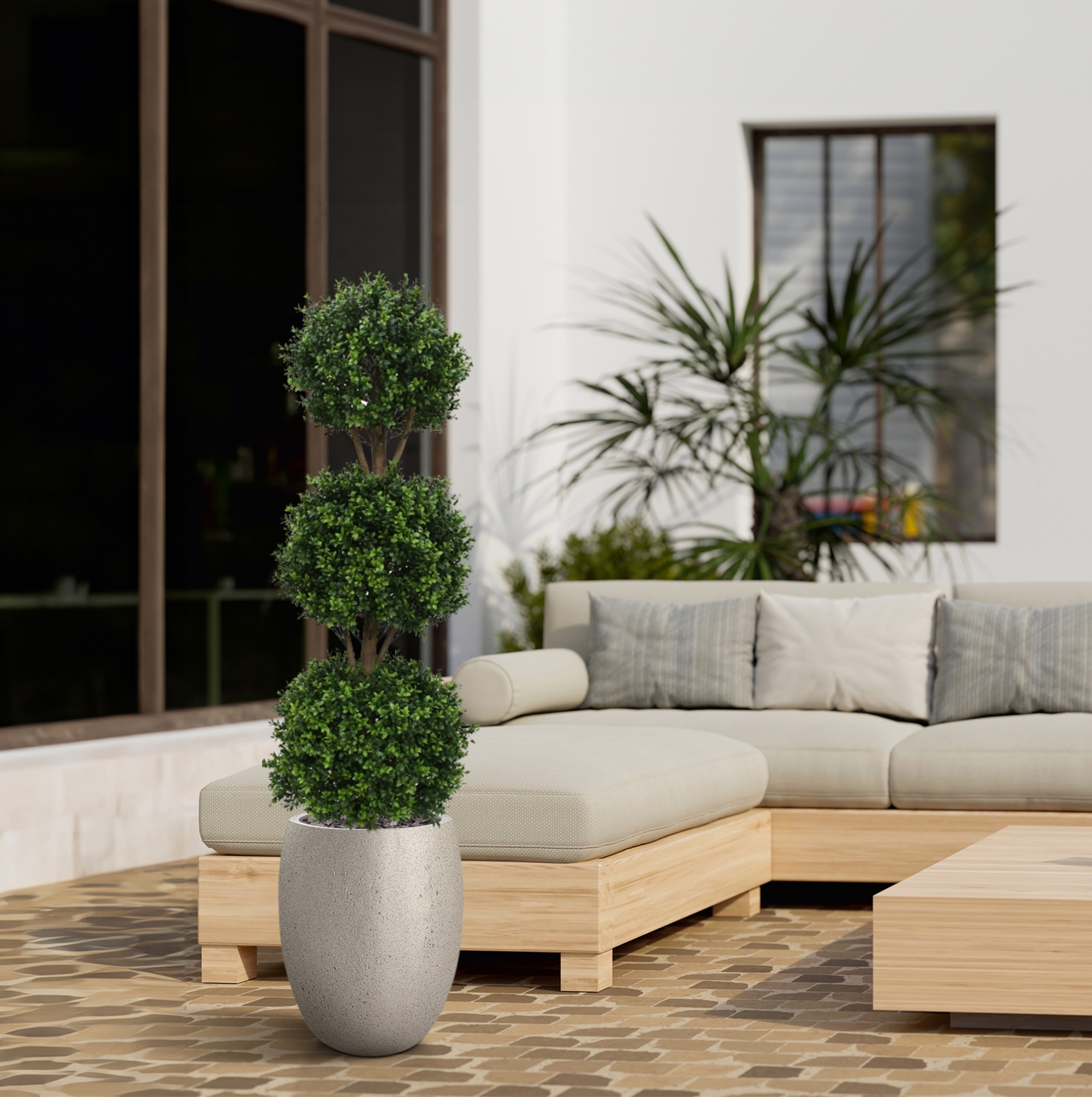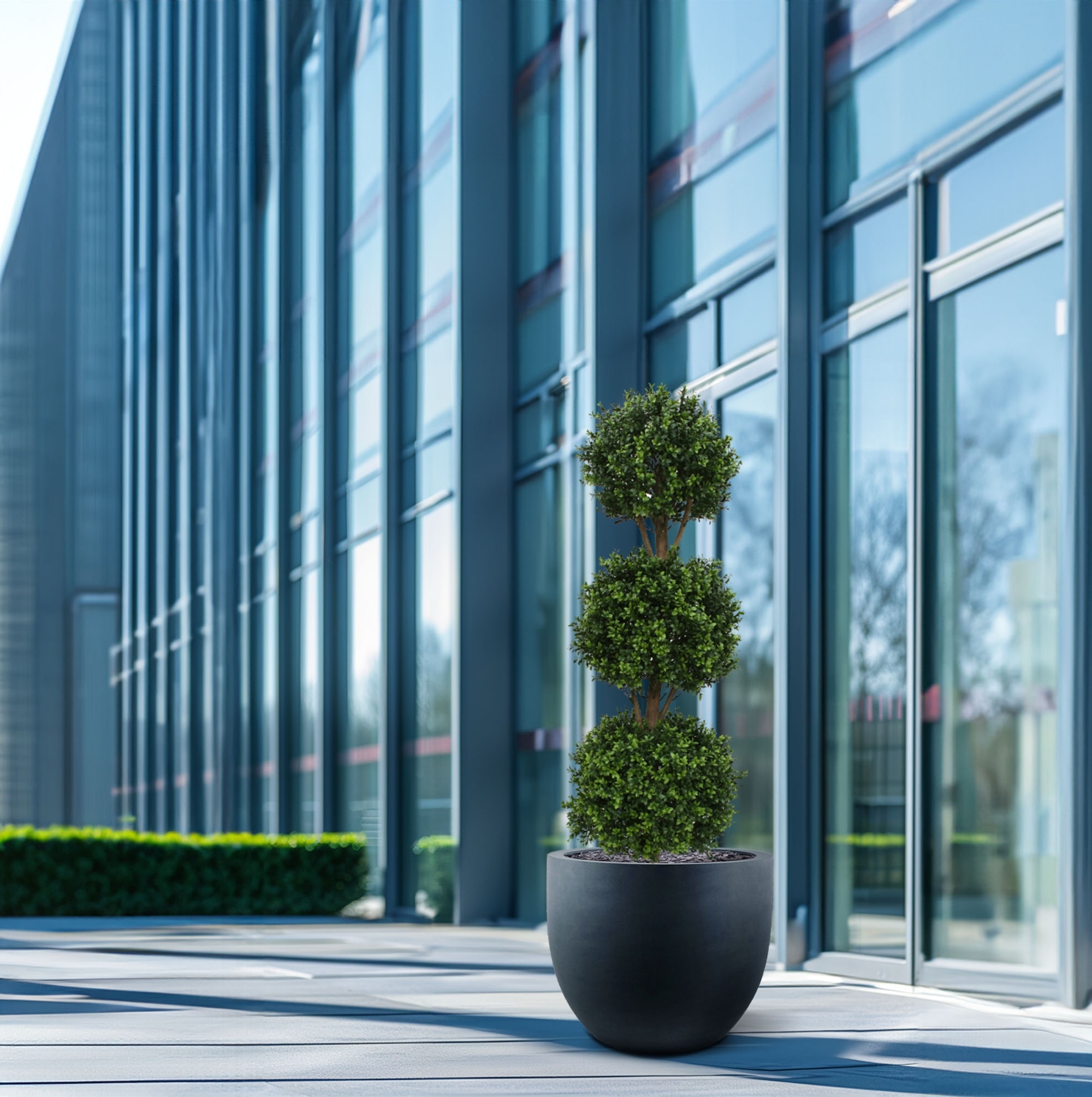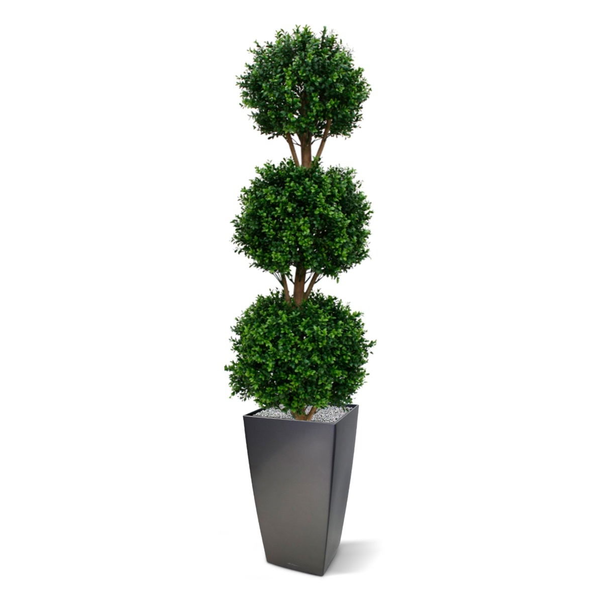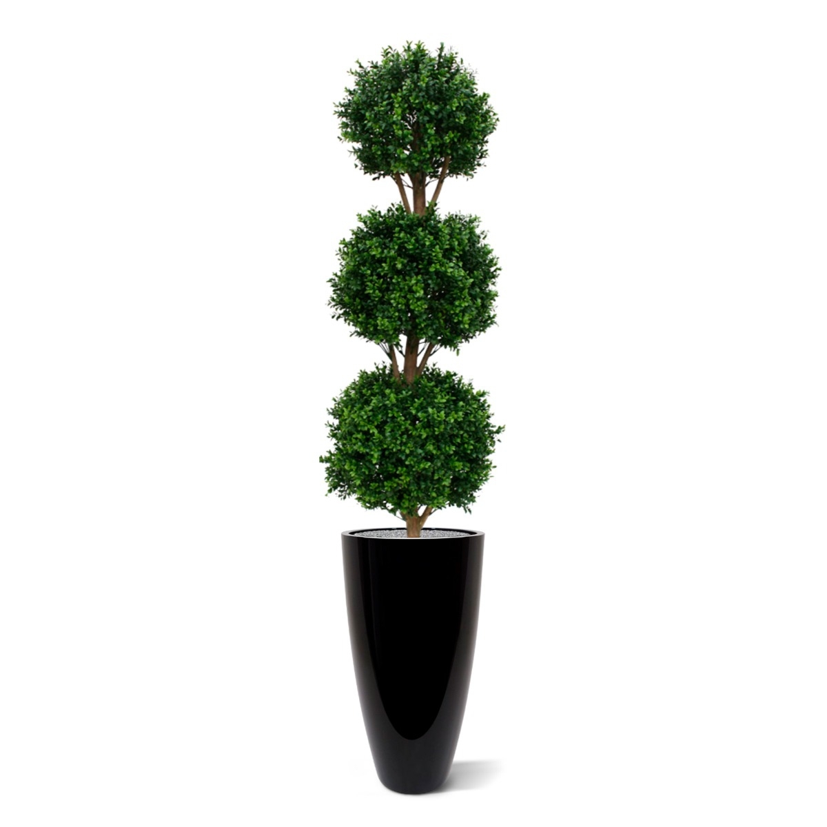 Il Buxus artificiale, resistente ai raggi UV, è realizzato in plastica PVC di qualità, che rende le lampadine adatte sia all'interno che all'esterno. I 3 bulbi di Buxus dall'aspetto naturale, su un tronco di vero legno, rendono questa versione particolarmente