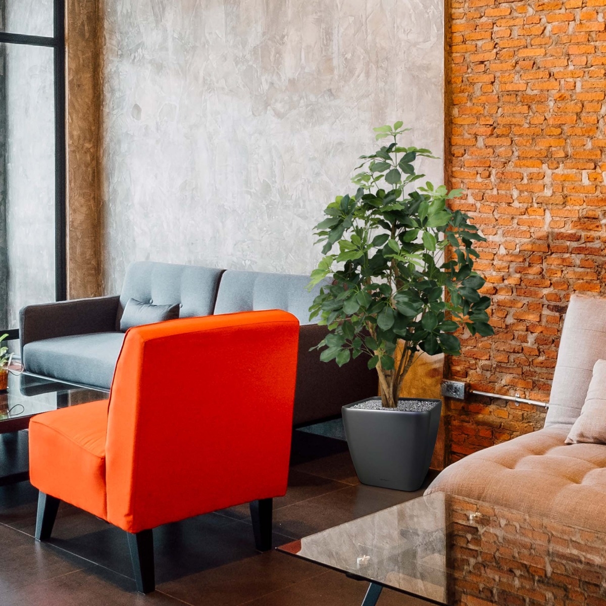 Questa Schefflera Exotica ignifuga è il modello completamente rinnovato della famiglia Schefflera. La forma migliorata delle foglie, combinata con la bella struttura degli steli in vero legno, offre una pianta artificiale dall'aspetto fresco, che difficilmente