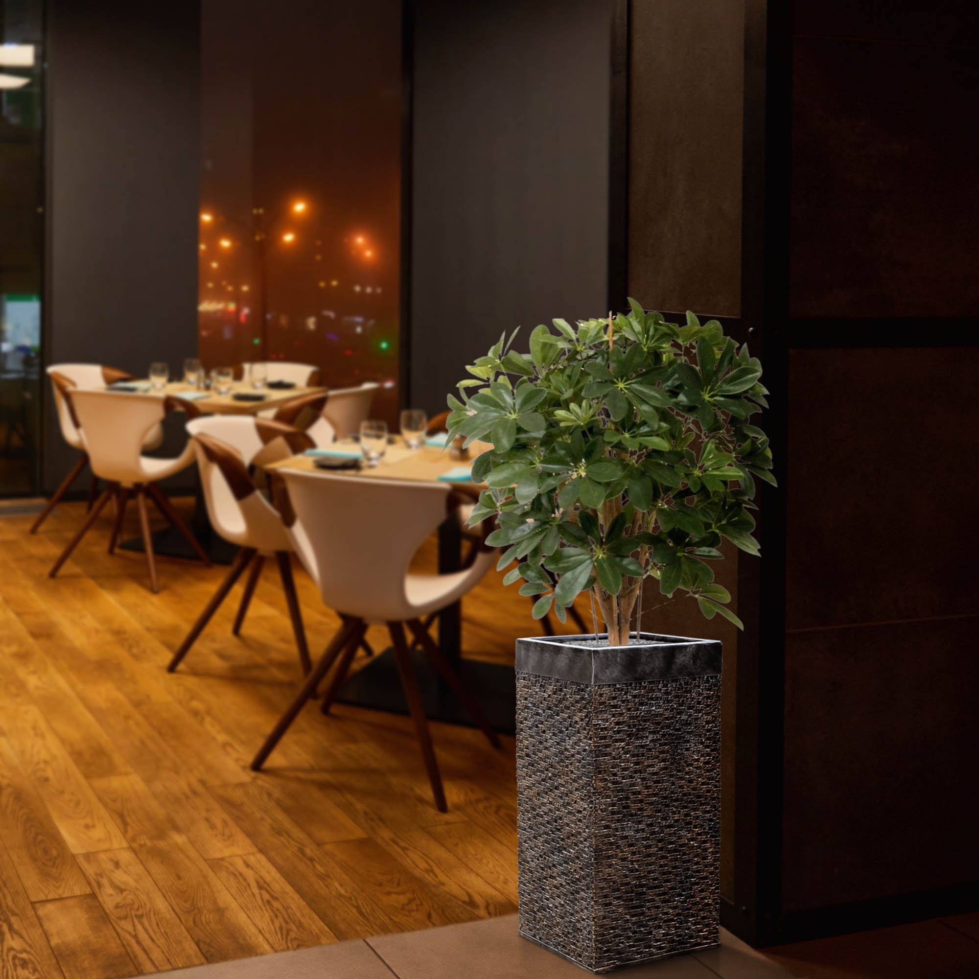 Bellissima copia di una pianta artificiale di Schefflera, con dimensioni ideali per l'uso in uffici, catering o semplicemente per il salotto. La Schefflera artificiale in seta è alta 80 cm e ben riempita di belle foglie verde intenso. La pianta è anche molto a