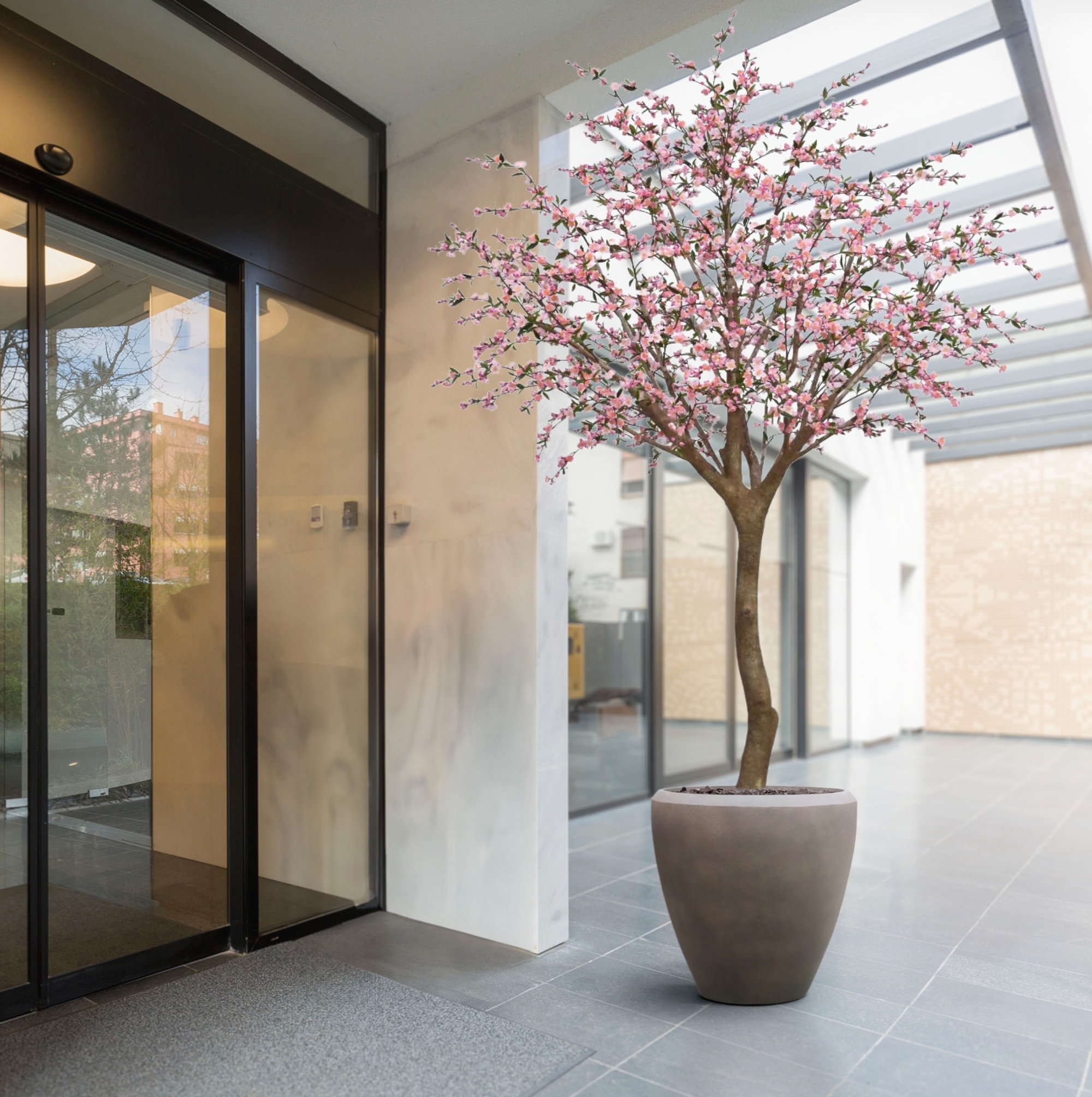 L'albero di fiori artificiale ha un tronco in legno naturale.