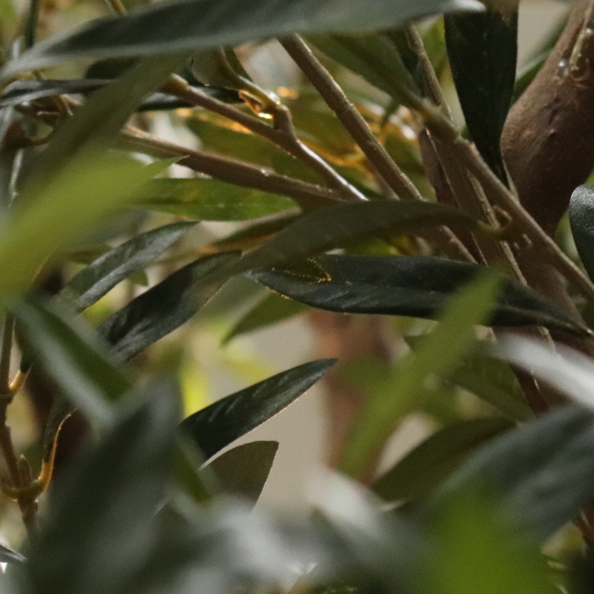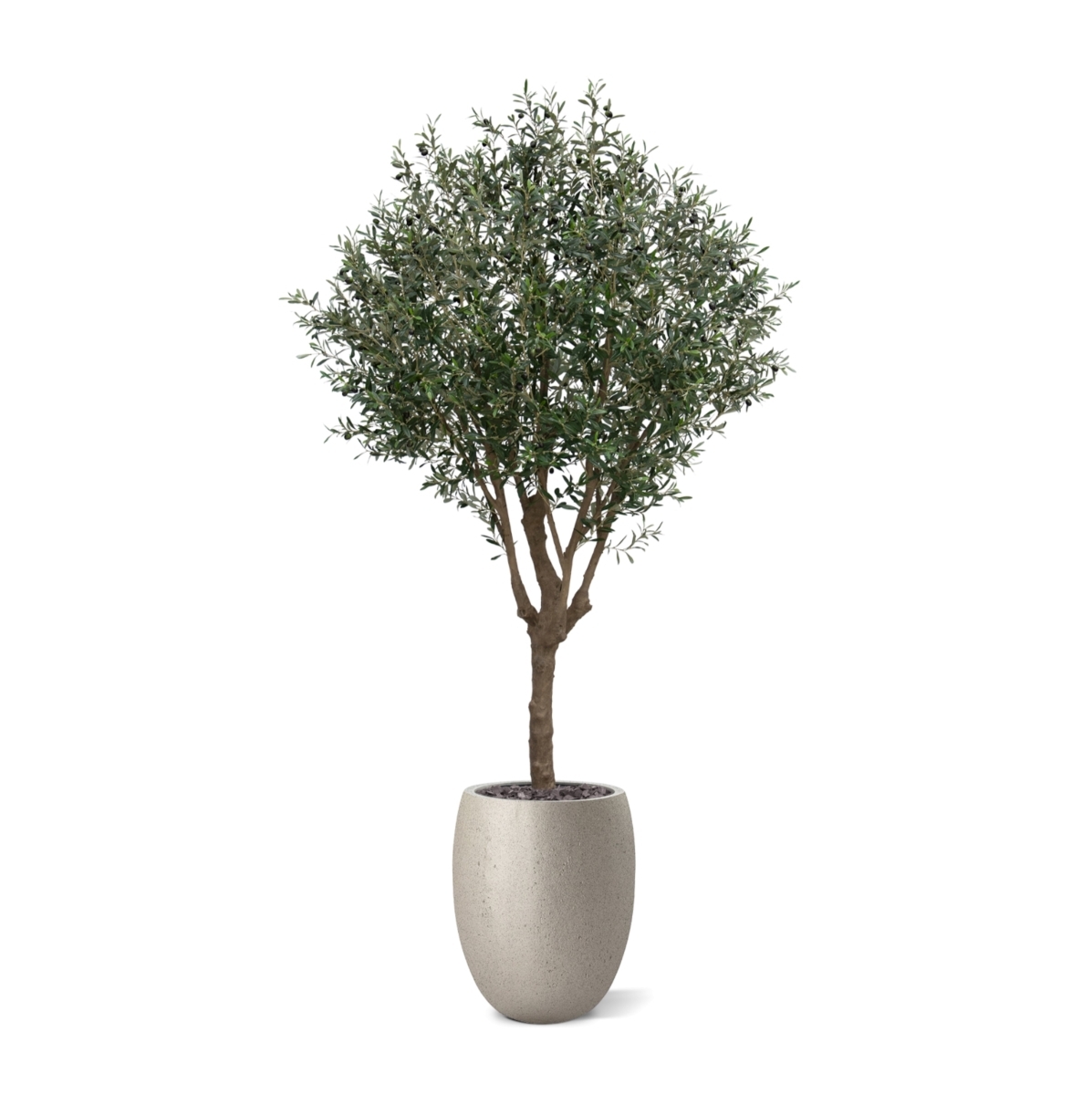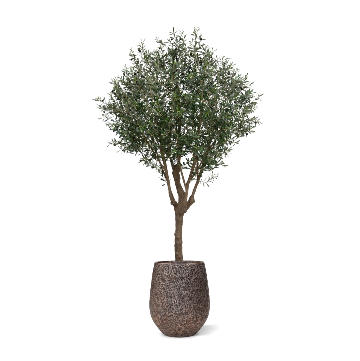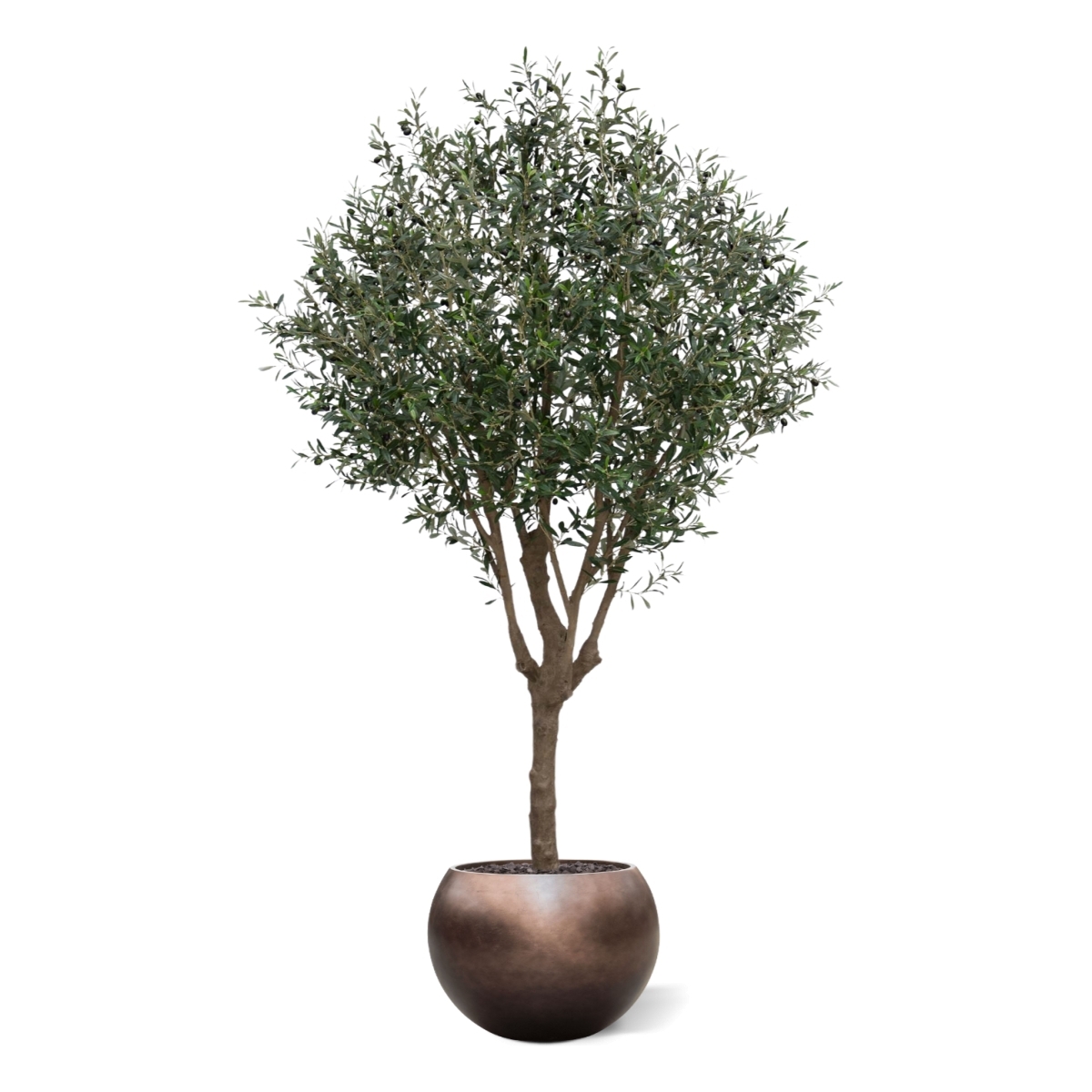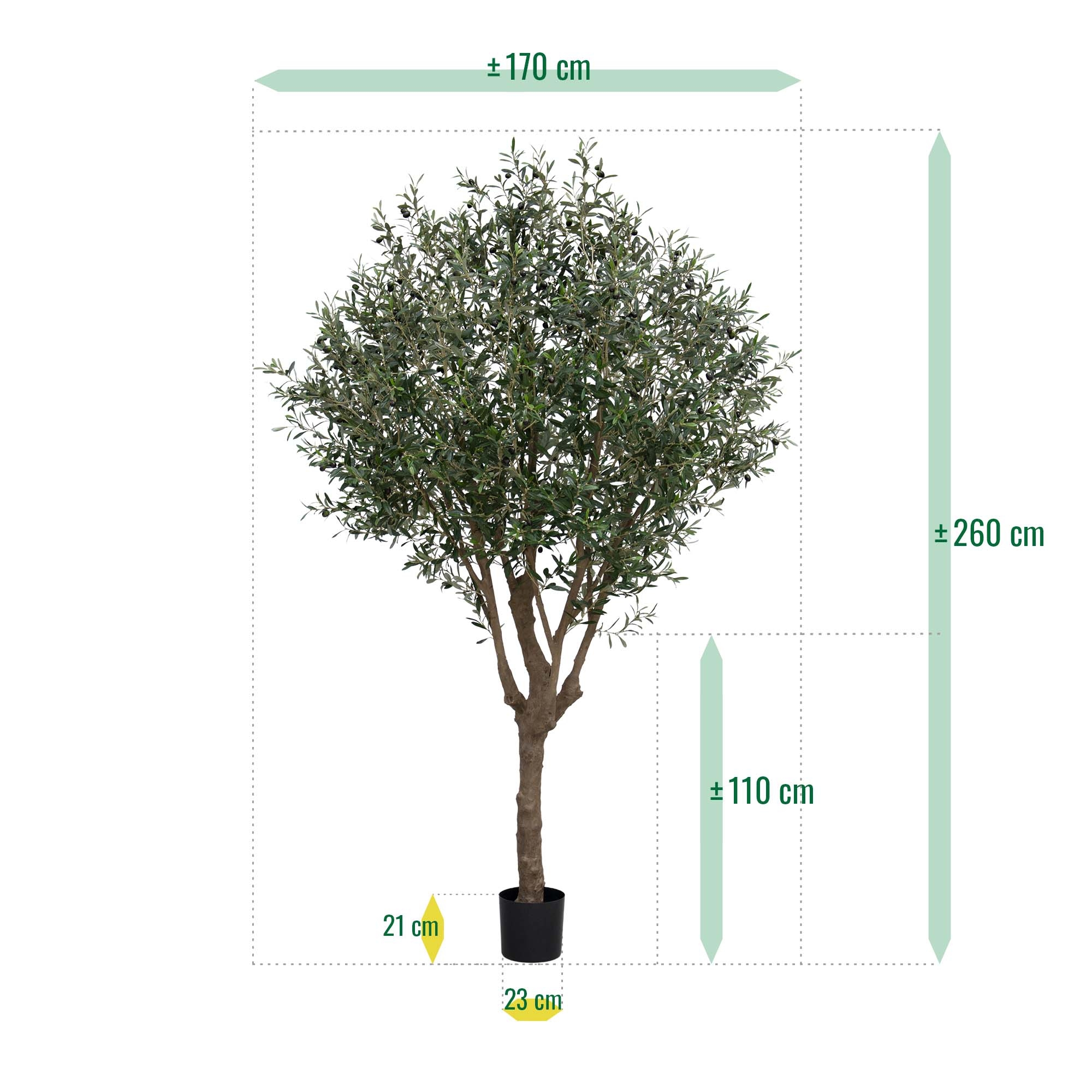L'albero artificiale di ulivo XL ha un ricco numero di foglie, rami potenti e robusti e olive artificiali che pendono con grazia dai rami. Le foglie strette ed eleganti rendono l'albero artificiale elegante. L'albero artificiale è alto 250 cm, ha un tronco artificiale realistico e viene fornito di serie in un vaso interno di plastica nero, come mostrato nell'immagine.