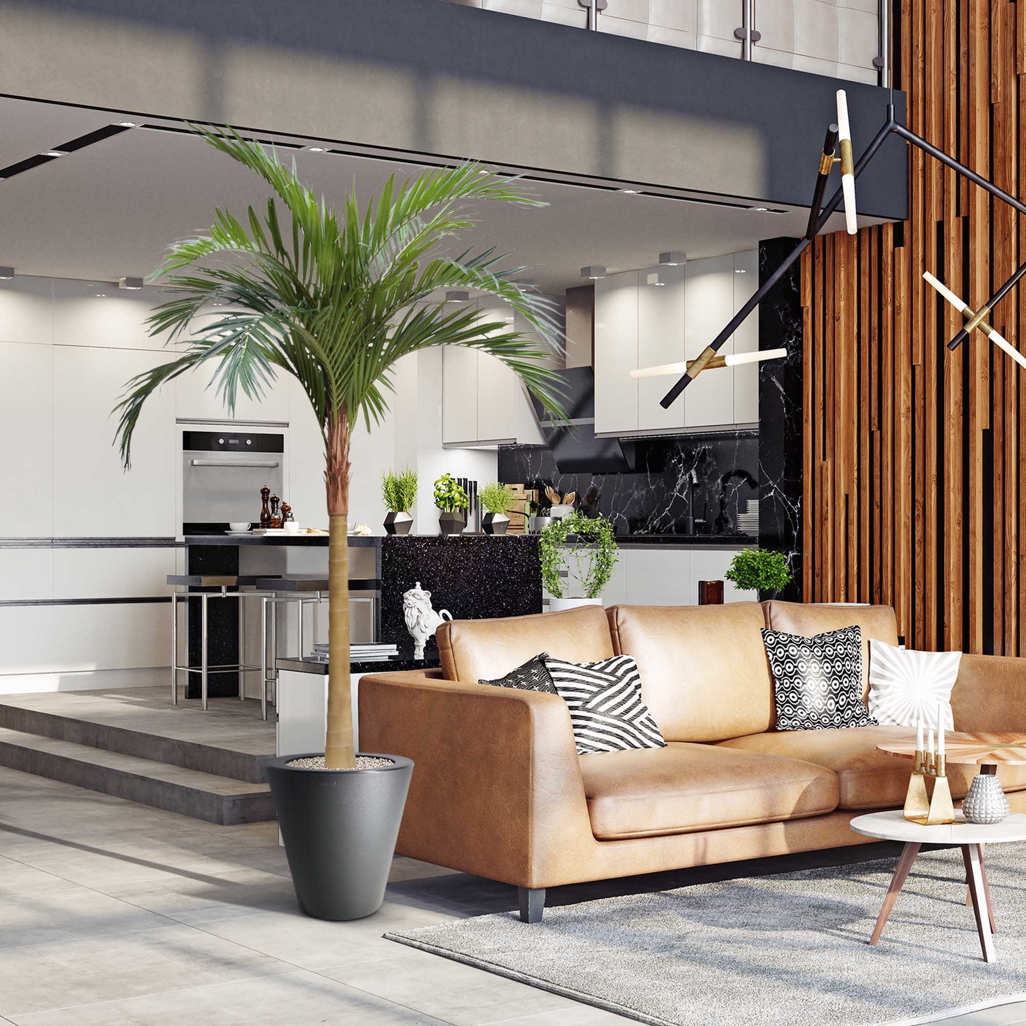 Anche in questo caso abbiamo fatto in modo che questa palma artificiale sia indistinguibile da quella vera. Sia il tronco che le foglie sono riprodotti così fedelmente che nessuno può distinguerli da una palma vera.