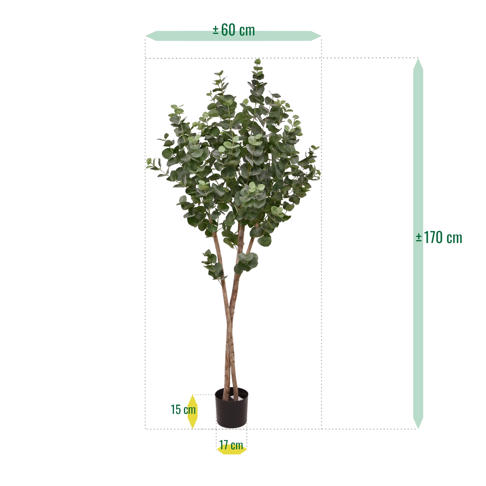 Porta la bellezza della natura nei tuoi interni e crea una vera sensazione di benessere con l'albero artificiale di eucalipto su tronco! L'eucalipto è naturalmente noto per la sua fragranza fresca e stimolante con effetti rilassanti, ma anche la pianta (artificiale) stessa funge da splendida decorazione. Le foglie dell'albero artificiale appaiono realistiche; i colori verdi tenui e intensi delle foglie, combinati con il rivestimento ceroso e polveroso delle foglie e gli steli realistici completano l'aspetto. Le foglie stesse possiedono una leggera variazione dei colori del verde e anche le dimensioni delle foglie variano, per rendere l'aspetto complessivo ancora più realistico.