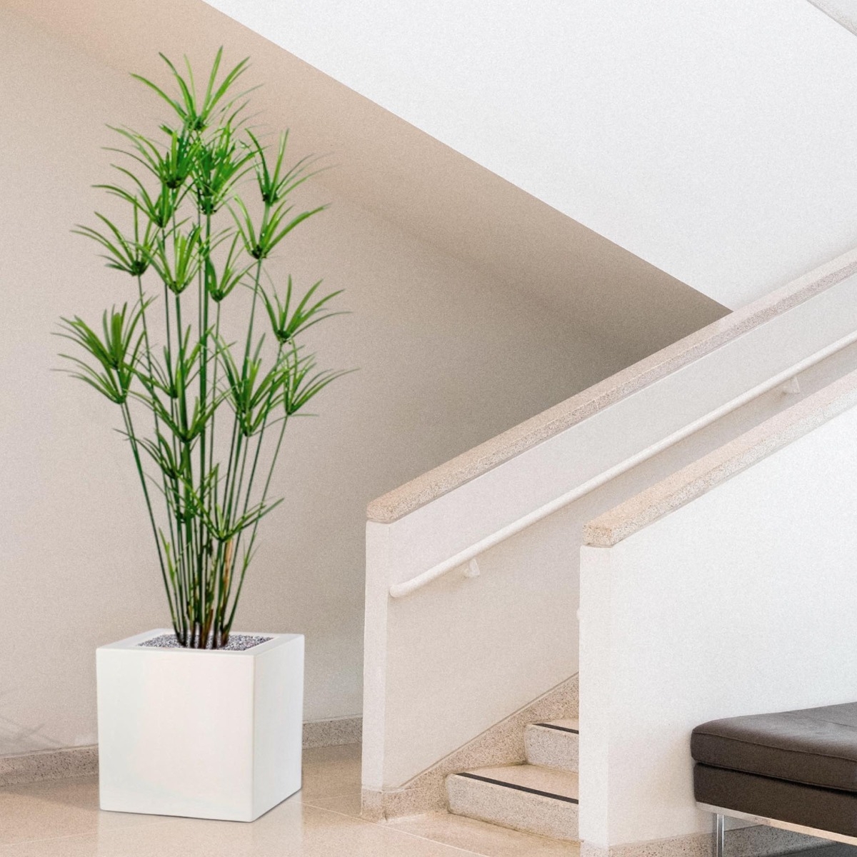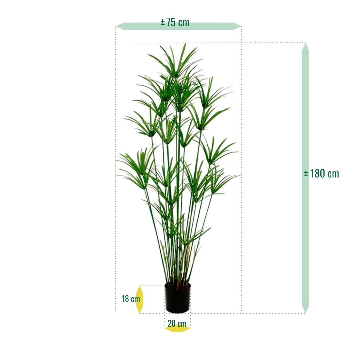 La giocosa pianta artificiale Papyrus è una bellissima aggiunta alla gamma di piante artificiali. Con i suoi numerosi germogli laterali, questo modello ha un aspetto ben arrotondato e naturale! Con un'altezza di circa 180 cm, la pianta artificiale può essere p