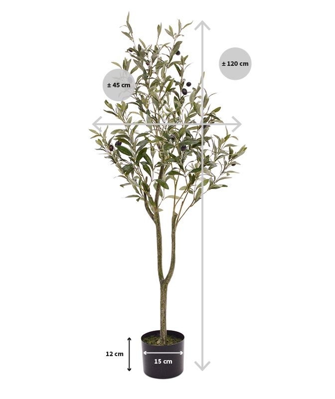 Questo ulivo artificiale su tronco misura circa 120 cm e 45 cm di larghezza e viene fornito con un vaso interno in plastica di 15 cm e un solido riempimento incollato. Ciò consente di collocare facilmente l'ulivo in un vaso ornamentale. È possibile ordinarlo direttamente insieme ad esso.