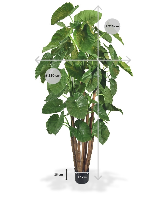 L'Alocasia Caldora Giant non si chiama "gigante" per niente! Questo albero artificiale è sicuramente all'altezza del suo nome, con una lunghezza che raggiunge i 210 cm. Naturalmente, l'Alocasia viene utilizzata nelle foreste pluviali tropicali per ripararsi so