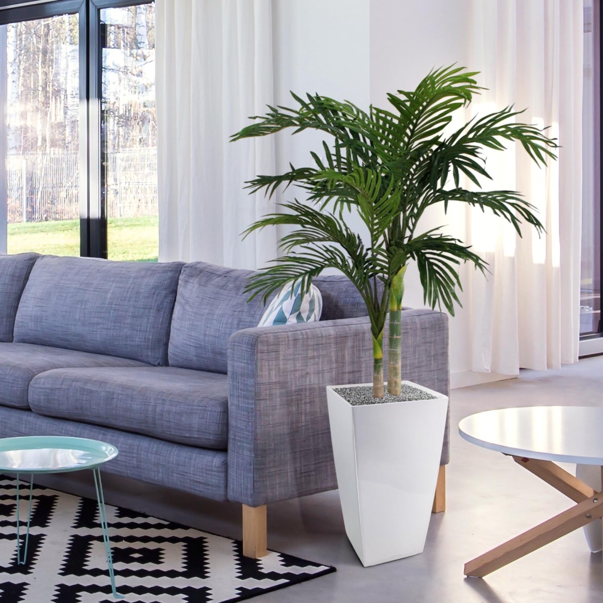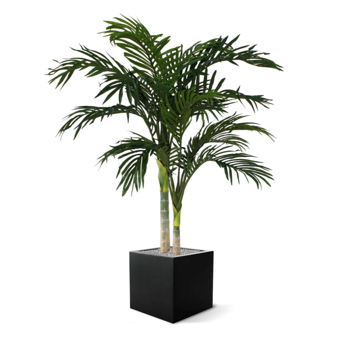 Palma Areca artificiale ben imitata con 2 tronchi. L'altezza di questa palma artificiale è di circa 120 cm in totale, mentre il diametro è di circa 75 cm. Con questo albero creerete un'atmosfera tropicale a casa vostra in pochissimo tempo! La palma artificiale