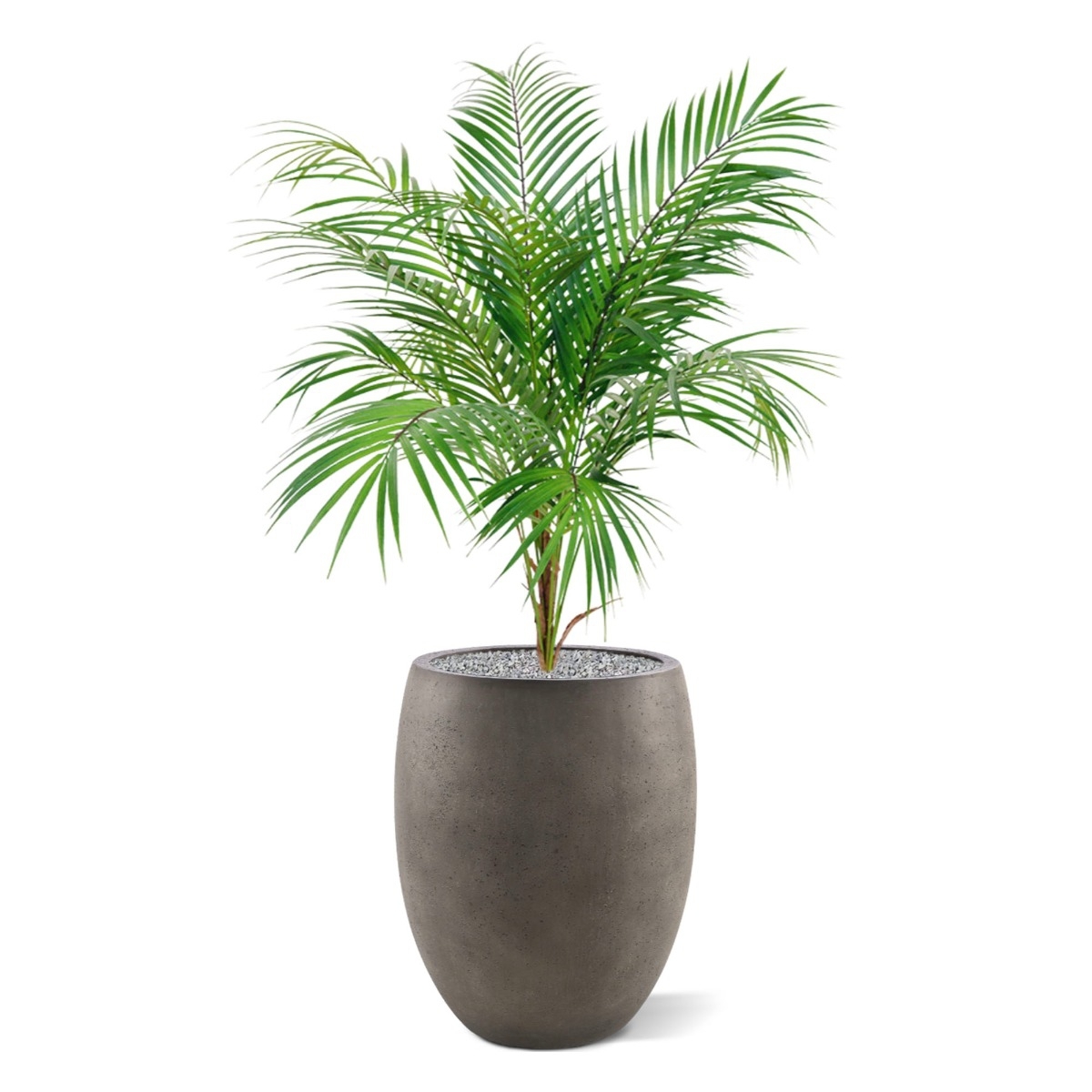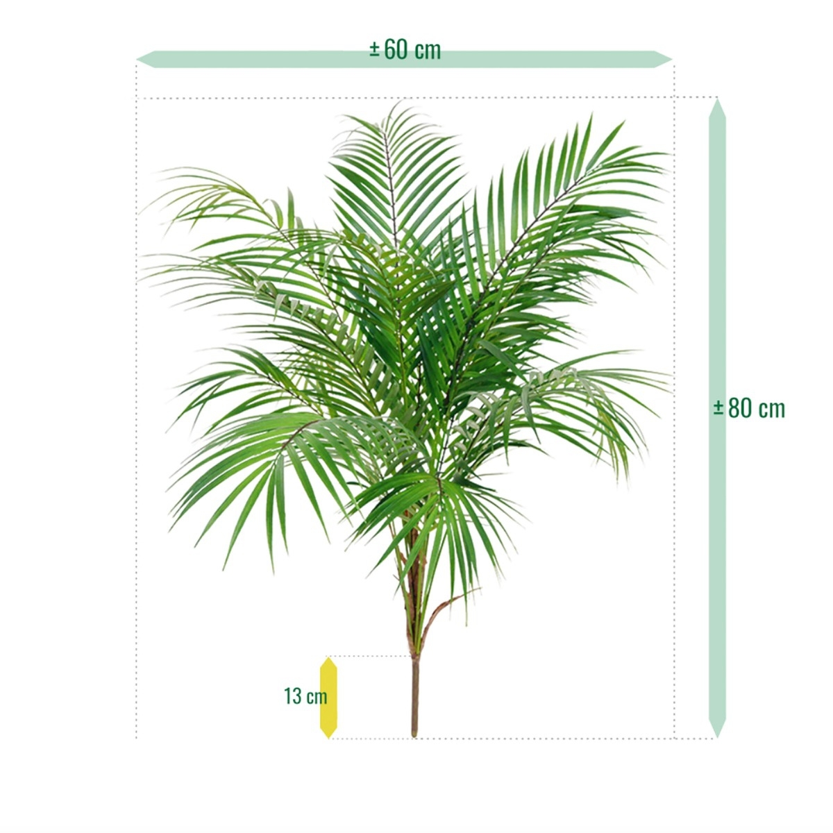 Guardate come si distinguono a malapena le foglie di plastica solida di questo bouquet di palme Areca. Guardate le caratteristiche foglie oblunghe, sfalsate in altezza e colore, che spuntano dalla base riccamente riempita, che sembra vero legno. Questo bouquet