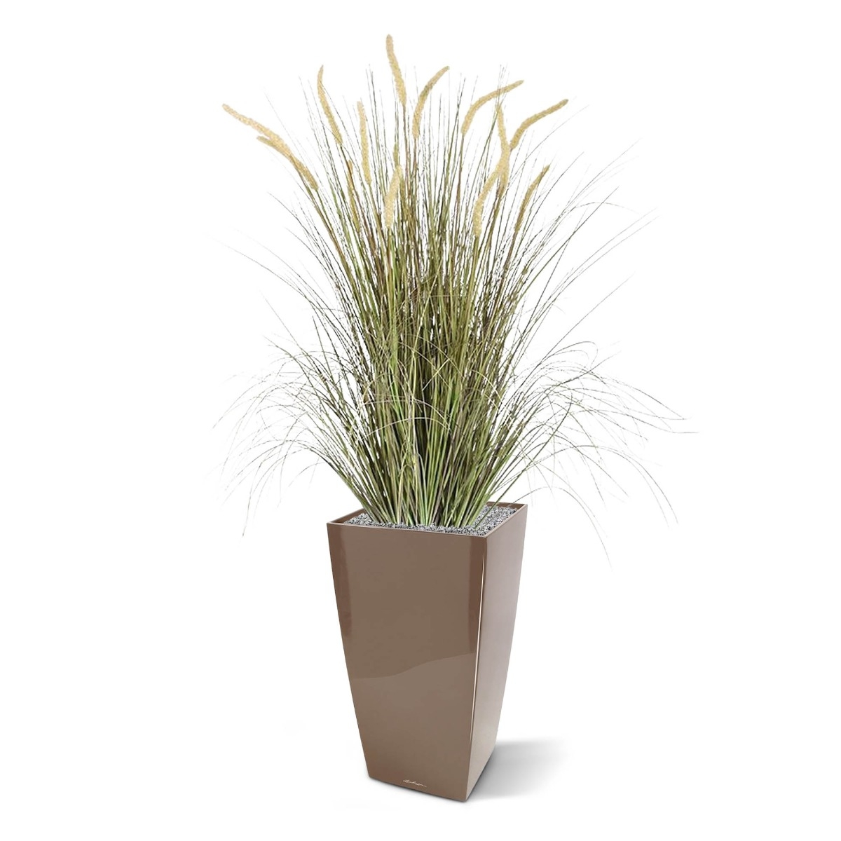 Questa attraente pianta d'erba chiamata artisticamente Lampepoetser è molto riccamente eseguita e quindi ha un aspetto traboccante. Un'attenzione particolare è rivolta ai diversi fili d'erba di diverse lunghezze, larghezze, spessori e tonalità di colore che contrastano splendidamente con gli 11 pennacchi argentati e setosi.