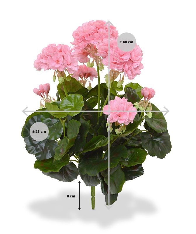 Chi non li conosce: i gerani. Probabilmente una delle piante artificiali più vendute nei Paesi Bassi e ancora molto popolare. Questo geranio artificiale dalla fioritura esuberante ha un'altezza di circa 40 cm e una larghezza di circa 25 cm. Come talea, la pian