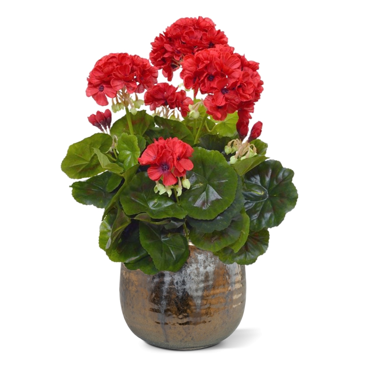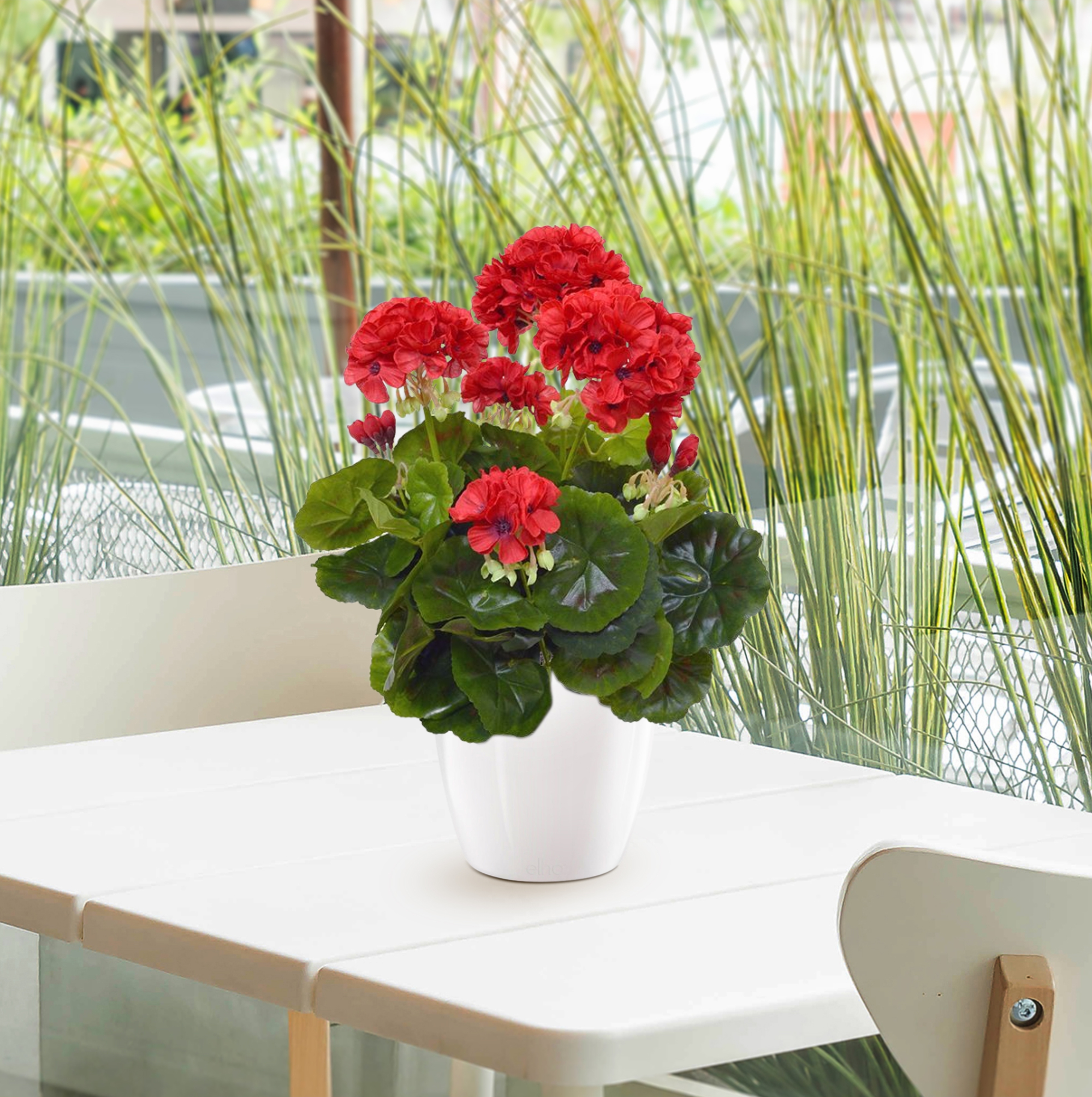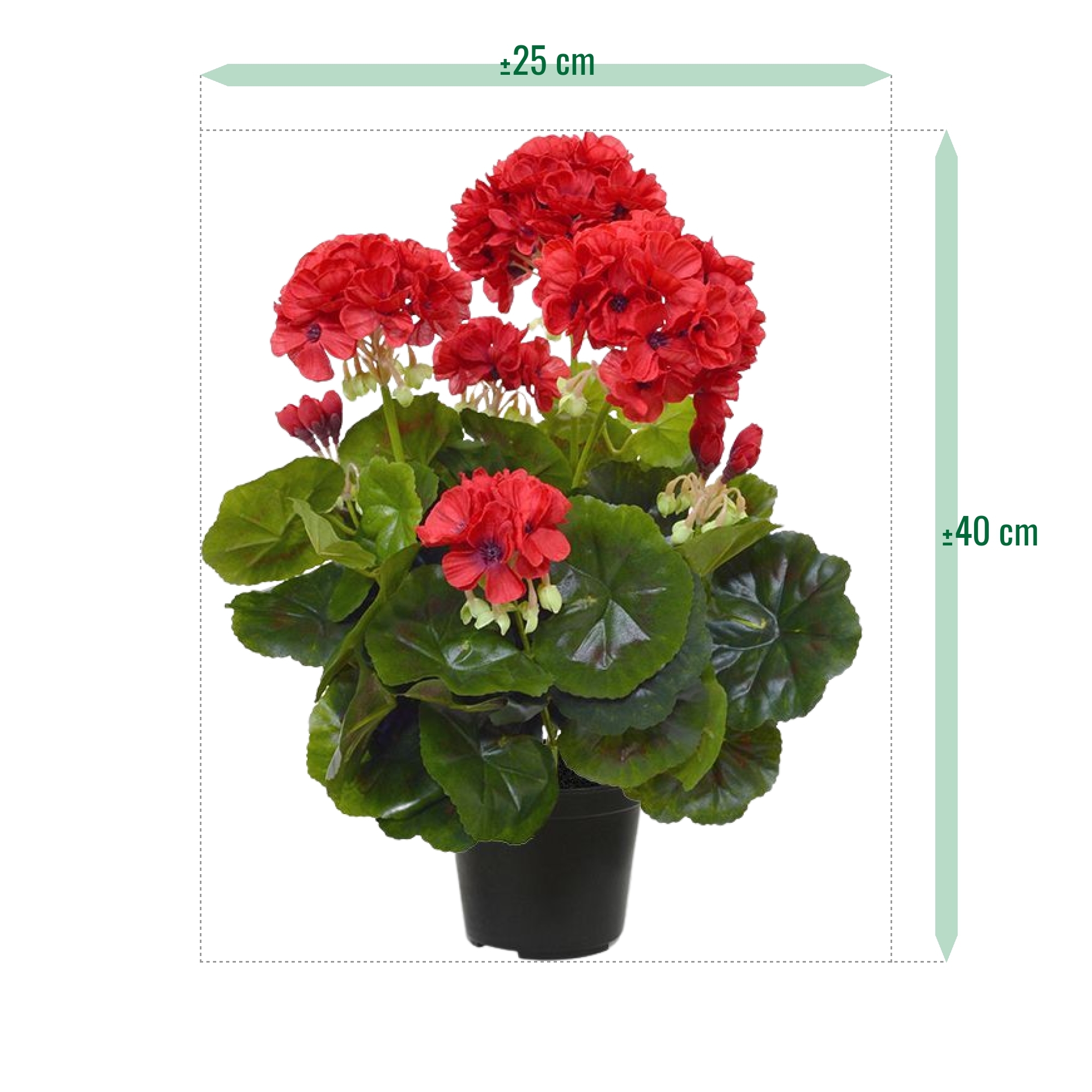 Chi non li conosce: i gerani. Probabilmente una delle piante artificiali più vendute nei Paesi Bassi e ancora molto popolare. Questo geranio artificiale dalla fioritura esuberante ha un'altezza di circa 40 cm e una larghezza di circa 25 cm. La pianta artificia