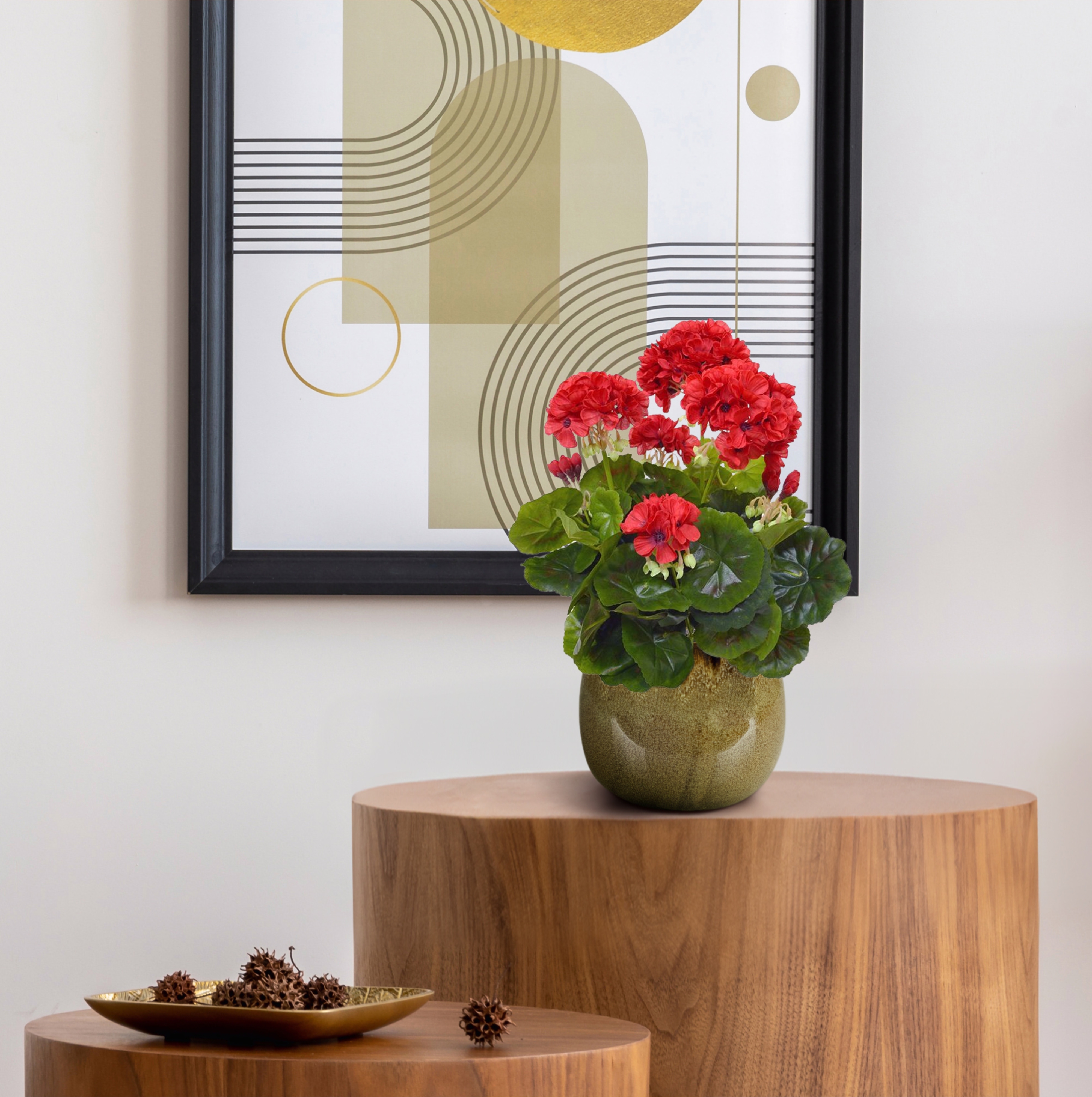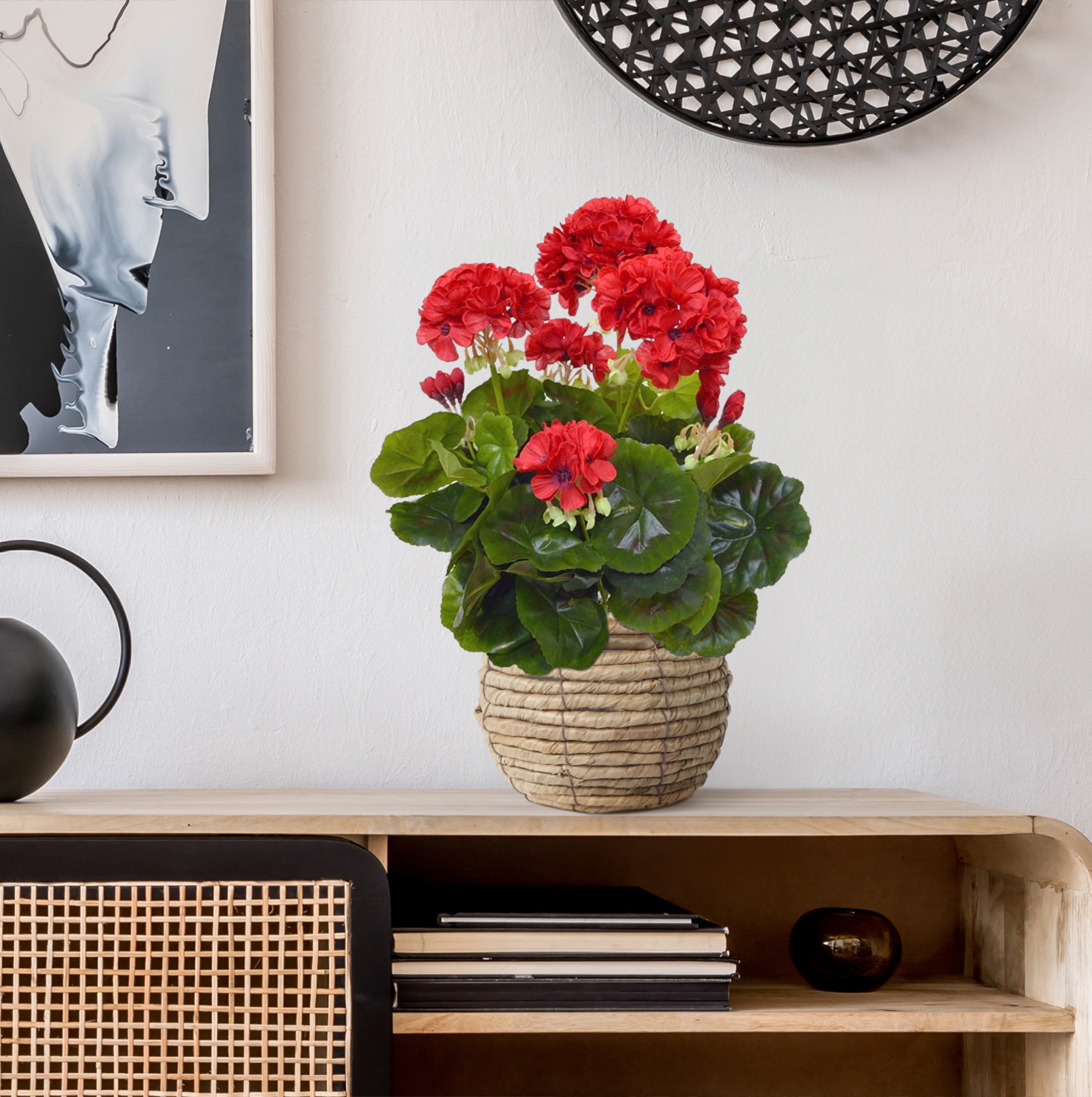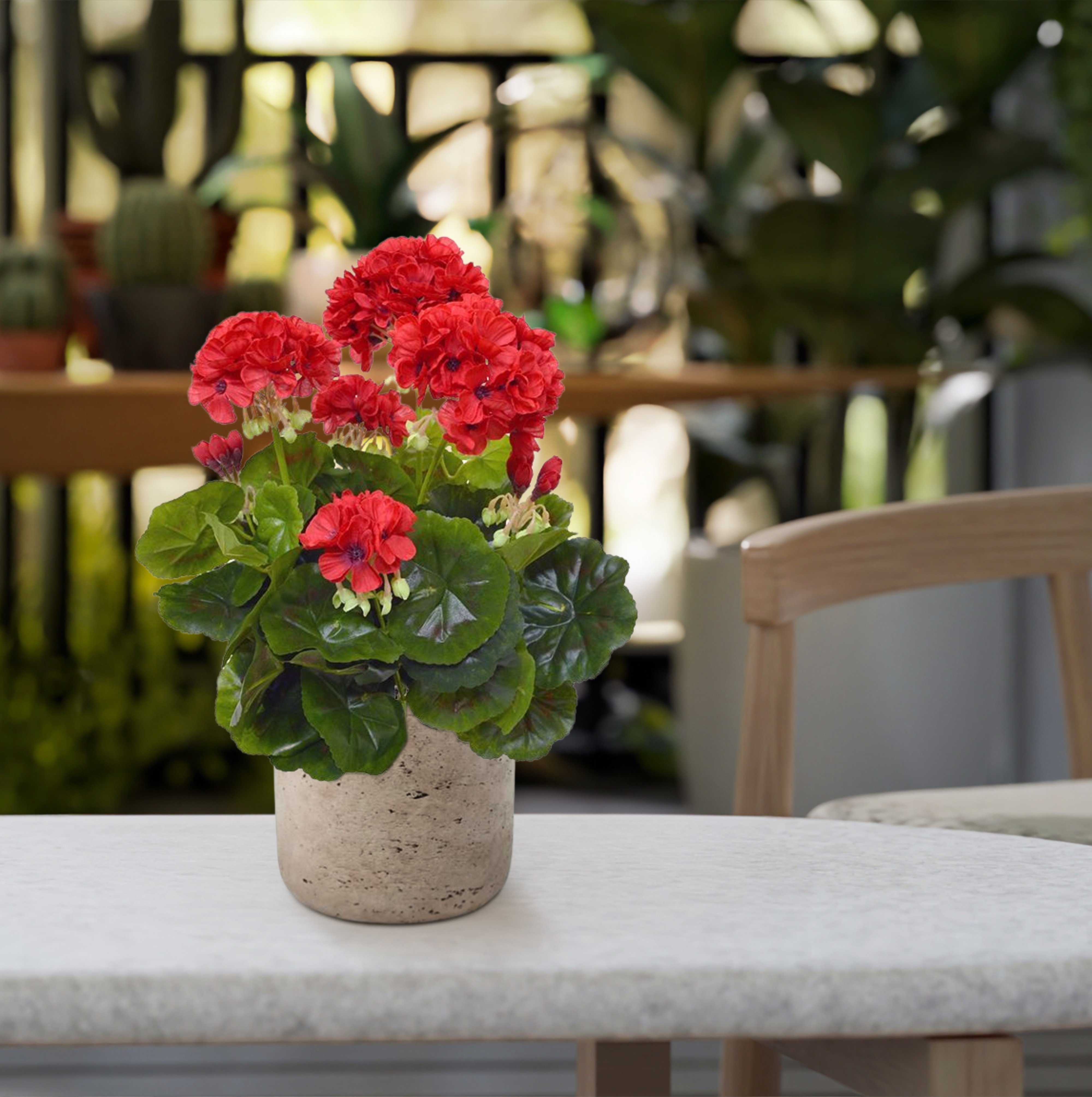 Chi non li conosce: i gerani. Probabilmente una delle piante artificiali più vendute nei Paesi Bassi e ancora molto popolare. Questo geranio artificiale dalla fioritura esuberante ha un'altezza di circa 40 cm e una larghezza di circa 25 cm. La pianta artificia