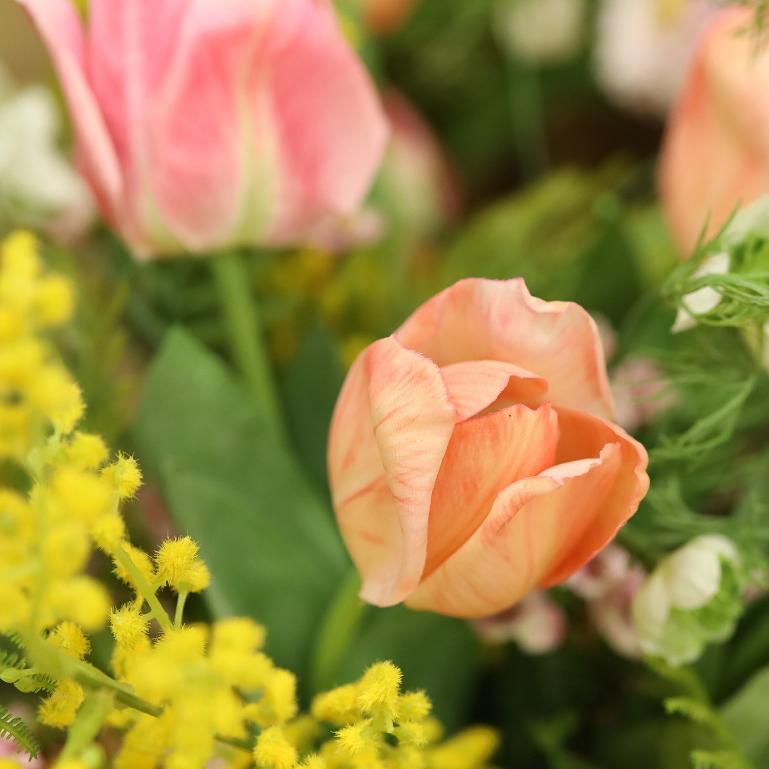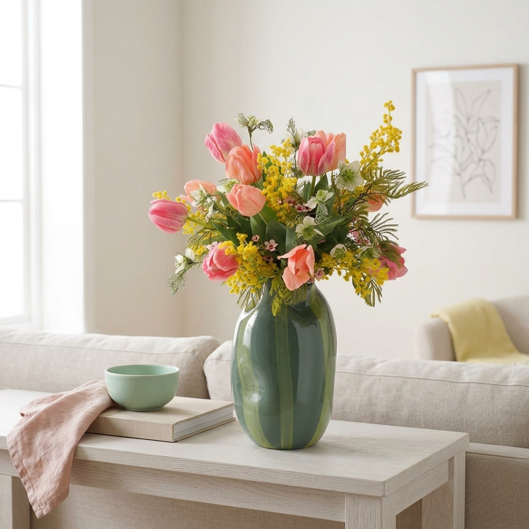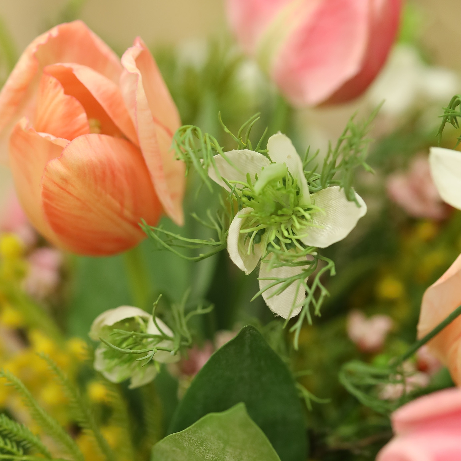 Il Bouquet Artificiale Mariska Silves è una composizione fresca e contemporanea di fiori artificiali con un’altezza di 60 cm e una larghezza di 55 cm. Questo bouquet artificiale colpisce per l’armoniosa combinazione di tonalità salmone e rosa delicate, arricchite da vivaci accenti gialli e verde fresco. Eleganti tulipani rosa e salmone formano il punto focale luminoso, mentre rami leggeri di mimosa e raffinata nigella donano un effetto naturale e dinamico. Sottili waxflowers e una graziosa felce ornamentale aggiungono profondità e una silhouette morbida a questo bouquet di fiori artificiali. Perfetto per ambienti moderni, naturali o accoglienti.