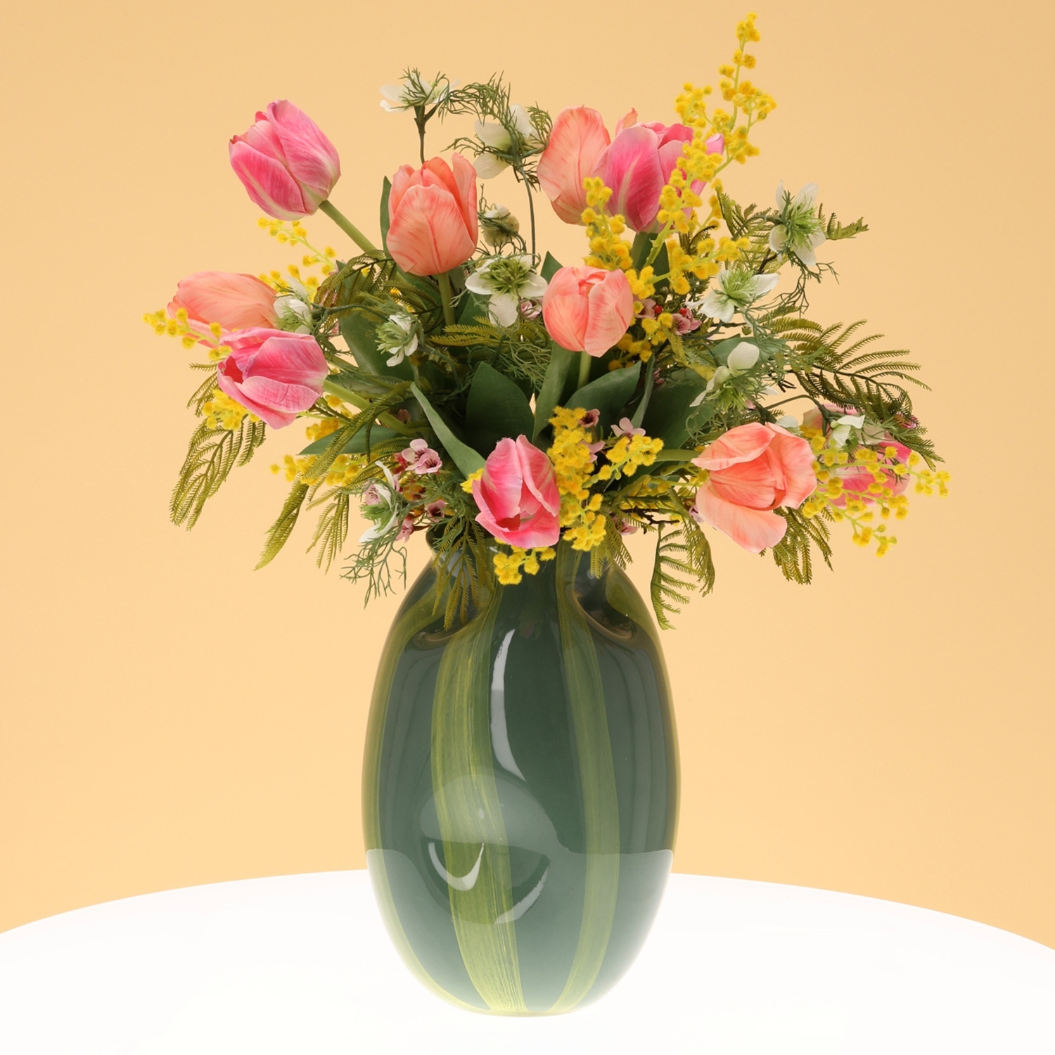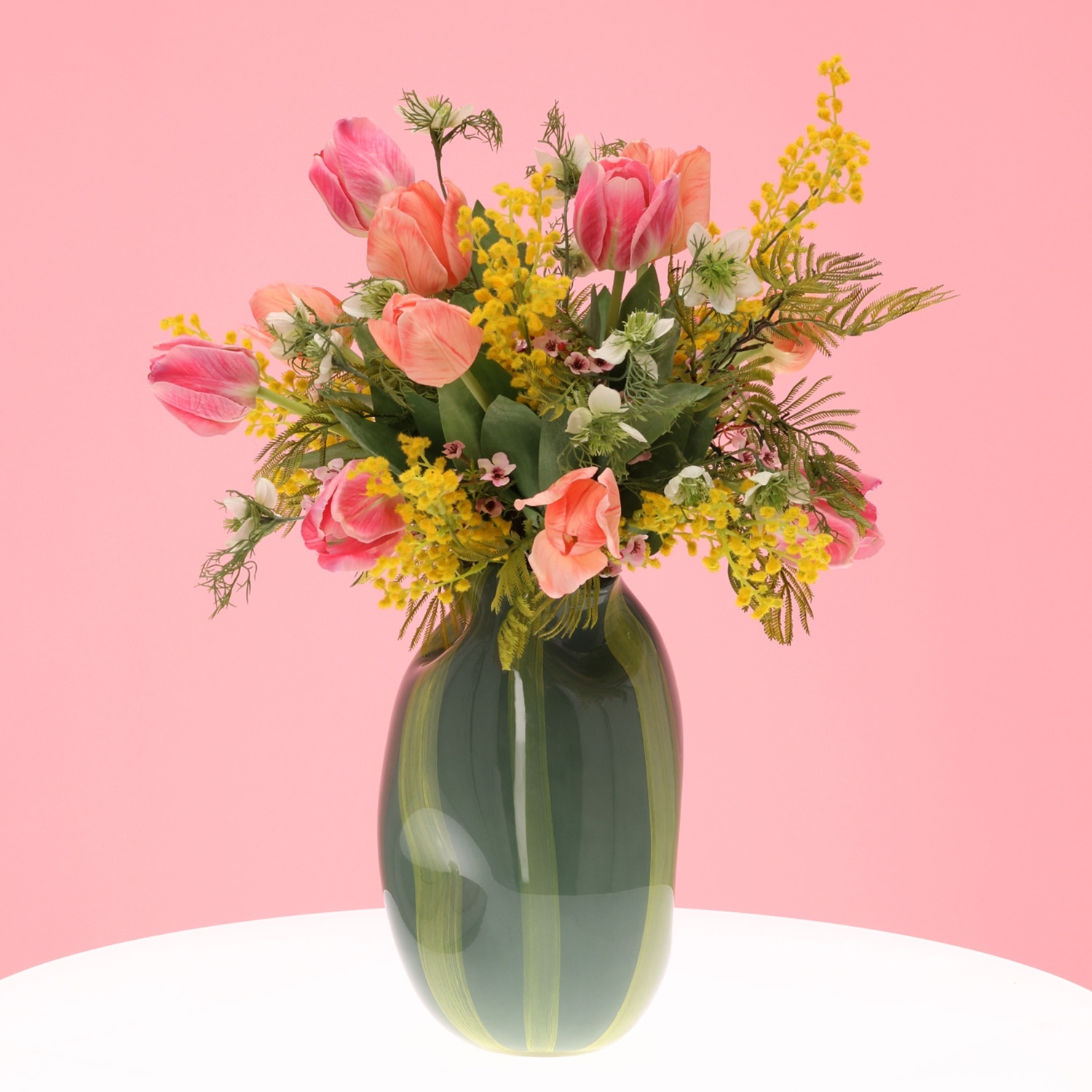 Le tonalità verdi selezionate con cura e le texture fini conferiscono al bouquet un aspetto leggero e primaverile. Questo bouquet di fiori in seta è realizzato in seta artificiale, materiale noto per la sua finitura realistica. I fiori mantengono forma e freschezza senza necessità di manutenzione, permettendoti di godere tutto l’anno di un’atmosfera floreale. Puoi collocarlo su un tavolo da pranzo, una credenza o un tavolino. Anche in un ingresso, ufficio o banco reception crea un ambiente elegante e accogliente. Nota: il bouquet viene fornito senza il vaso illustrato Vaas Lolly Pop 20x31cm Groen Geel.