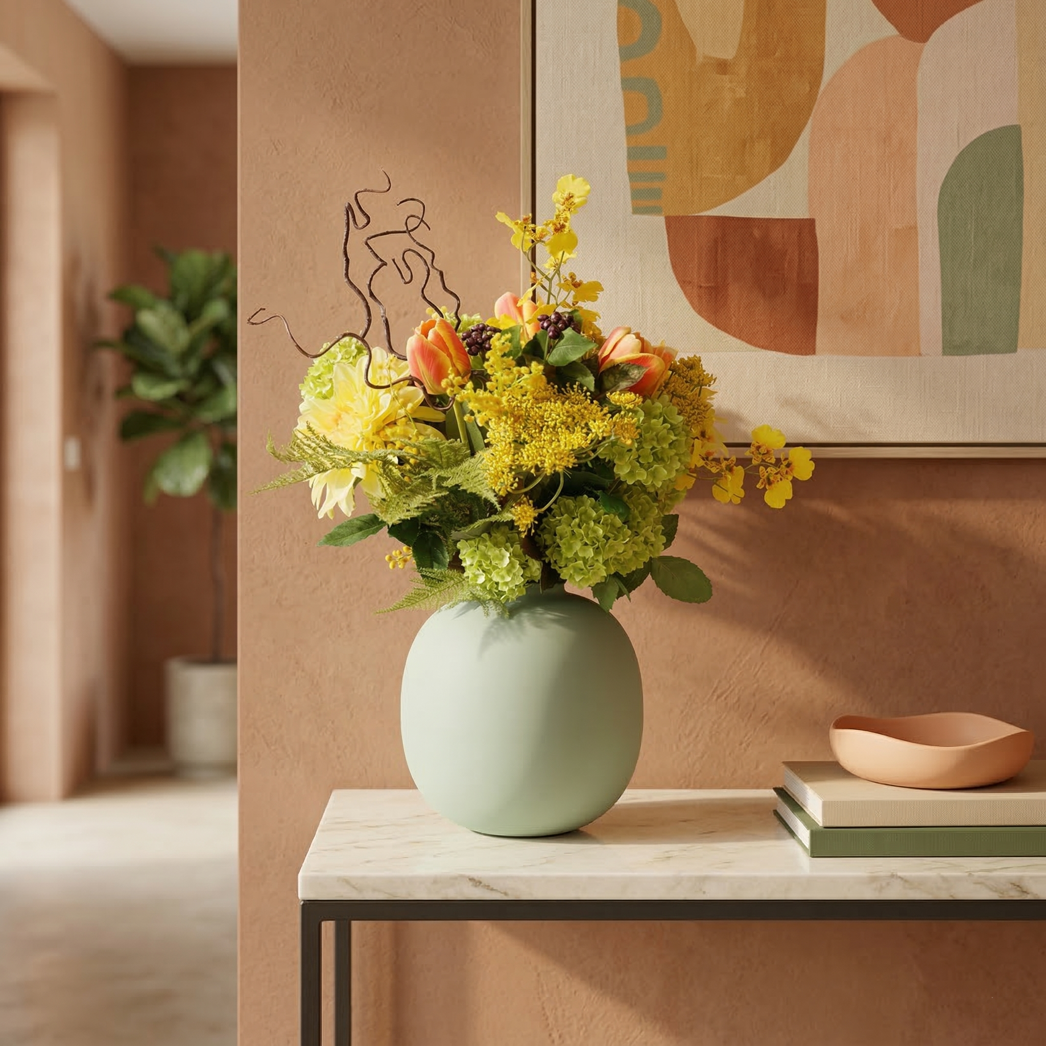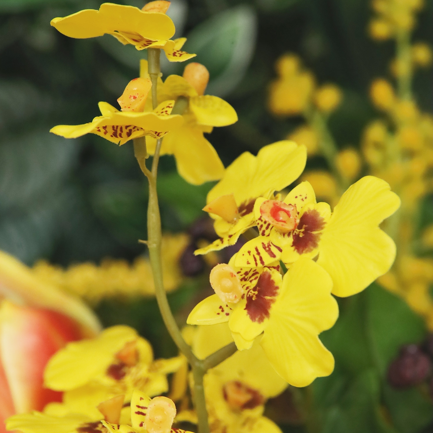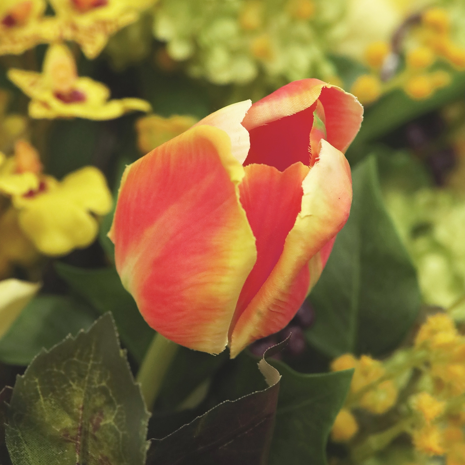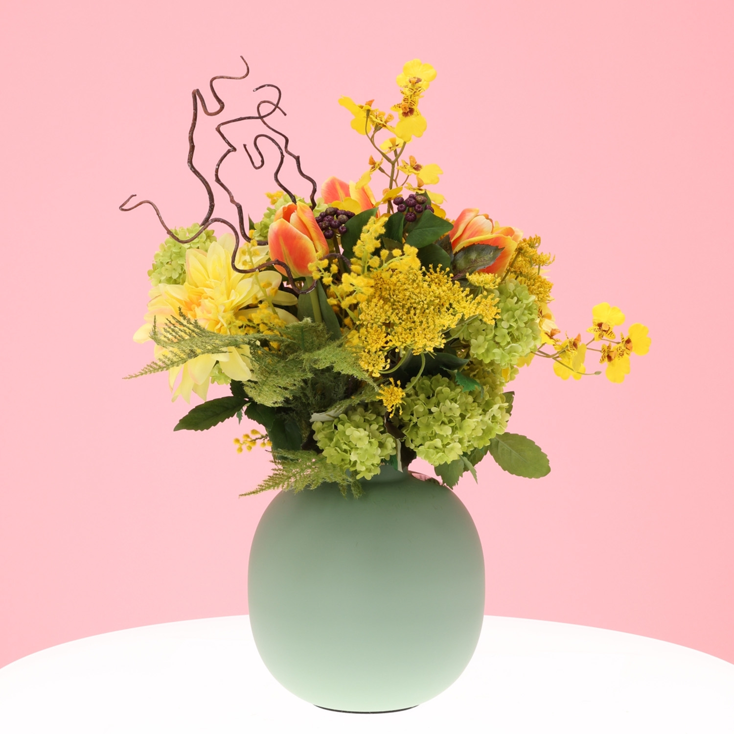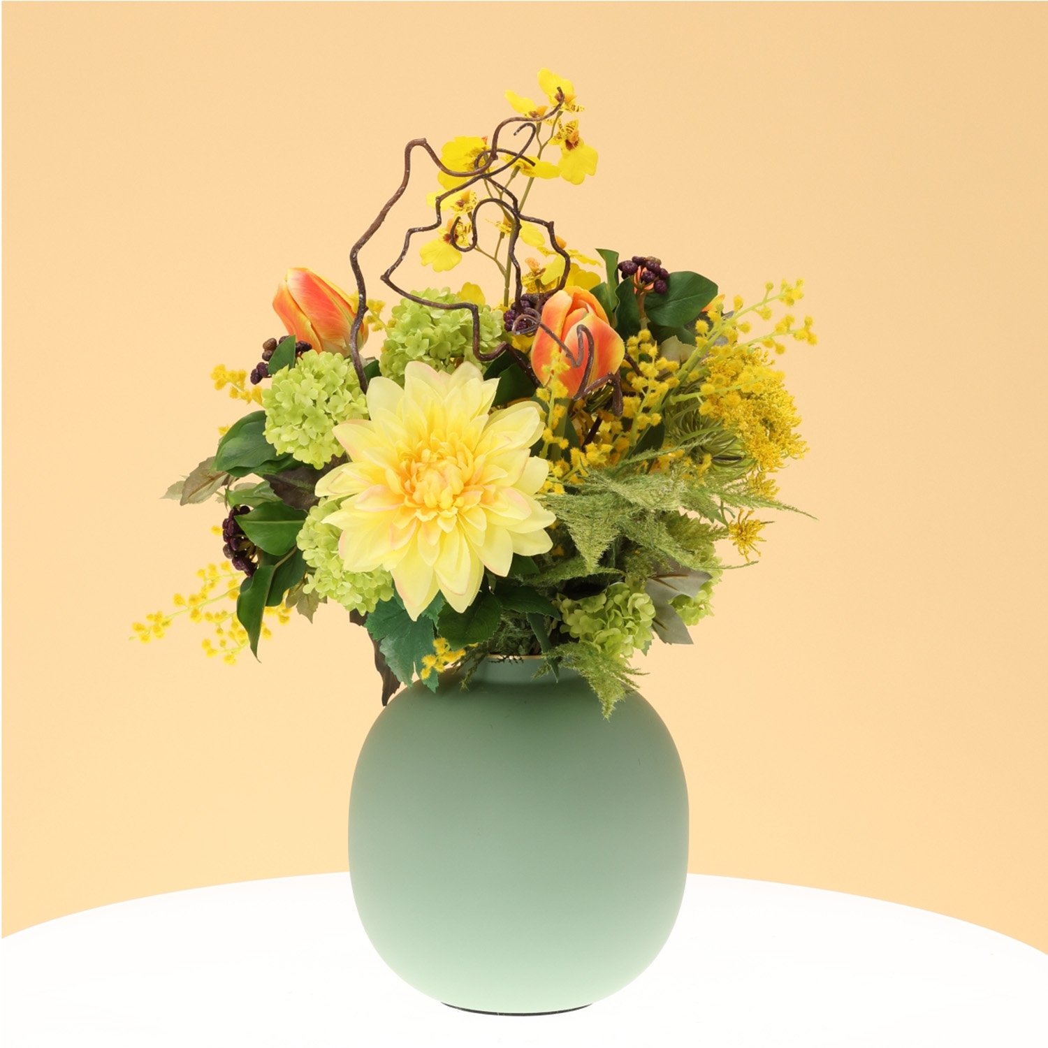 Il Mazzo di Fiori Artificiali Chantal Lucca è una composizione fresca e contemporanea di fiori artificiali, con un’altezza e una larghezza di 55 cm. Questo luminoso mazzo nei toni del giallo con delicati accenti arancioni dona immediatamente un’atmosfera accogliente e raffinata al tuo ambiente. La combinazione di una dalia gialla voluminosa, eleganti tulipani arancioni, orchidee raffinate e mimosa leggera crea un insieme vivace e naturale. Rametti di aneto e foglie d’acero aggiungono texture, mentre viburno e agrifoglio formano una base verde armoniosa. Questo mazzo di fiori artificiali si adatta perfettamente a interni moderni, naturali o accoglienti.