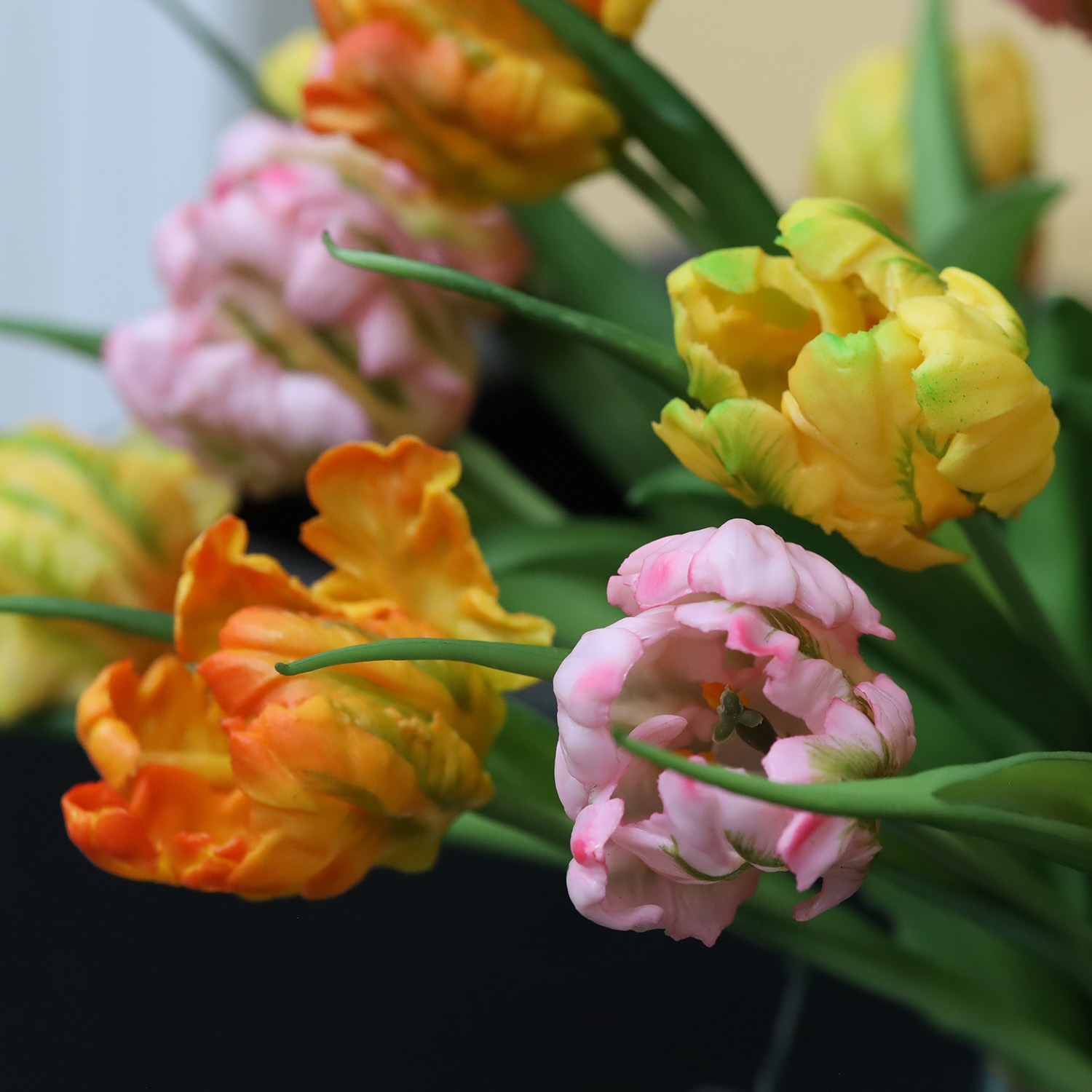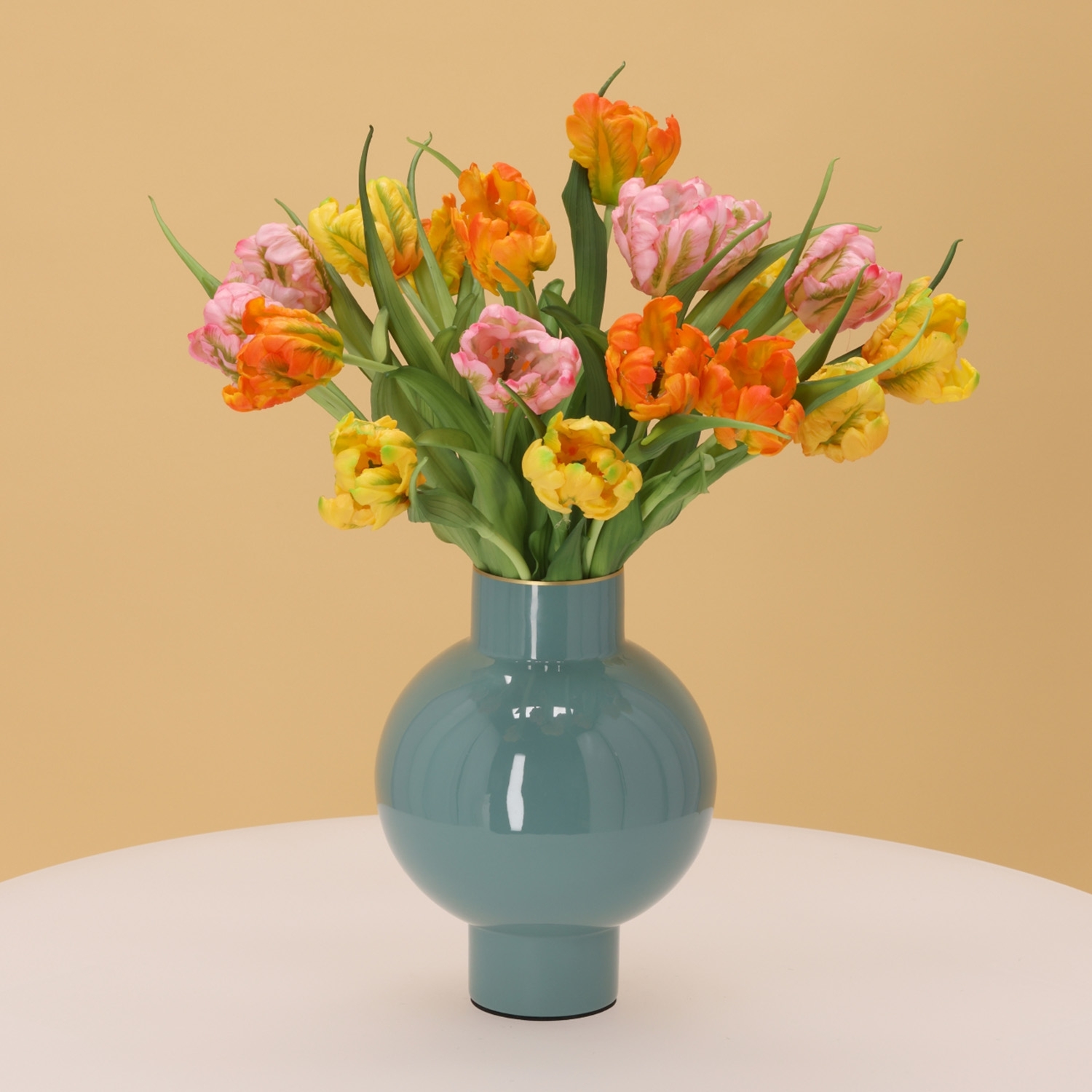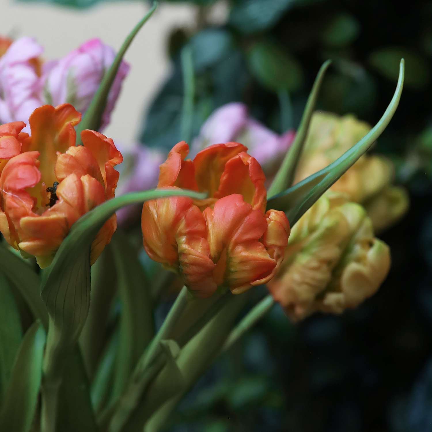 I nostri fioristi esperti hanno composto questo mazzo artificiale con grande cura, garantendo un equilibrio armonioso tra colori e altezze. Questo mazzo di fiori in seta è realizzato in seta artificiale di alta qualità, un materiale resistente che si distingue a malapena dai fiori veri. I tulipani mantengono forma e freschezza senza bisogno di acqua, così puoi godere di un effetto fiorito tutto l’anno. È ideale in soggiorno, all’ingresso o sul bancone di un ufficio o salone. Nota: il bouquet viene fornito senza il vaso mostrato Pip Studio Vase Metal Small Sea Green 18x24cm.