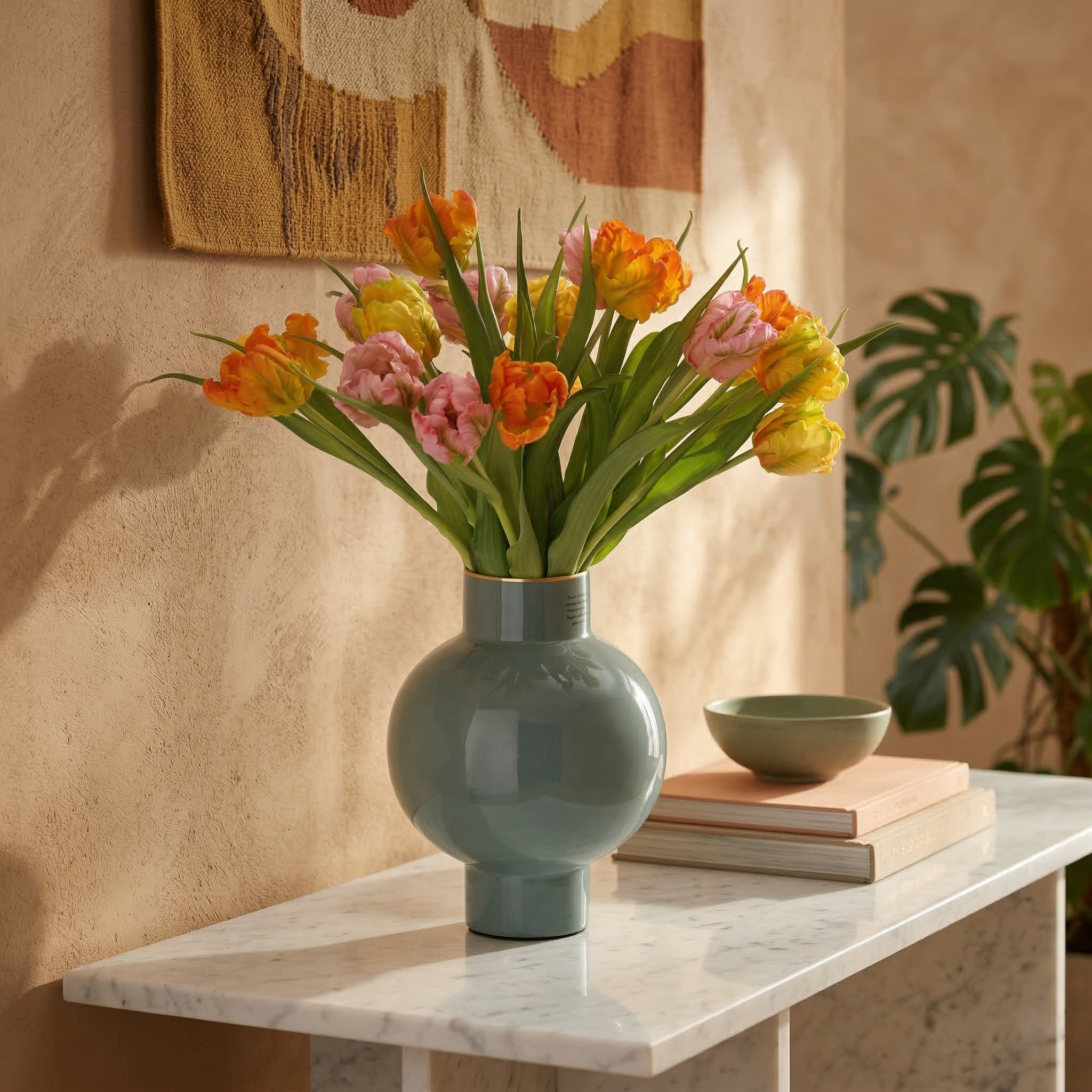 Il Mazzo di Fiori Artificiali Ramona Lisse è una composizione fresca e colorata di fiori artificiali con un’altezza di 50 cm e una larghezza di 40 cm. Questo mazzo artificiale Ramona Lisse 50 cm dona immediatamente allegria al tuo ambiente grazie alla combinazione vivace di tulipani arancioni, gialli e rosa delicato. I fiori pieni e gli steli leggermente curvati creano un effetto naturale e conferiscono a questo mazzo di fiori artificiali un carattere dinamico ed elegante. Il mix di tonalità calde e morbide lo rende perfetto per un interno moderno, scandinavo o accogliente dove desideri aggiungere un tocco di colore raffinato. Posizionato sul tavolo da pranzo, su una credenza o su un tavolino, cattura l’attenzione con stile.