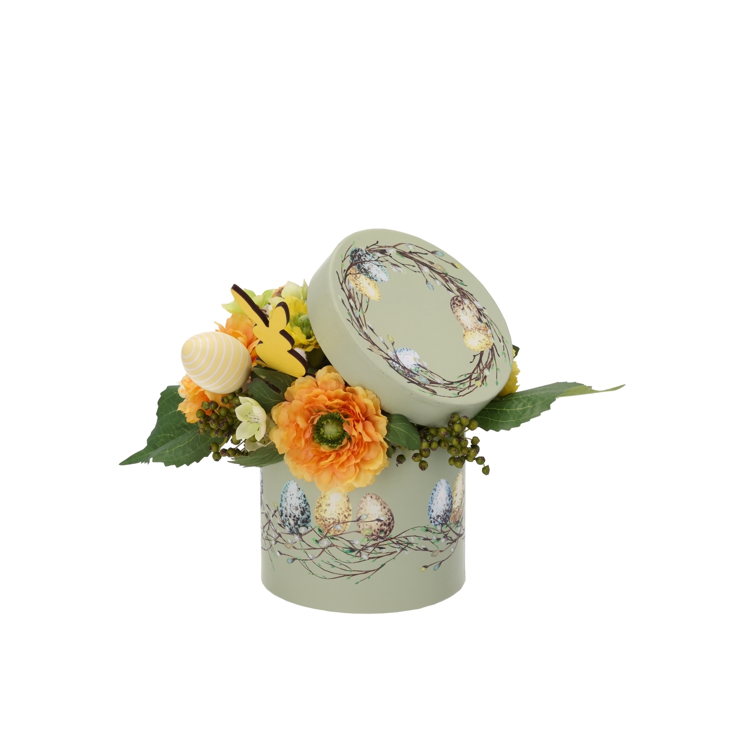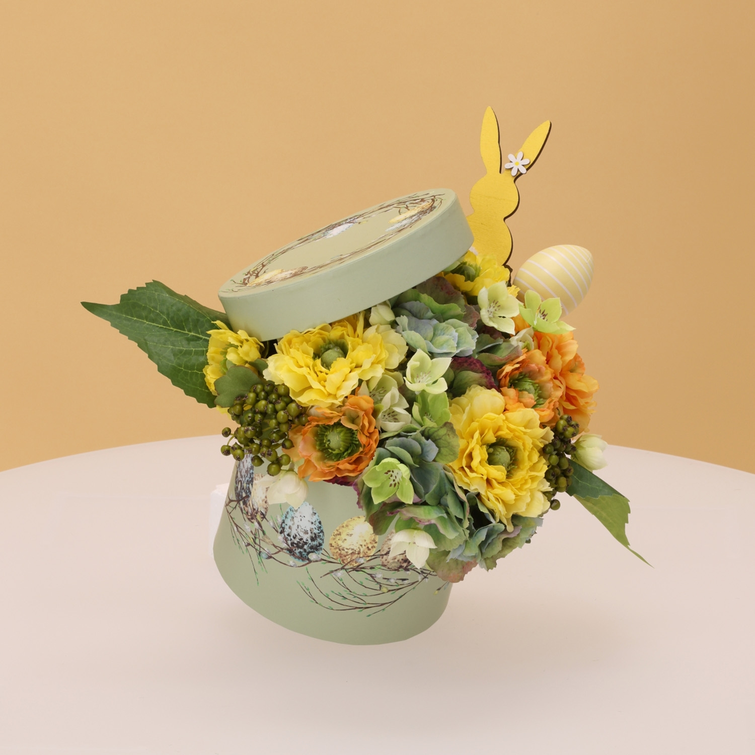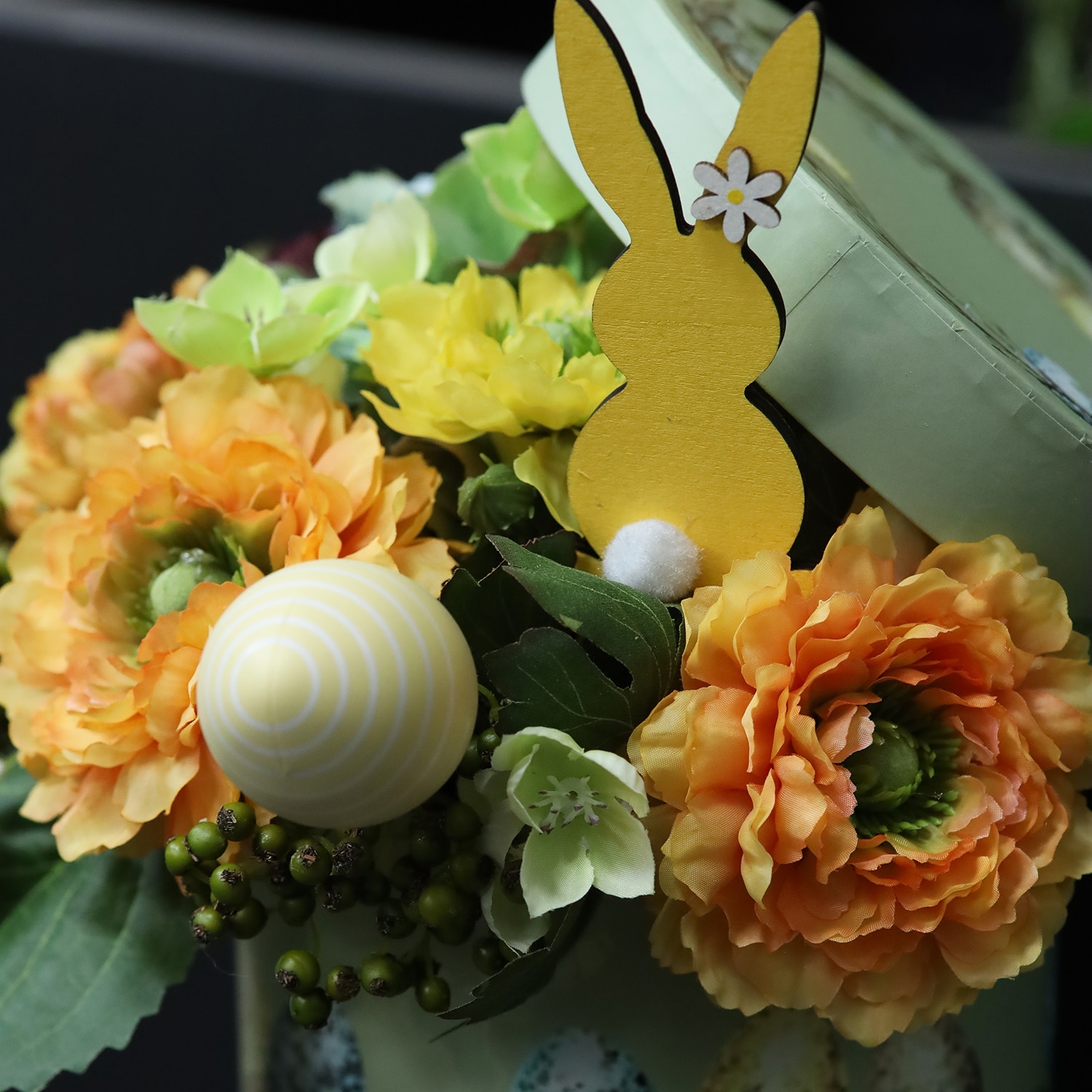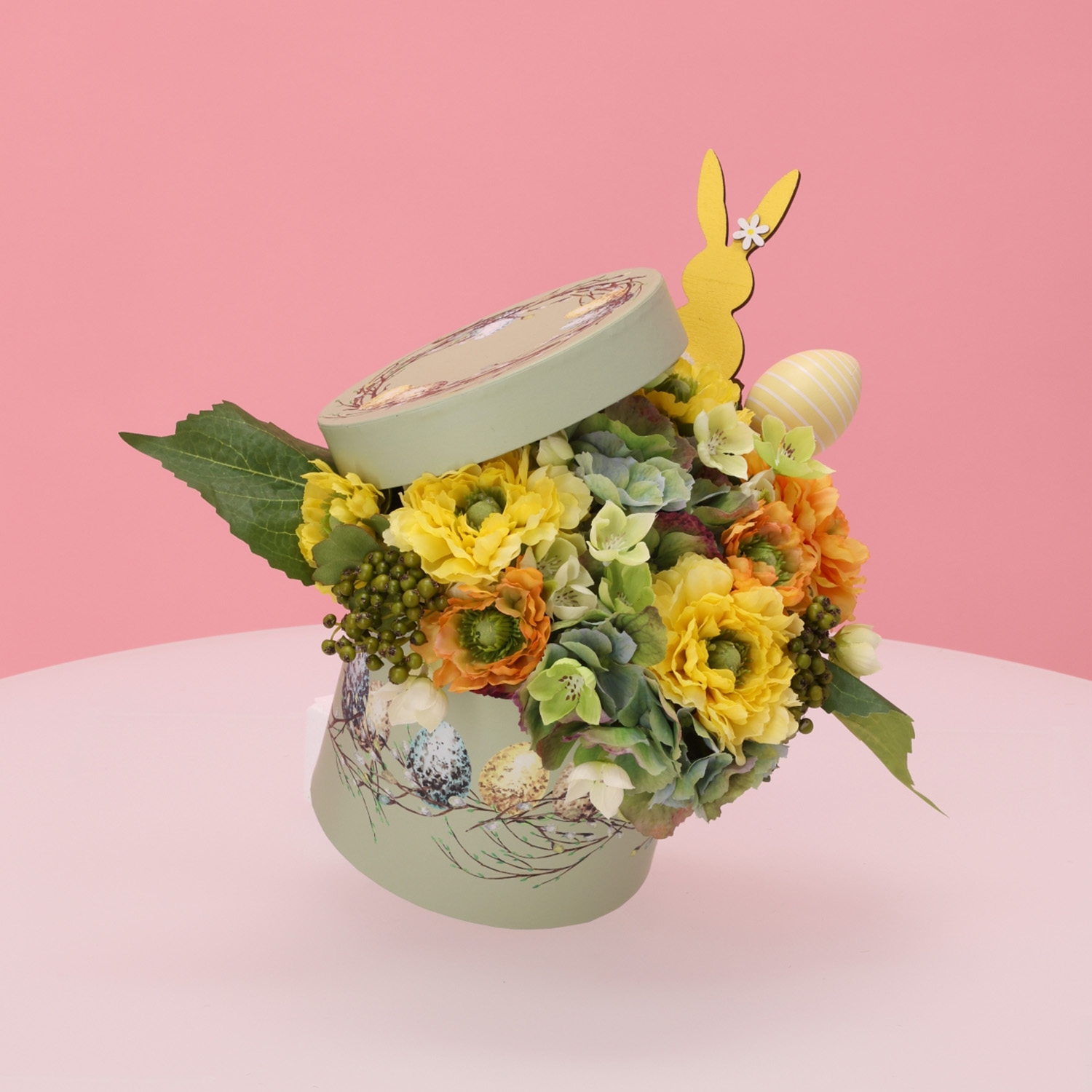 La Scatola regalo di fiori Laura Leiden è una composizione affascinante e festosa di fiori artificiali con un’altezza di 25 cm e una larghezza di 25 cm, presentata con stile in una scatola decorativa. Questa Flower Gift Box trasmette allegria e atmosfera primaverile grazie alle tonalità gialle luminose e ai delicati verdi. L’arrangiamento include ranuncoli gialli e arancioni, ramoscelli fioriti, bacche decorative e fogliame ricco. Il dettaglio di un uovo decorativo e di un coniglietto dona un carattere stagionale e accogliente. Questo bouquet di fiori artificiali è perfetto come decorazione da tavola per un brunch, come elegante accento su una credenza o come caloroso benvenuto in un ingresso o area reception.