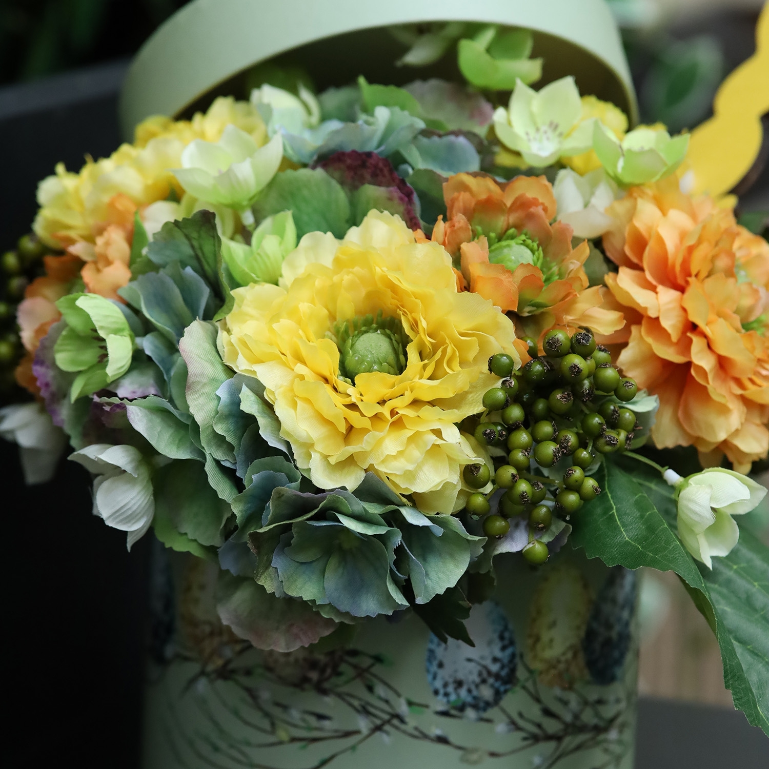 I nostri fioristi hanno disposto con cura questo bouquet artificiale compatto all’interno di una scatola rotonda, pronto per essere regalato o esposto. Questo bouquet di fiori in seta è realizzato in seta artificiale, un materiale noto per la sua finitura realistica. I fiori mantengono forma e freschezza senza manutenzione, permettendoti di godere a lungo di una presentazione curata e fiorita. Grazie alle dimensioni pratiche, questa flower box è ideale per un tavolino, banco, scrivania o cucina accogliente. La combinazione di colori, dettagli e finitura raffinata rende questo arrangiamento perfetto per interni moderni, naturali o dal gusto familiare.