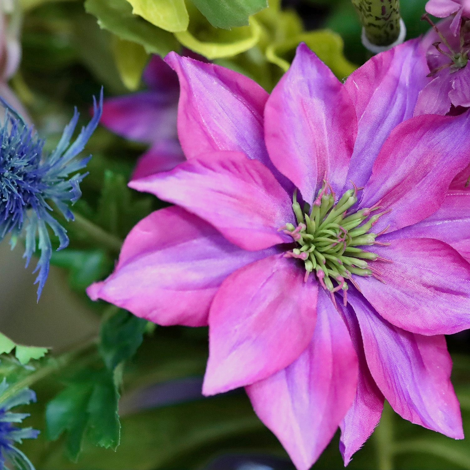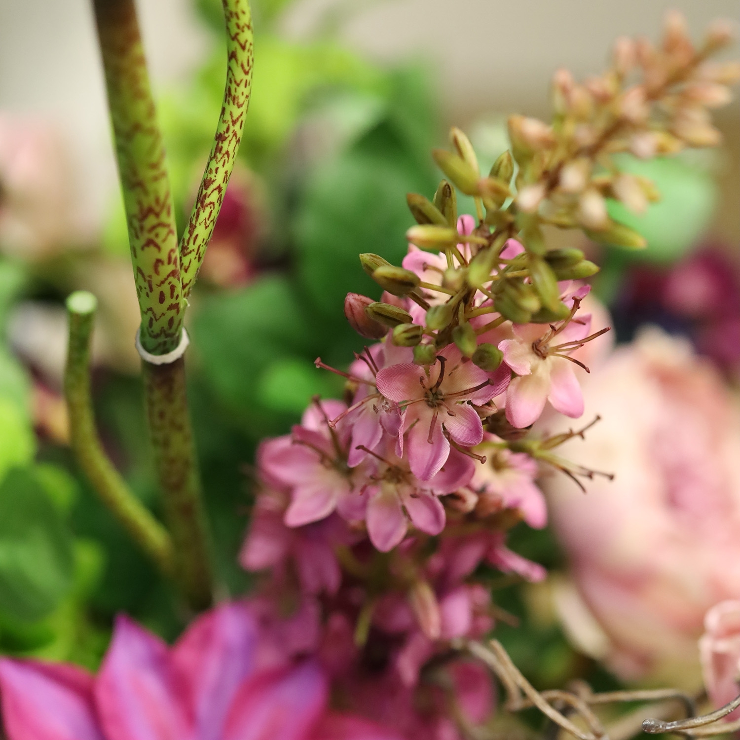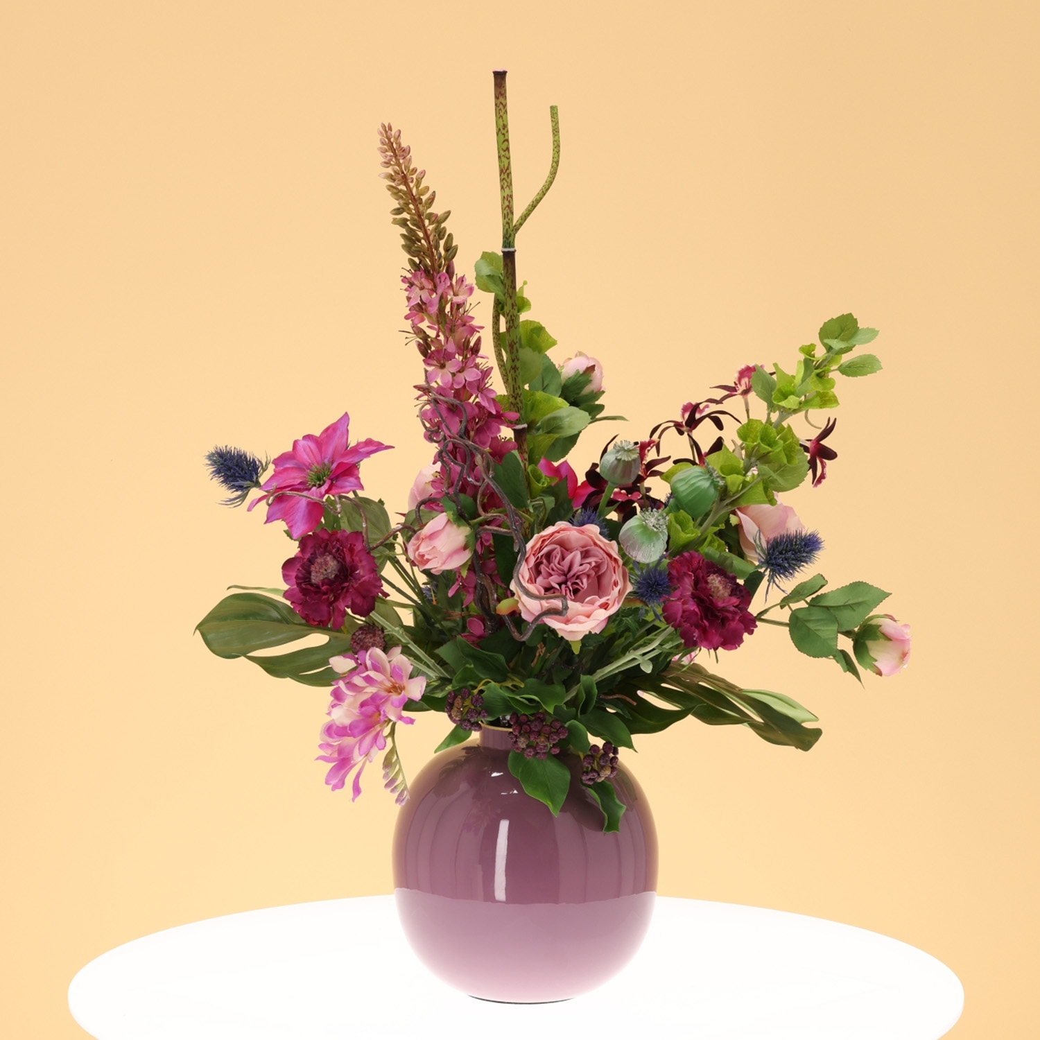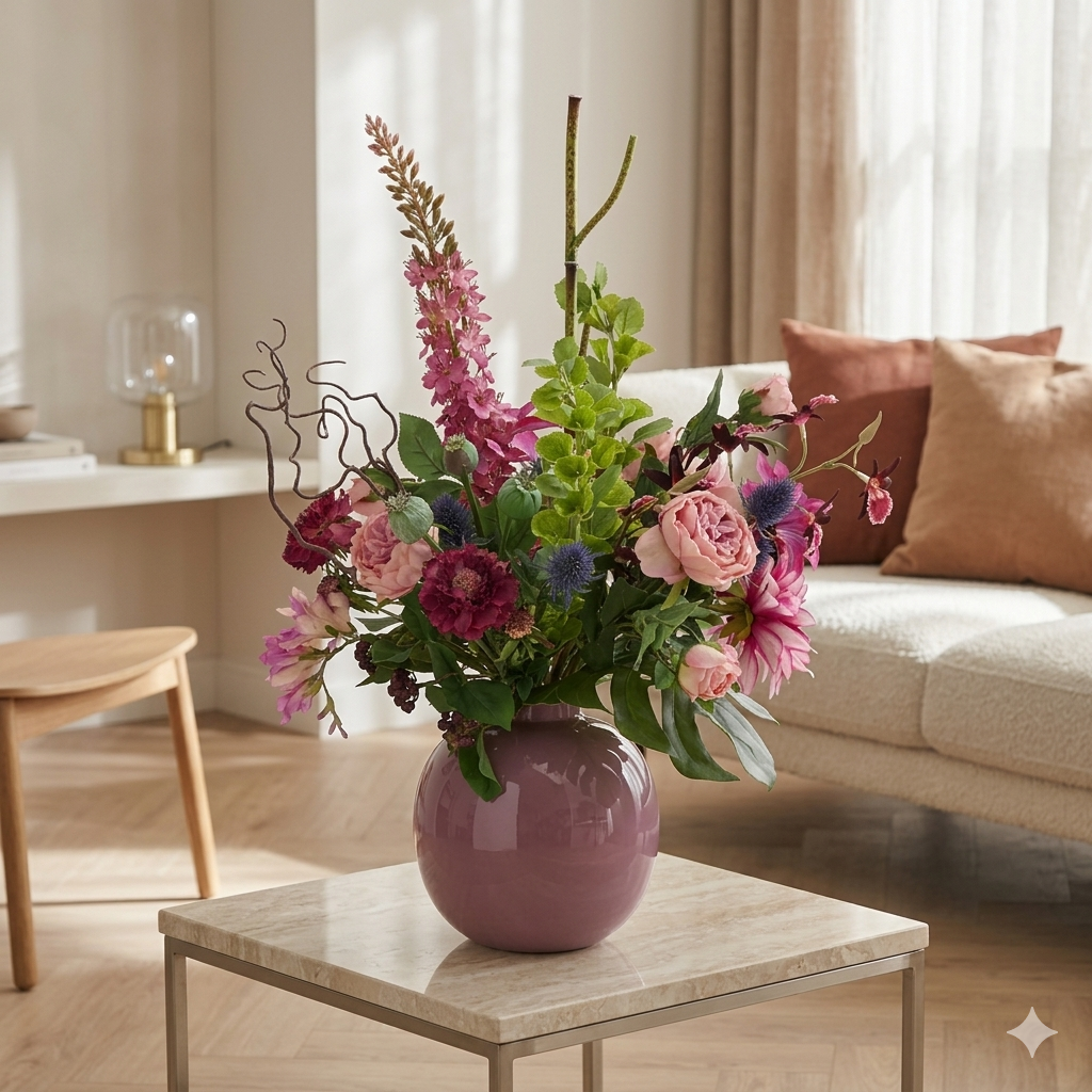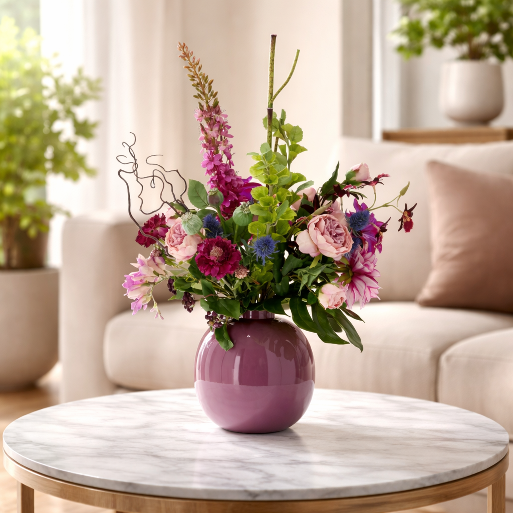 Il Mazzo di Fiori Artificiali Kim Bergamo è una composizione imponente e lussuosa di fiori artificiali, con un’altezza di 75 cm e una larghezza di 60 cm. Questo ampio mazzo nei toni rosa e viola diventa un vero punto focale in qualsiasi ambiente. Orchidee eleganti, rose inglesi raffinate, fresie leggere e dalie voluminose creano un insieme ricco e armonioso. Accenti di scabiosa, clematide ed eremurus aggiungono slancio e raffinatezza, mentre cardi e boccioli di papavero donano un tocco naturale. Questo mazzo di fiori artificiali si adatta perfettamente a interni moderni, eleganti o accoglienti.