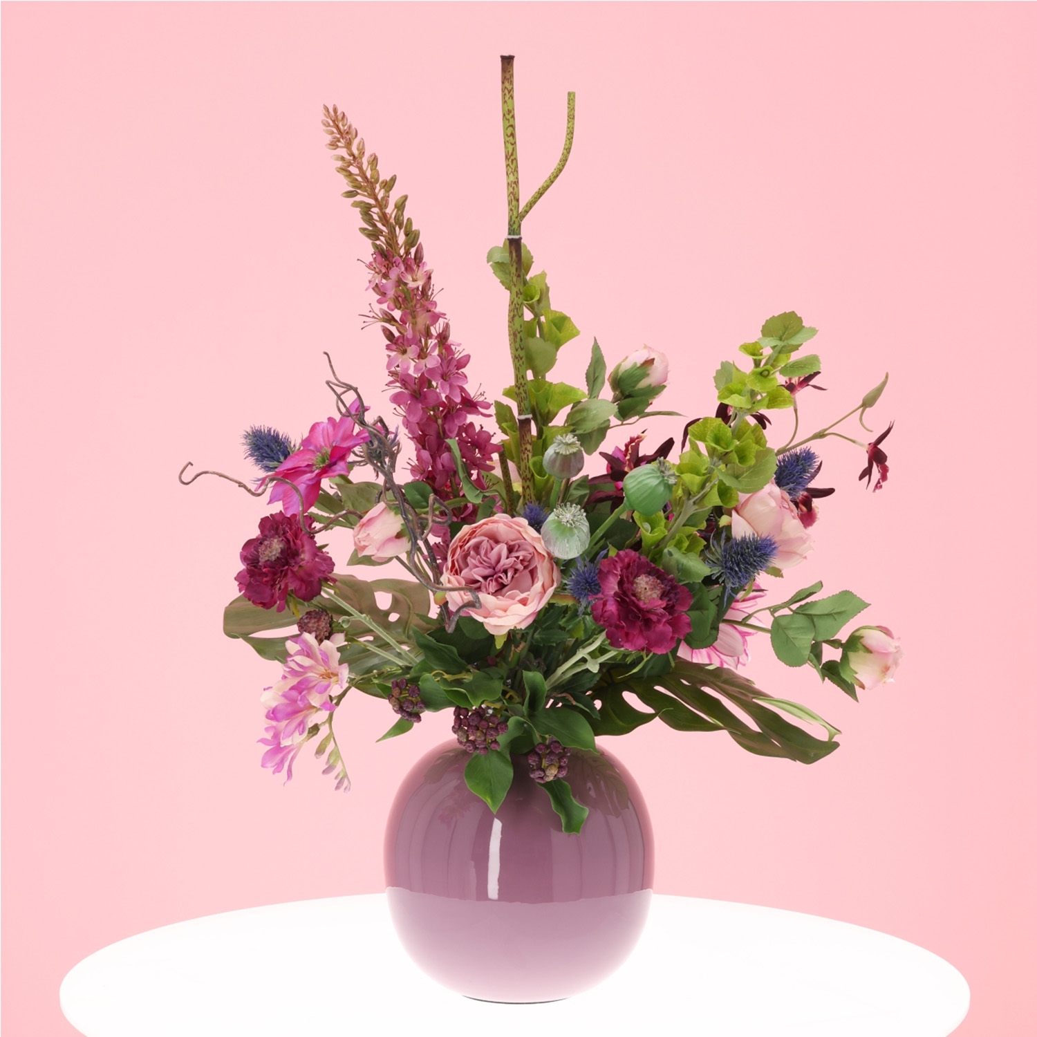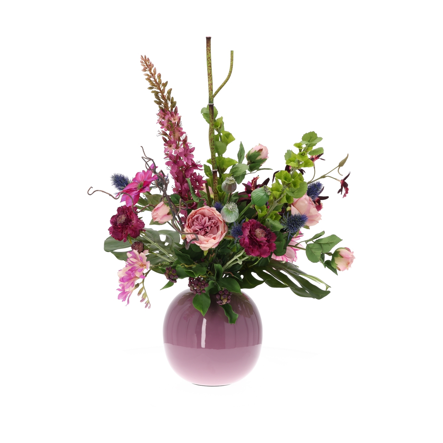 Elementi verdi come foglie di monstera, rami di agrifoglio, polygonum, molucella e rami decorativi di salice apportano equilibrio e profondità. Questo mazzo di fiori in seta è realizzato in seta artificiale di alta qualità, offrendo un aspetto estremamente realistico. Perfetto su un grande tavolo da pranzo, una credenza o un tavolino, ma anche in una hall, in ufficio o su un bancone di ristorante. Attenzione: il mazzo viene fornito senza il vaso mostrato Pip Studio Vase Metal Lilac 23cm.