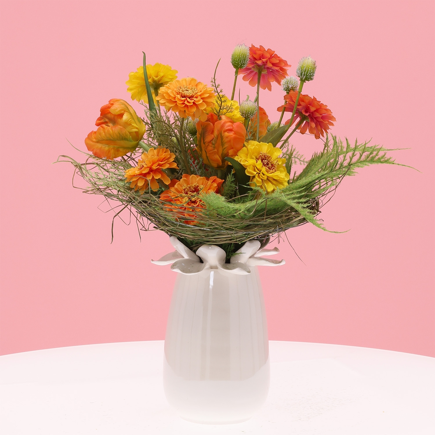 Il Bouquet Artificiale Inge Dordrecht è una composizione raffinata e vivace di fiori artificiali con un’altezza e una larghezza di 35 cm. Questo bouquet artificiale compatto, declinato in diverse tonalità di rosa, trasmette dolcezza ed eleganza, diventando un affascinante punto focale in ogni ambiente. La combinazione di zinnie rosa, tulipani delicati e gomphrena dalla forma sferica dona a questo bouquet di fiori artificiali un aspetto naturale e dinamico. I leggeri rami di asparagus in verde fresco e verde grigiastro aggiungono profondità e movimento. Grazie alle sue sfumature armoniose e alle texture fini, si inserisce perfettamente in interni moderni, romantici o dallo stile accogliente.