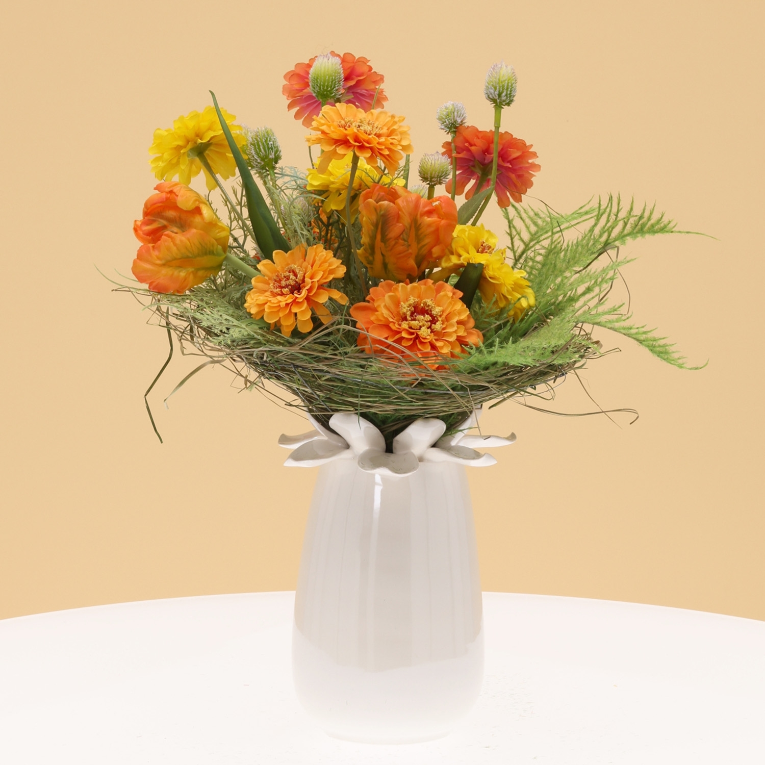 Il Bouquet Artificiale Inge Dordrecht è una composizione calda e vivace di fiori artificiali con un’altezza e larghezza di 35 cm. Questo bouquet artificiale compatto nei toni arancioni e gialli dona immediatamente energia e luminosità all’ambiente. La combinazione di zinnie arancioni, tulipani eleganti e gomphrena color crema crea un insieme naturale e dinamico. I sottili rami di asparagus in verde fresco e verde grigiastro aggiungono profondità e leggerezza a questo bouquet di fiori artificiali. La sua palette calda lo rende ideale per interni moderni, rustici o accoglienti.