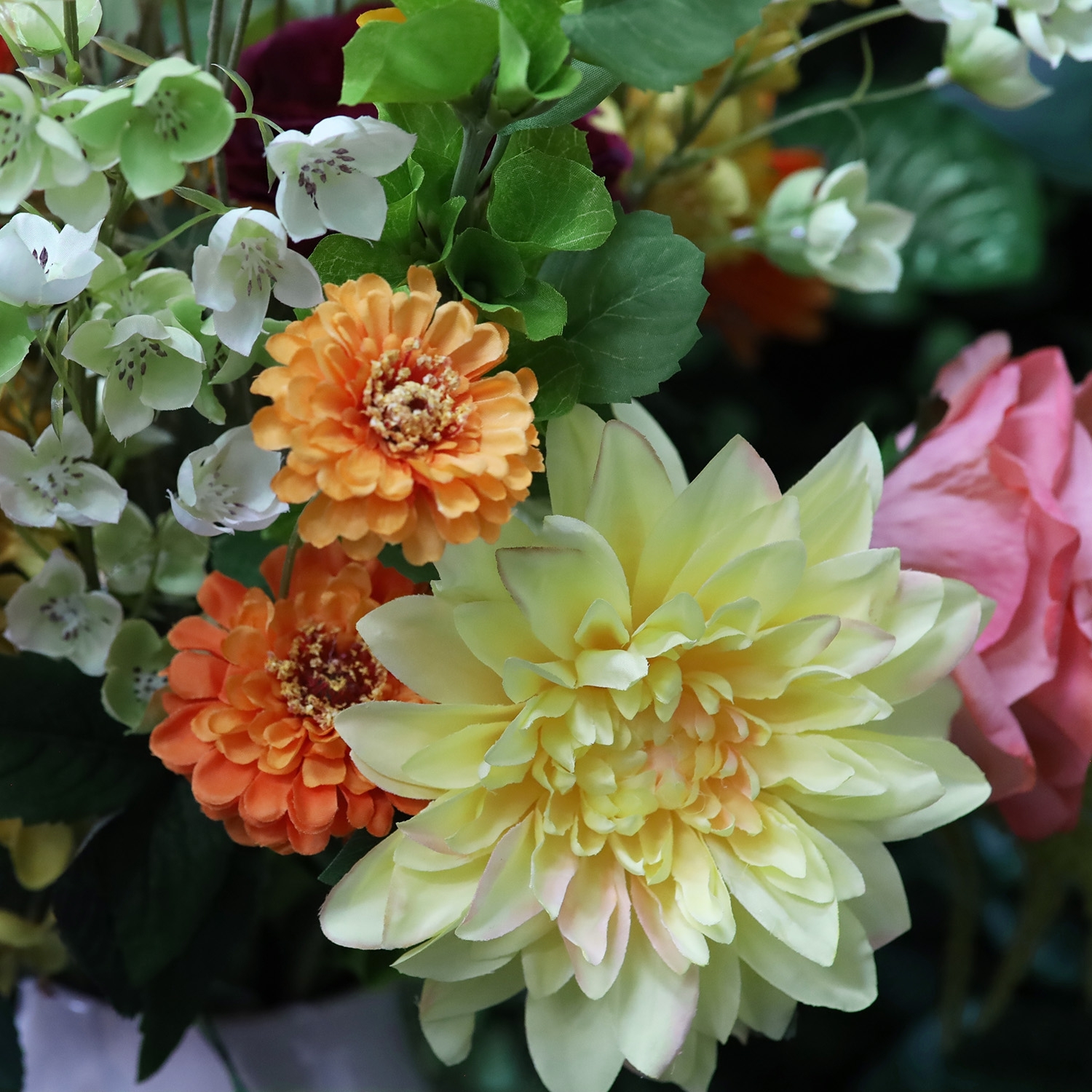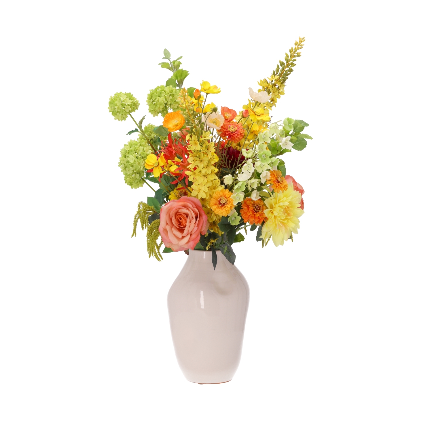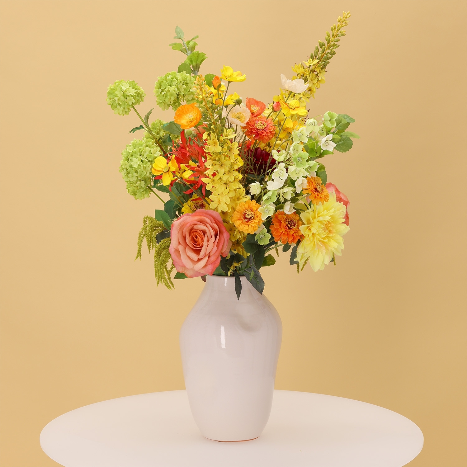 Il Mazzo artificiale Cleopatra Cairo è una composizione scenografica e ricca di colore di fiori artificiali con un’altezza di 80 cm e una larghezza di 65 cm. Questo mazzo artificiale Cleopatra Cairo colpisce per la combinazione armoniosa di tonalità arancioni e gialle calde, verdi freschi e delicati accenti salmone e bordeaux. Nel bouquet trovi, tra gli altri, hibiscus color salmone, eleganti rose, una dalia gialla voluminosa, vivaci zinnie e papaveri arancioni. Ranuncoli bordeaux, leggere cosmee, slanciate eremurus e raffinate nerine aggiungono altezza e dinamismo. Gli accenti verdi di viburnum, campanula, molucella, amaranthus e fogliame decorativo donano al bouquet di fiori artificiali un aspetto naturale e vivace, perfetto per ambienti moderni, lussuosi o accoglienti.
