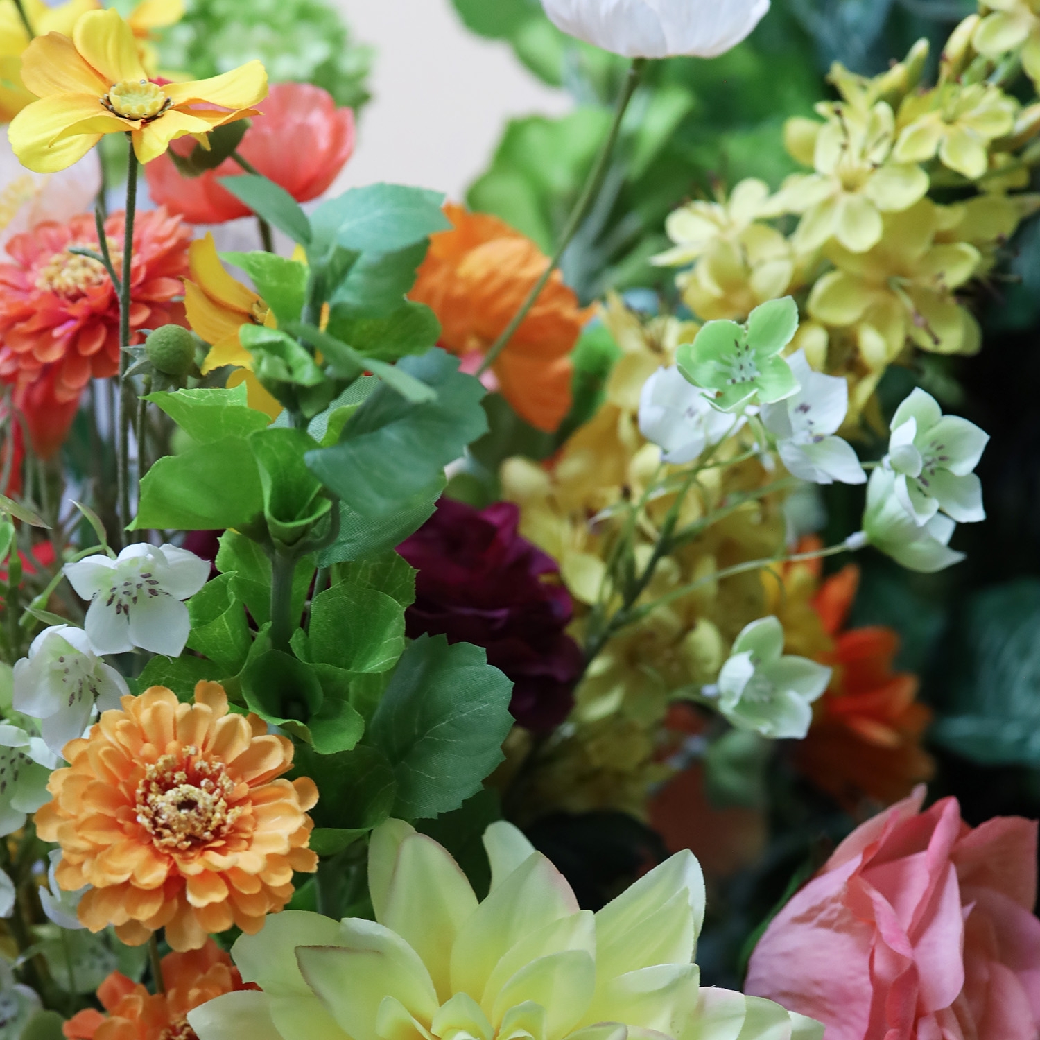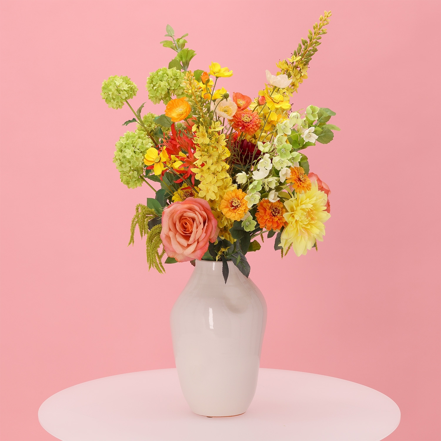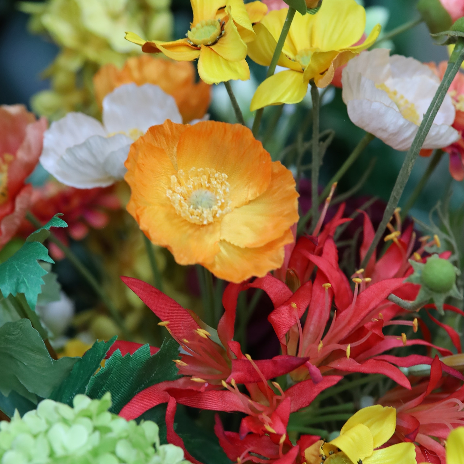 Il Mazzo artificiale Cleopatra Cairo è una composizione scenografica e ricca di colore di fiori artificiali con un’altezza di 80 cm e una larghezza di 65 cm. Questo mazzo artificiale Cleopatra Cairo colpisce per la combinazione armoniosa di tonalità arancioni e gialle calde, verdi freschi e delicati accenti salmone e bordeaux. Nel bouquet trovi, tra gli altri, hibiscus color salmone, eleganti rose, una dalia gialla voluminosa, vivaci zinnie e papaveri arancioni. Ranuncoli bordeaux, leggere cosmee, slanciate eremurus e raffinate nerine aggiungono altezza e dinamismo. Gli accenti verdi di viburnum, campanula, molucella, amaranthus e fogliame decorativo donano al bouquet di fiori artificiali un aspetto naturale e vivace, perfetto per ambienti moderni, lussuosi o accoglienti.