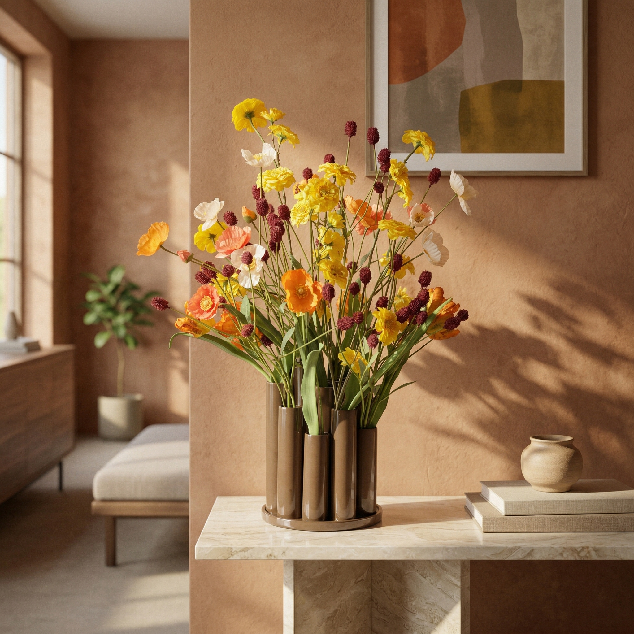 Il Mazzo di Fiori Artificiali Jenae Jackson 65 cm con Vaso Twisted Tube è una composizione luminosa e di grande effetto con un’altezza di 65 cm e una larghezza di 55 cm. Questo mazzo artificiale dona immediatamente calore ed energia grazie alla ricca combinazione di tonalità gialle e arancioni. L’arrangiamento include tulipani arancioni, eleganti zinnie gialle, papaveri leggeri nelle sfumature crema e arancio e decorative sfere di gomphrena color bordeaux. L’unione di fiori aperti e steli slanciati crea una silhouette dinamica e naturale, perfetta per un ambiente moderno, accogliente o contemporaneo.