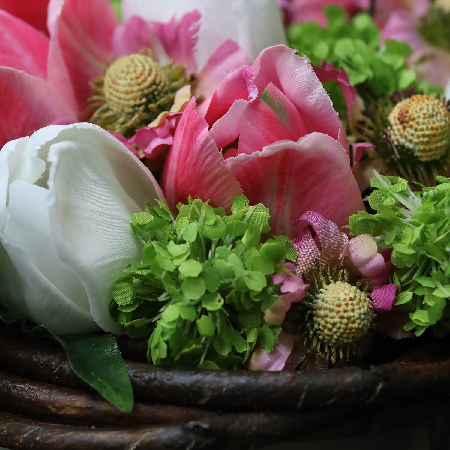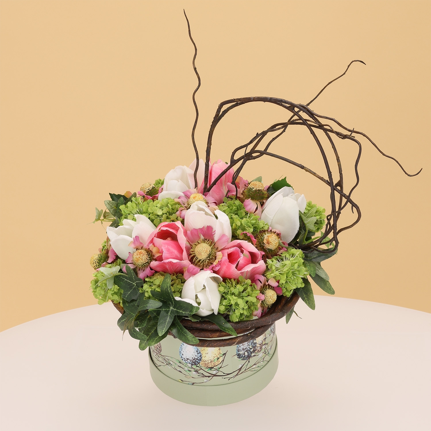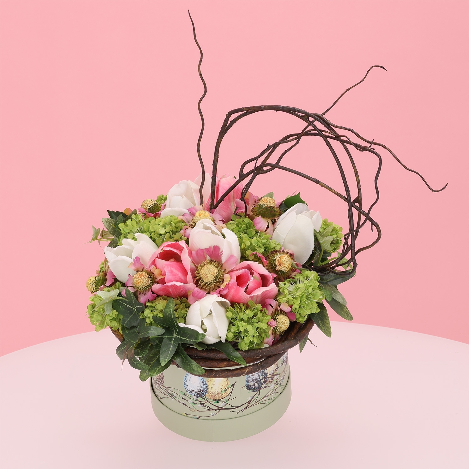 La Flower Gift Box Elli Aalsmeer è una composizione raffinata e affascinante di fiori artificiali, presentata con eleganza in una scatola decorativa alta 35 cm e larga 26 cm. Questa Flower Gift Box unisce delicate tonalità di rosa, crema e verde fresco in un insieme armonioso. La combinazione di tulipani eleganti rosa e crema, vivaci helenium e viburnum voluminoso dona un aspetto naturale e luminoso. Accenti verdi di edera e rami decorativi di salice aggiungono profondità e movimento a questo bouquet di fiori artificiali. Grazie alle dimensioni compatte, è perfetto per il tavolo da pranzo, una consolle o come dettaglio accogliente in un’area reception.