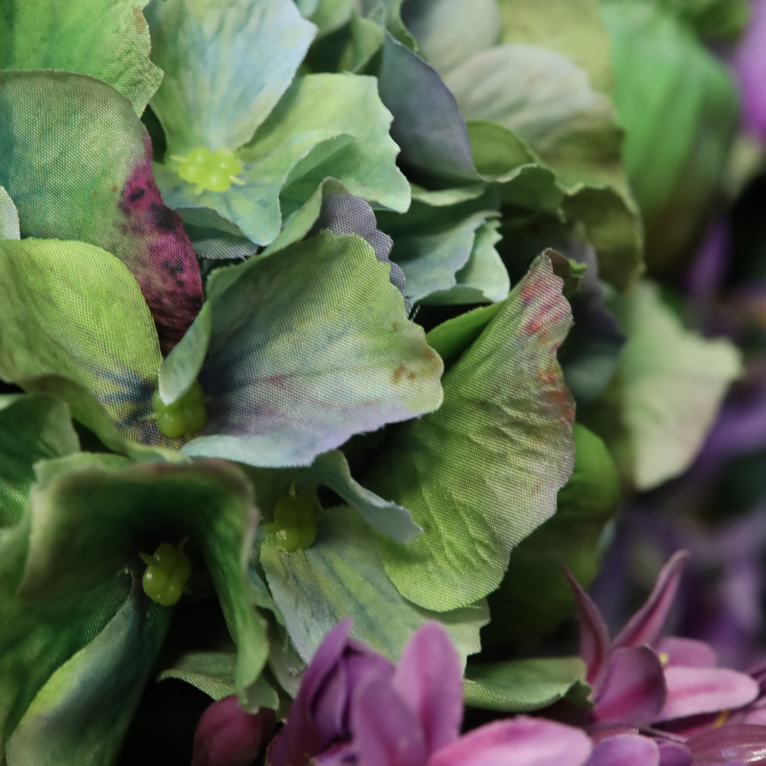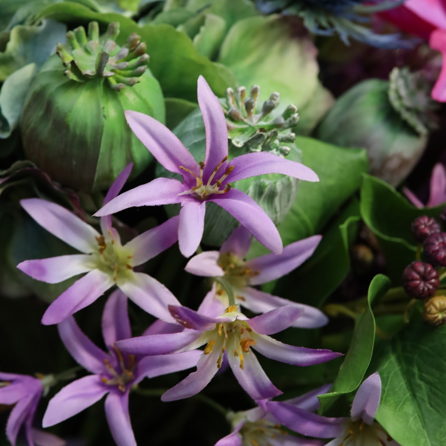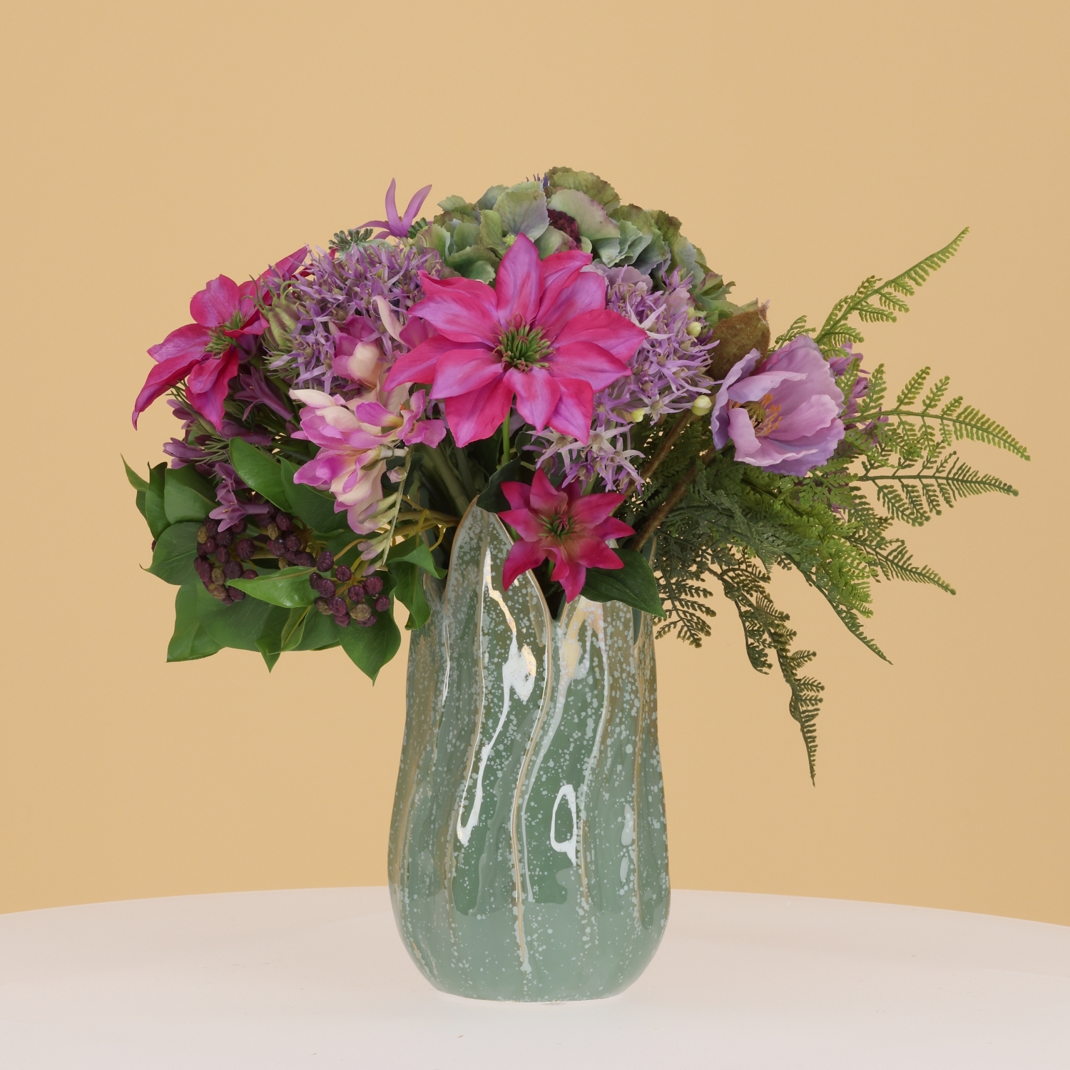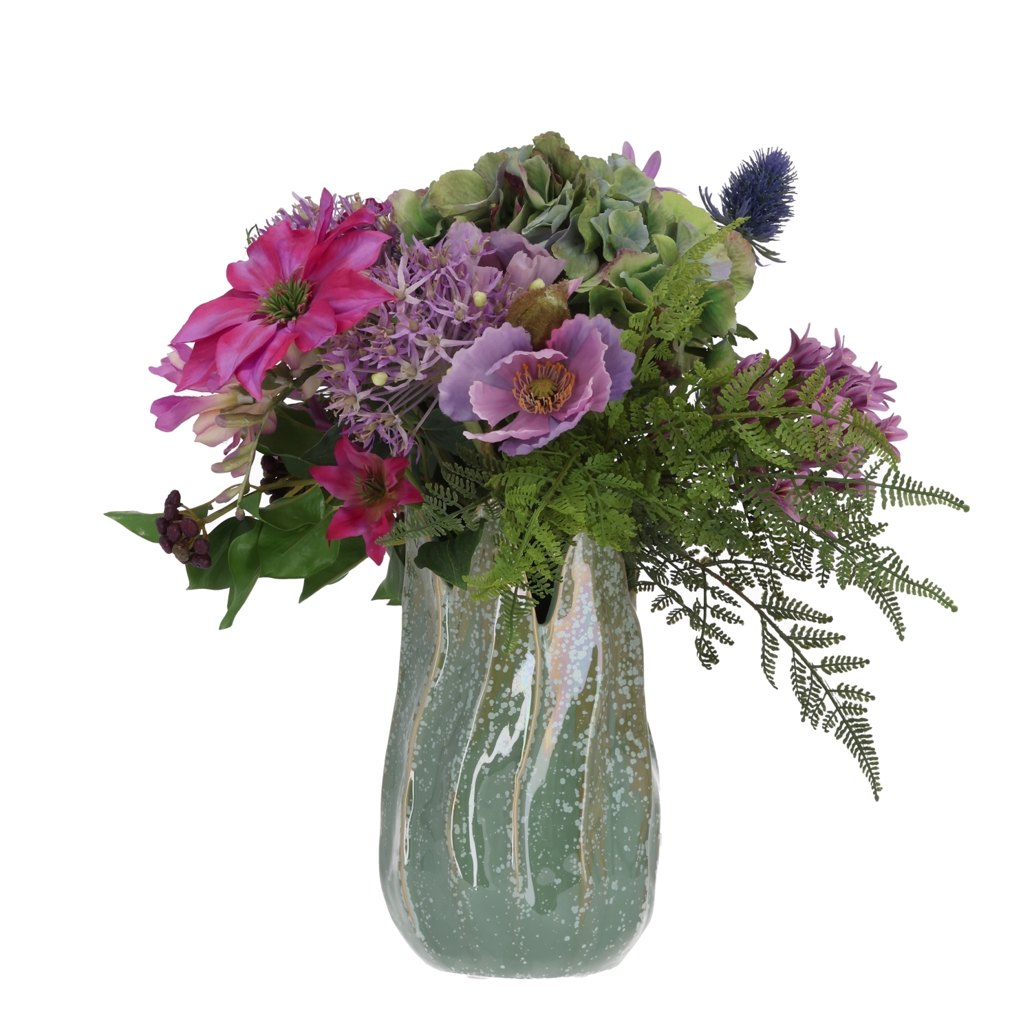 Il Mazzo di fiori artificiali Britt Gent 40 cm è un elegante bouquet artificiale dall'aspetto naturale che dona immediatamente colore e atmosfera al tuo ambiente. La combinazione di tonalità viola, delicati accenti lilla e foglie verde fresco crea un insieme armonioso e raffinato. In questo bouquet di fiori artificiali trovi, tra gli altri, ortensie, campanule, papaveri, allium, fresie, clematidi e agapanthus, arricchiti da dettagli decorativi come cardi, boccioli di nigella e leggere felci decorative. Tutti questi elementi formano un bouquet ricco e vivace che risalta perfettamente su un tavolo da pranzo, una credenza, un tavolino o su un bancone in un ingresso o in un ufficio.