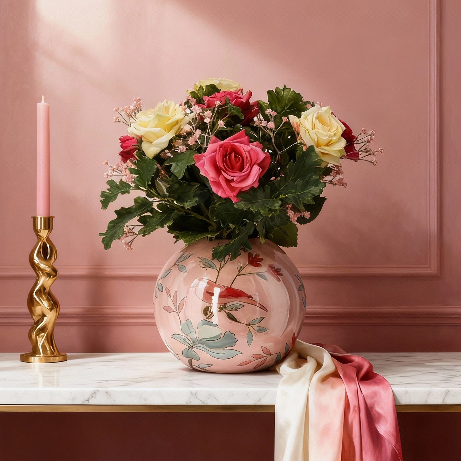 Il Mazzo di Fiori Artificiali Legato a Mano Olivia Göteborg è una composizione romantica e delicata dai toni pastello, perfetta sia per ambienti moderni che classici. Con un'altezza e una larghezza di 40 cm, questo mazzo artificiale compatto si adatta perfettamente a tavolini, consolle o reception, aggiungendo un tocco di eleganza. L’abbinamento di rose artificiali rosa e crema, rami di gypsofila e foglie di quercia realistiche crea un effetto naturale e accogliente.