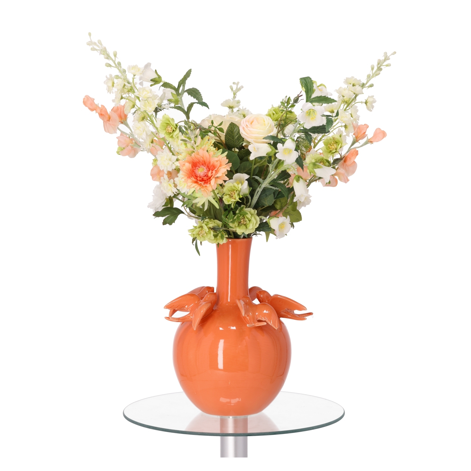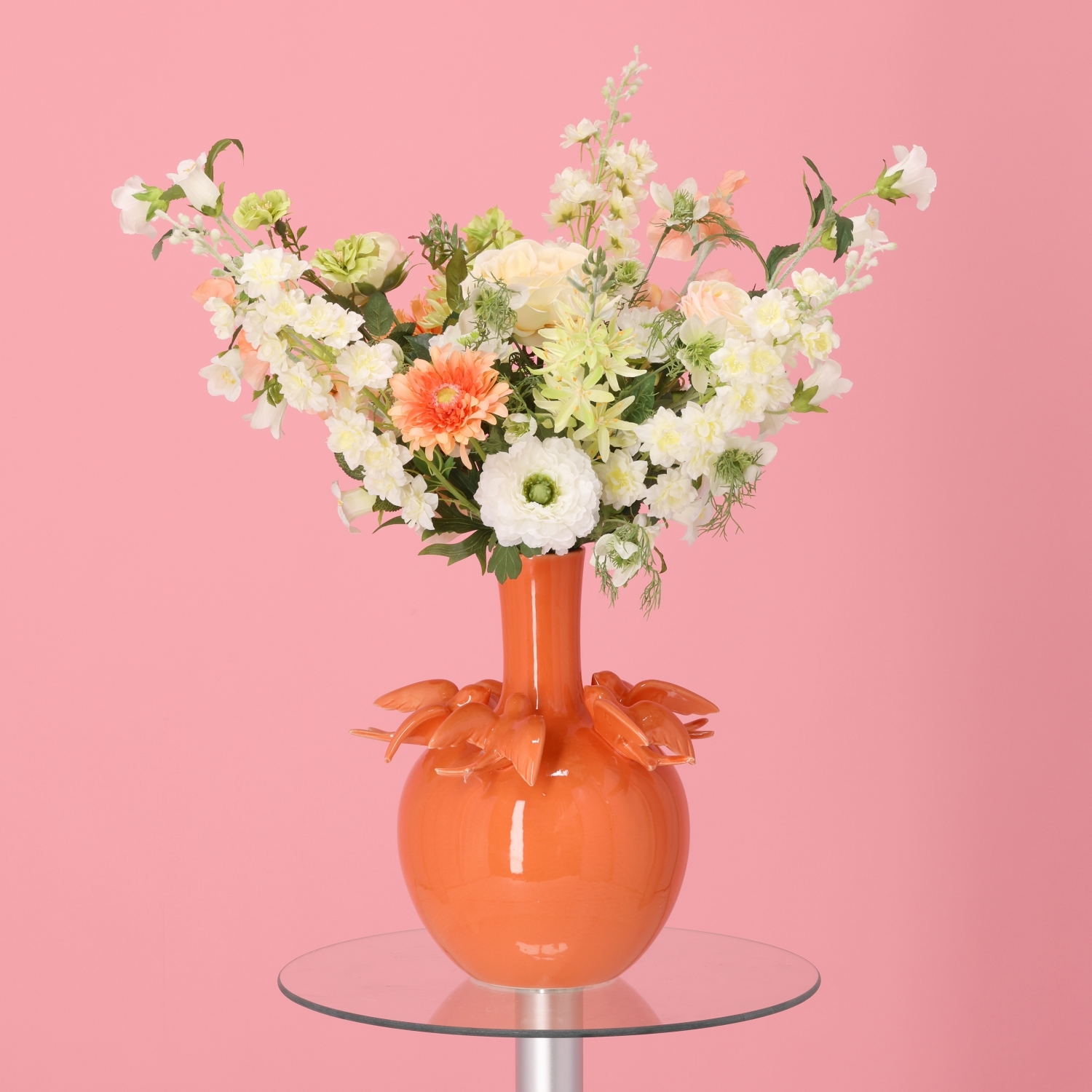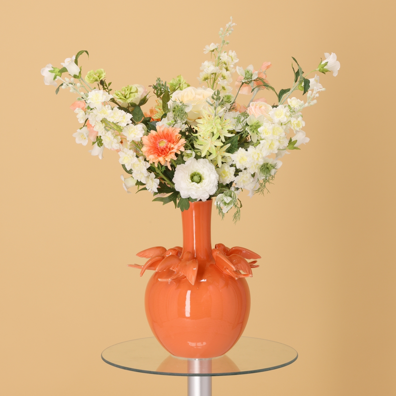 Grazie a materiali di alta qualità, questo mazzo artificiale legato a mano ha un aspetto estremamente realistico e rimane bello per molti anni. Non appassisce, mantiene il colore ed è totalmente privo di manutenzione – sempre in fiore senza bisogno d’acqua o cure. Una fusione perfetta di lusso e praticità. Nota: il vaso mostrato (Bolvaas Zwaluwen ceramica D25xH32 arancione) non è incluso ed è disponibile separatamente.