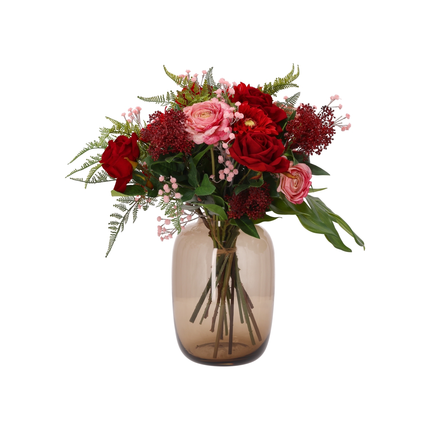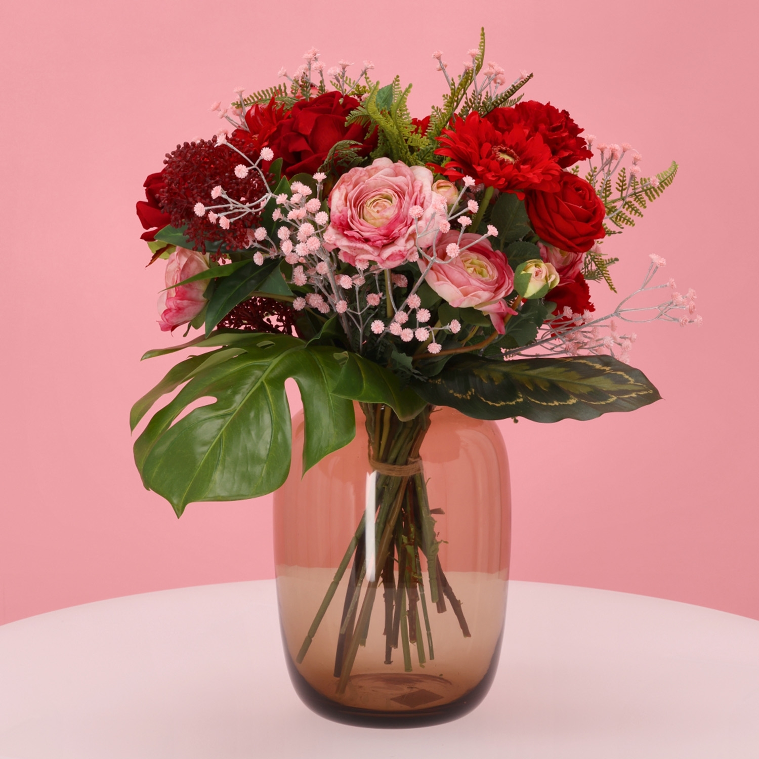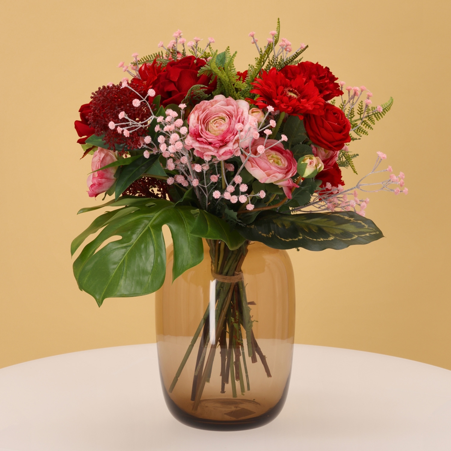 Il Mazzo di Fiori Artificiali Vivia Evora legato a mano è un elegante mazzo artificiale con un’altezza di 45 cm e una larghezza di circa 40 cm. Questa composizione floreale curata nei dettagli si distingue per le calde tonalità rosse e rosa e per l’aspetto nat