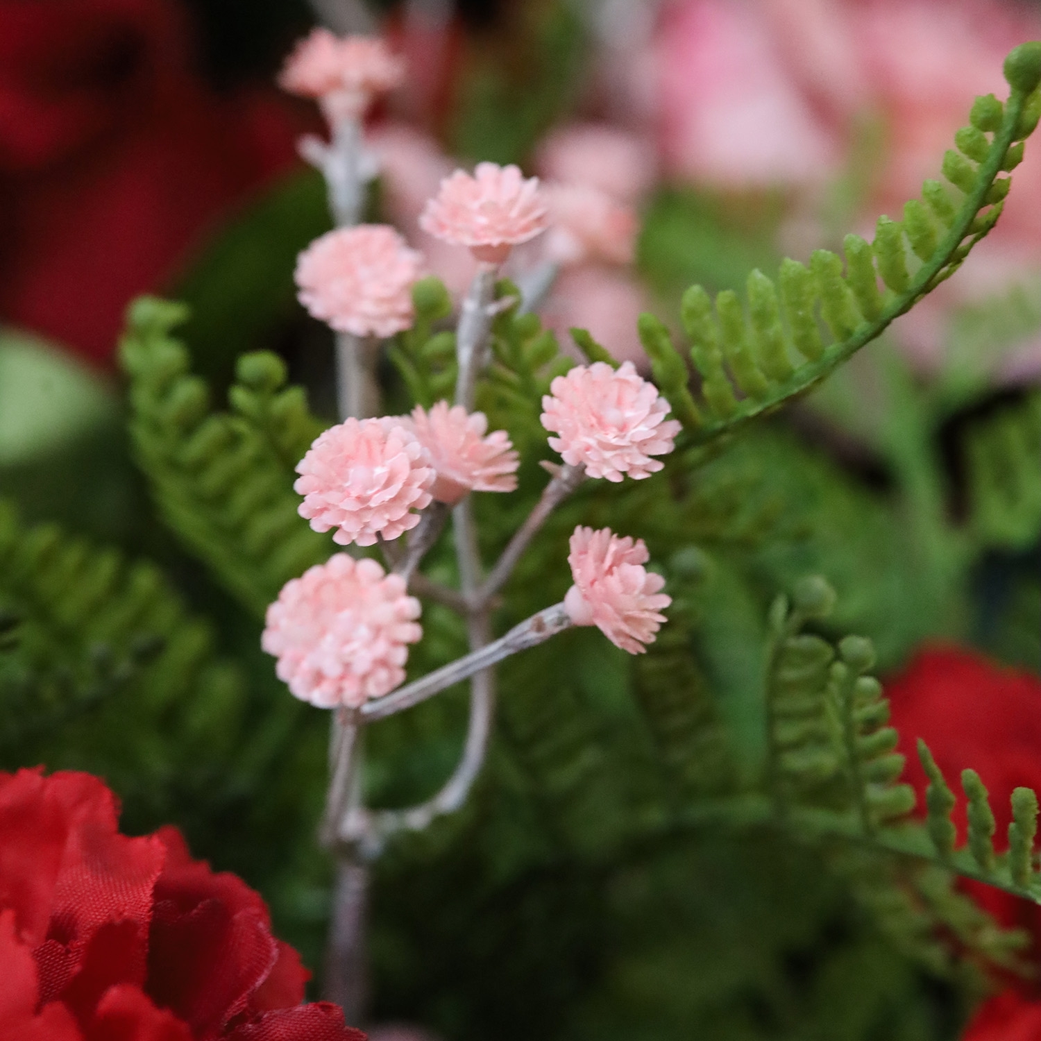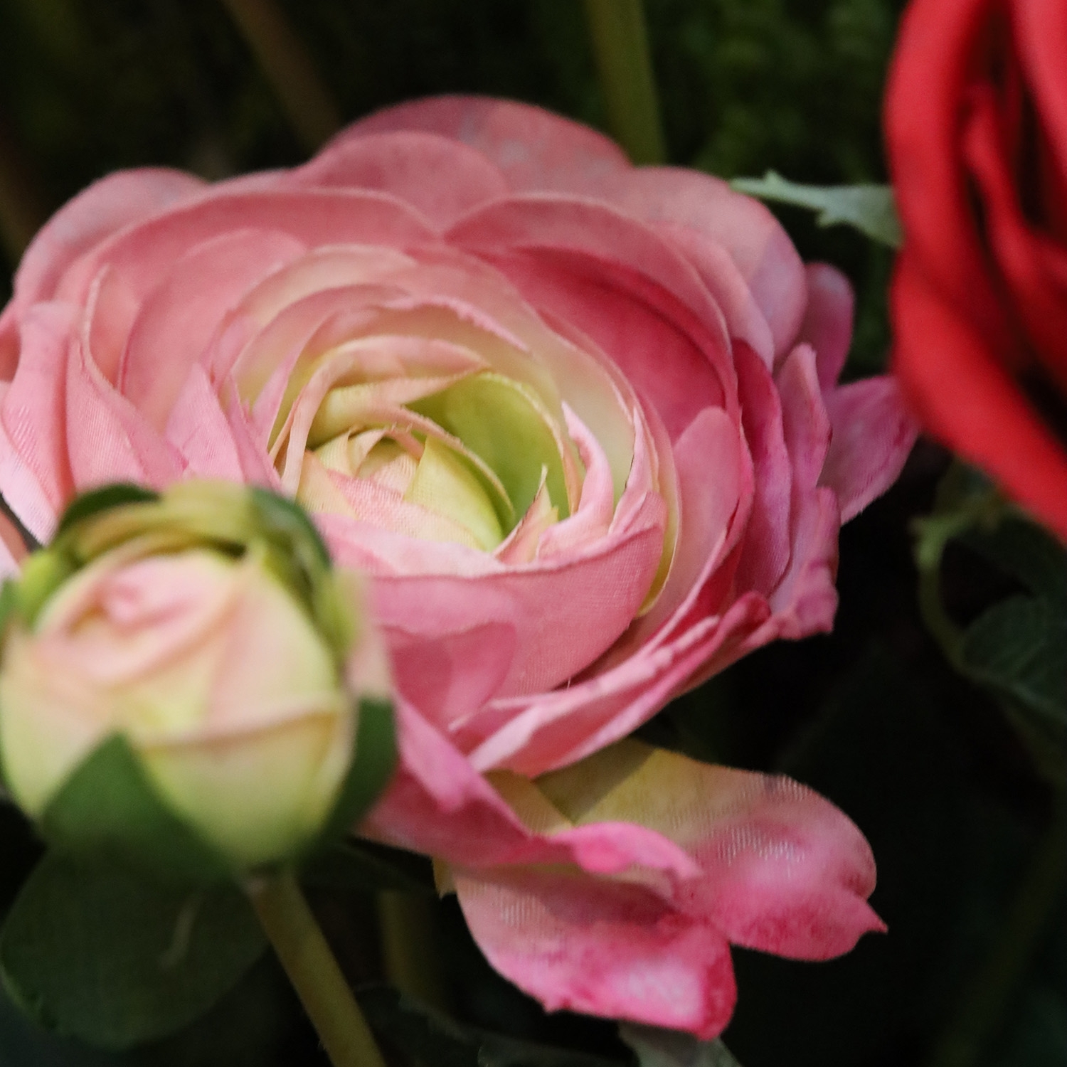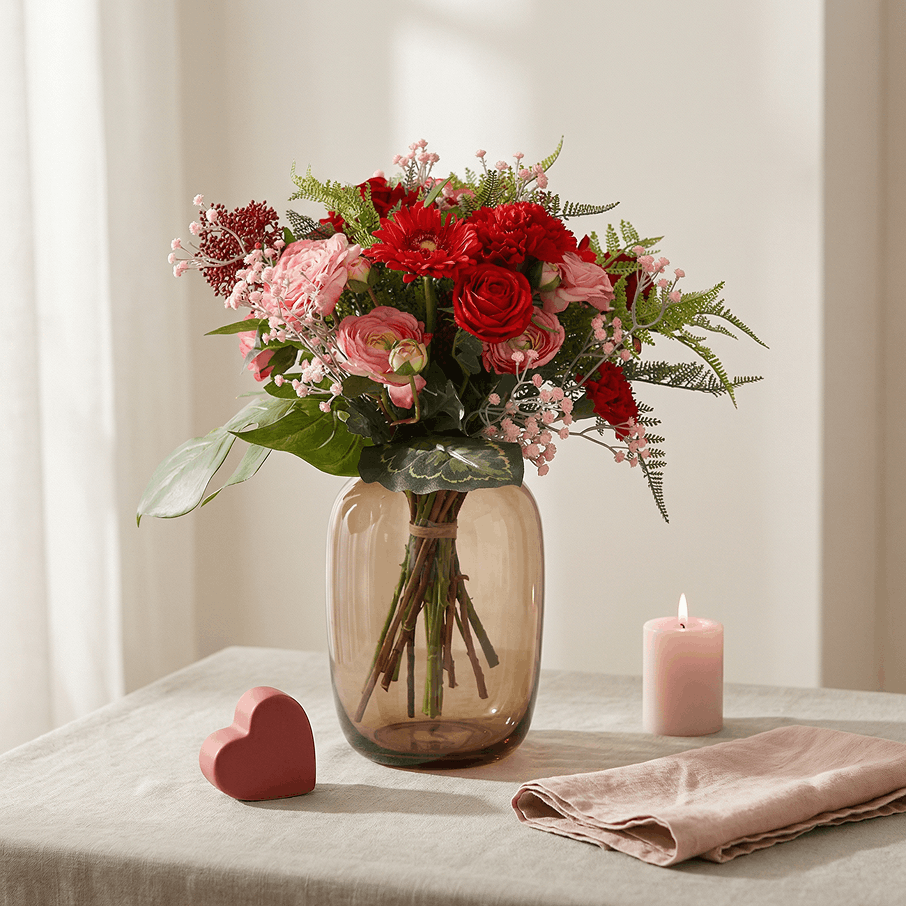 Il Mazzo di Fiori Artificiali Vivia Evora legato a mano è un elegante mazzo artificiale con un’altezza di 45 cm e una larghezza di circa 40 cm. Questa composizione floreale curata nei dettagli si distingue per le calde tonalità rosse e rosa e per l’aspetto nat