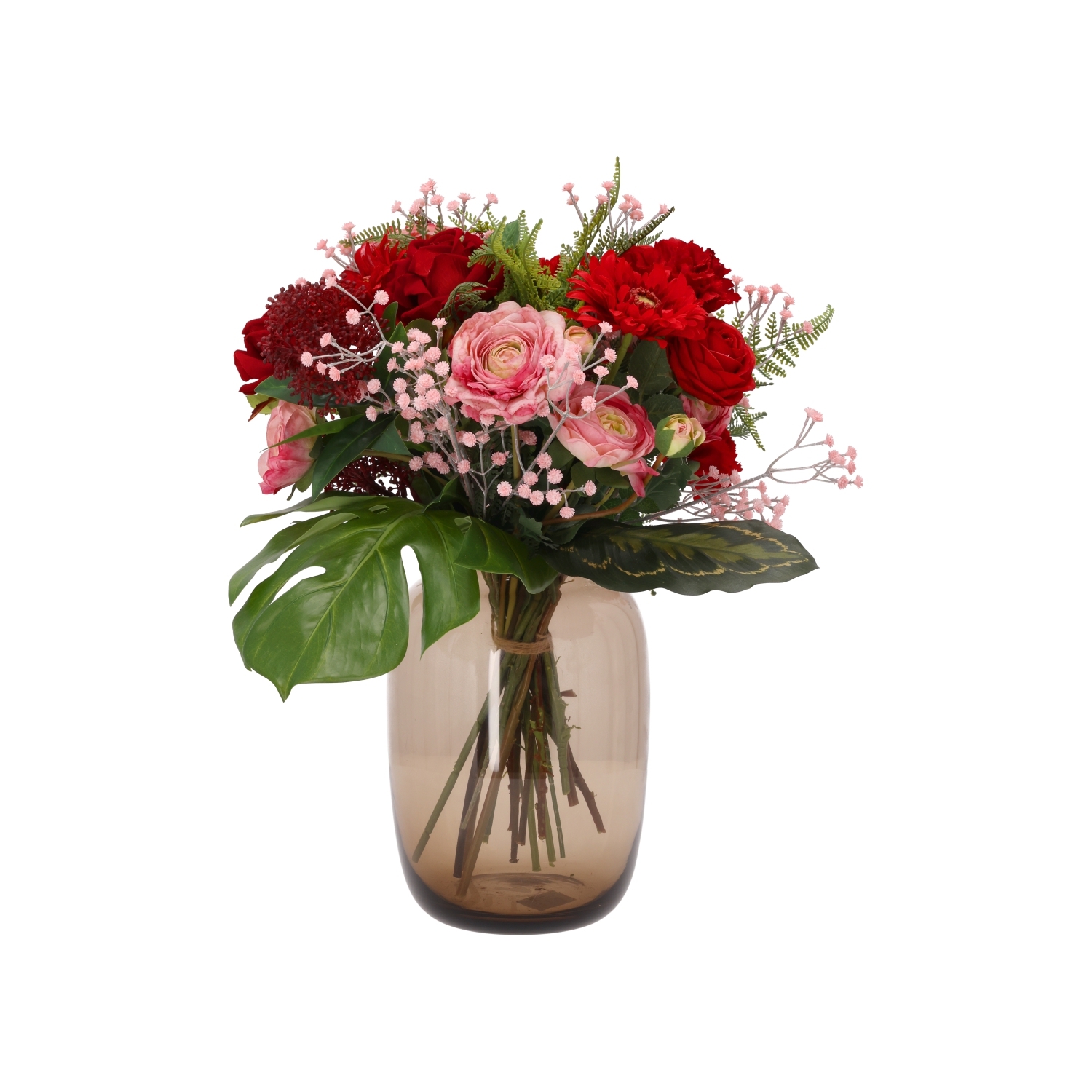 Il Mazzo di Fiori Artificiali Vivia Evora legato a mano è un elegante mazzo artificiale con un’altezza di 45 cm e una larghezza di circa 40 cm. Questa composizione floreale curata nei dettagli si distingue per le calde tonalità rosse e rosa e per l’aspetto naturale e raffinato. Il mazzo include, tra gli altri fiori, garofani, gerbere, rose, ranuncoli e delicata gypsophila, arricchiti da elementi verdi decorativi come monstera e felce. I fiori sono realizzati in seta artificiale di alta qualità, rendendo questo mazzo di fiori in seta realistico e completamente privo di manutenzione.
