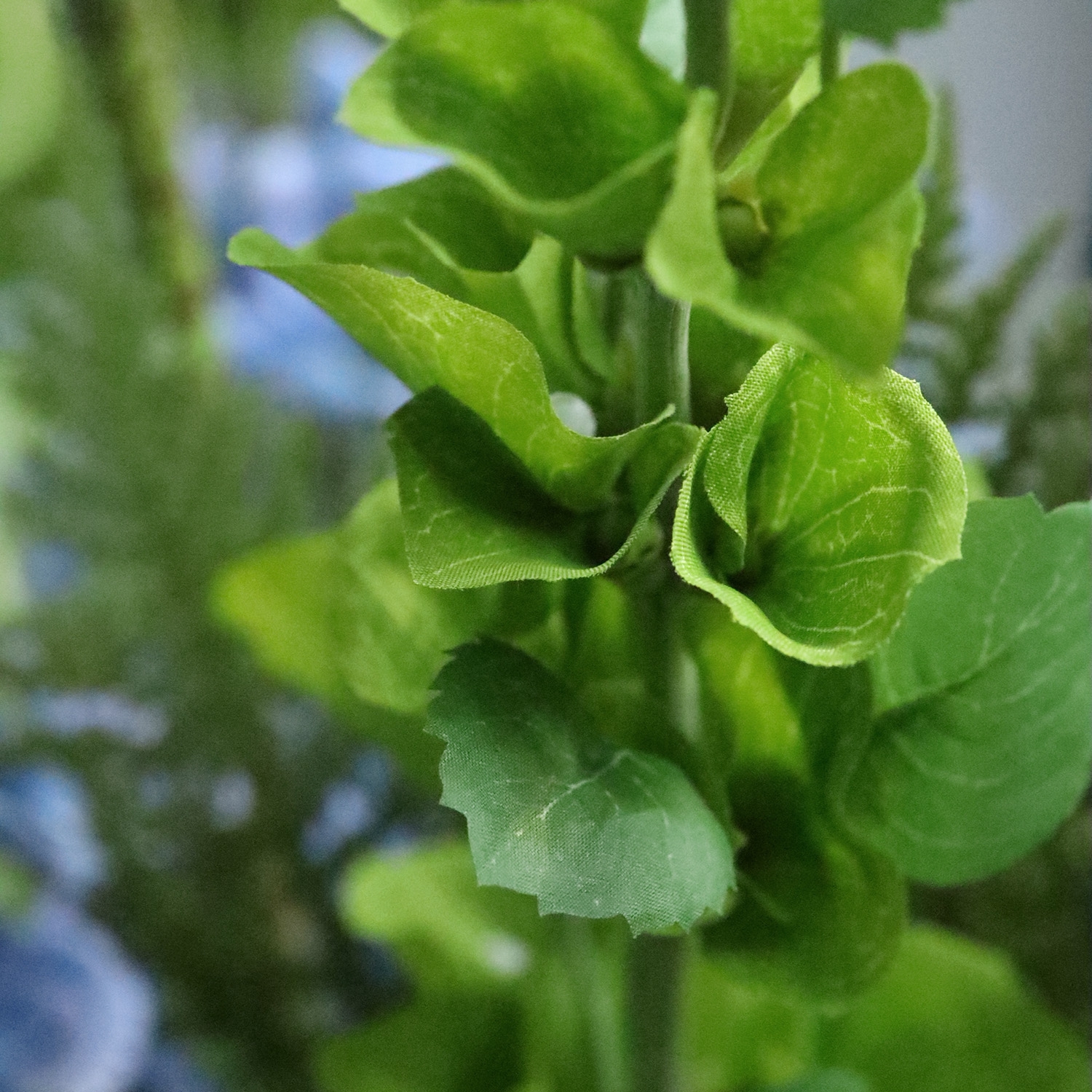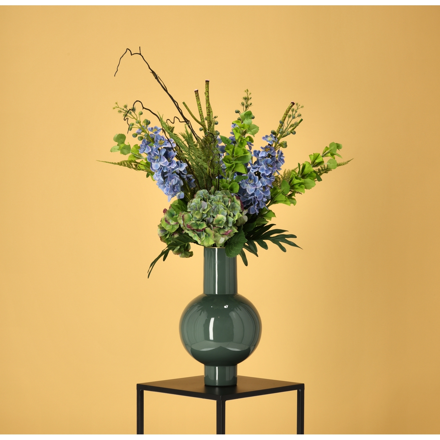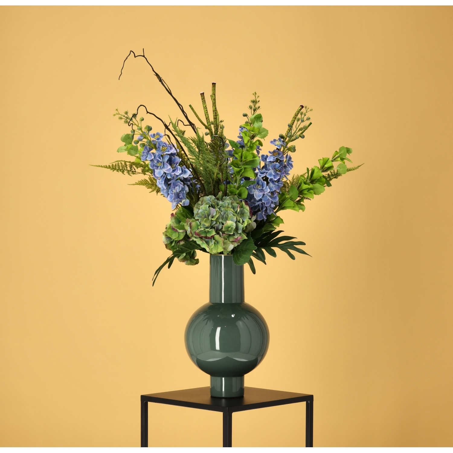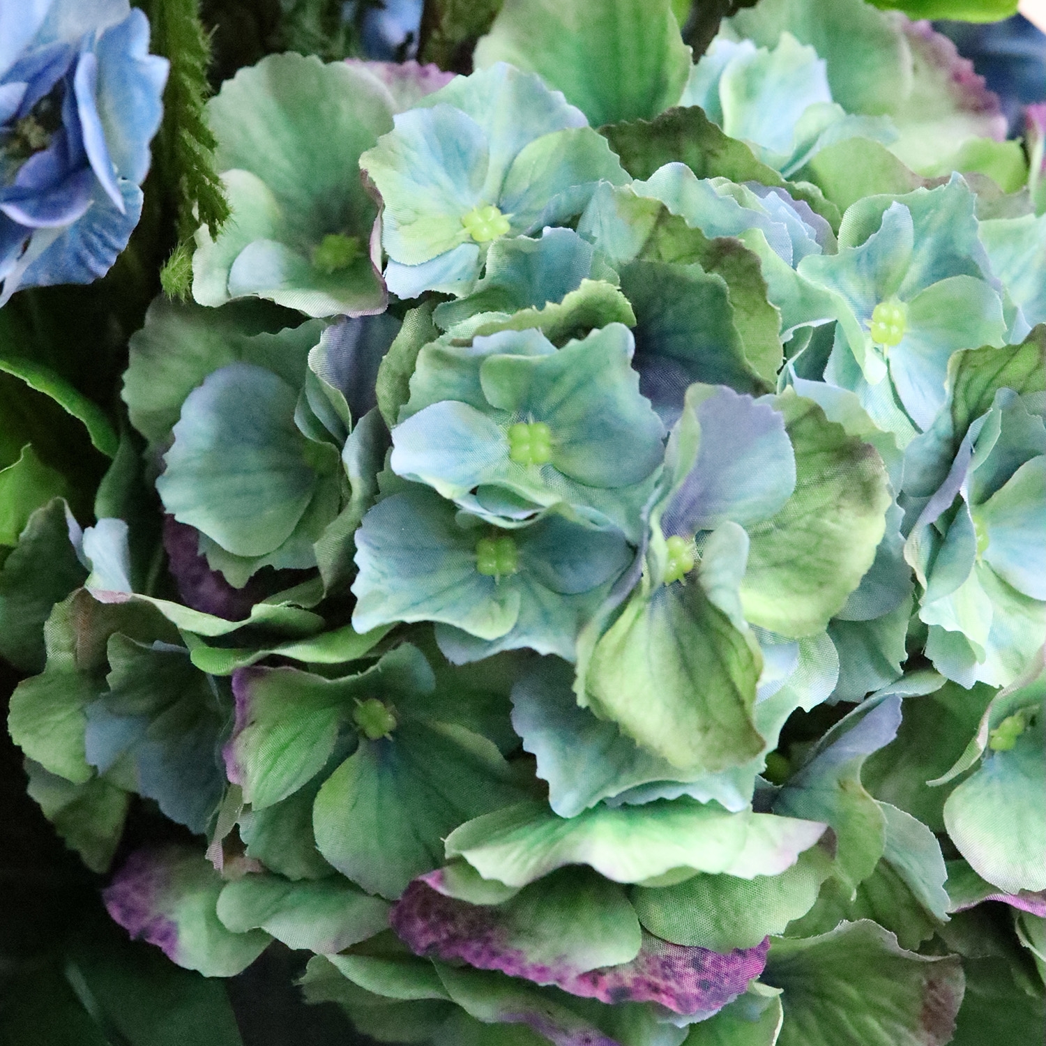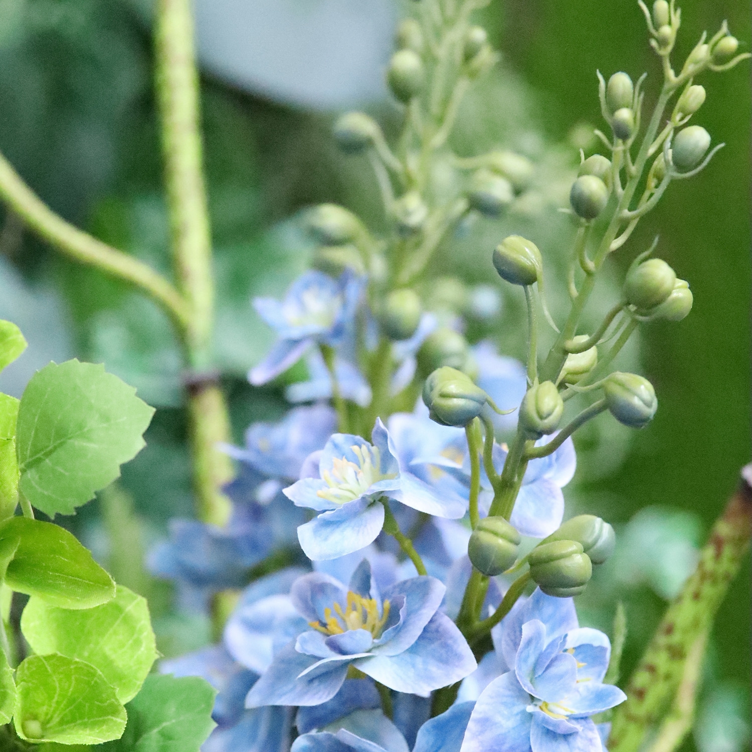 Il Mazzo di Fiori Artificiali Legato a Mano Yara Portland – Blu è una composizione elegante e di grande effetto, alta 90 cm e larga 65 cm. Questo bouquet di ortensie blu è perfetto per donare un tocco naturale e sofisticato agli ambienti moderni. L’unione di Delphinium artificiale blu, ortensie verdi e rami decorativi come Philo Xanadu, Asparago e Salice crea un effetto ricco di texture e volume visivo.